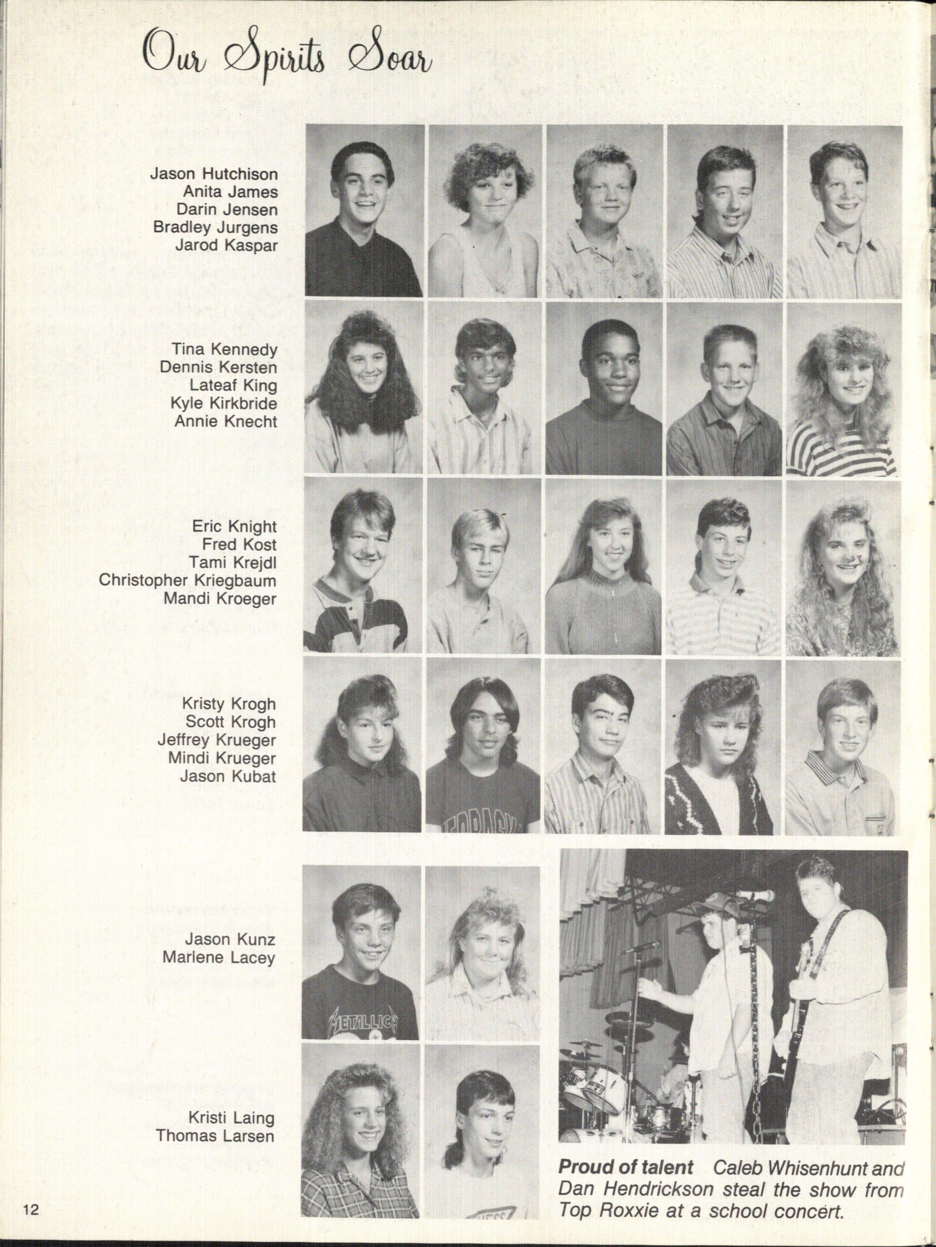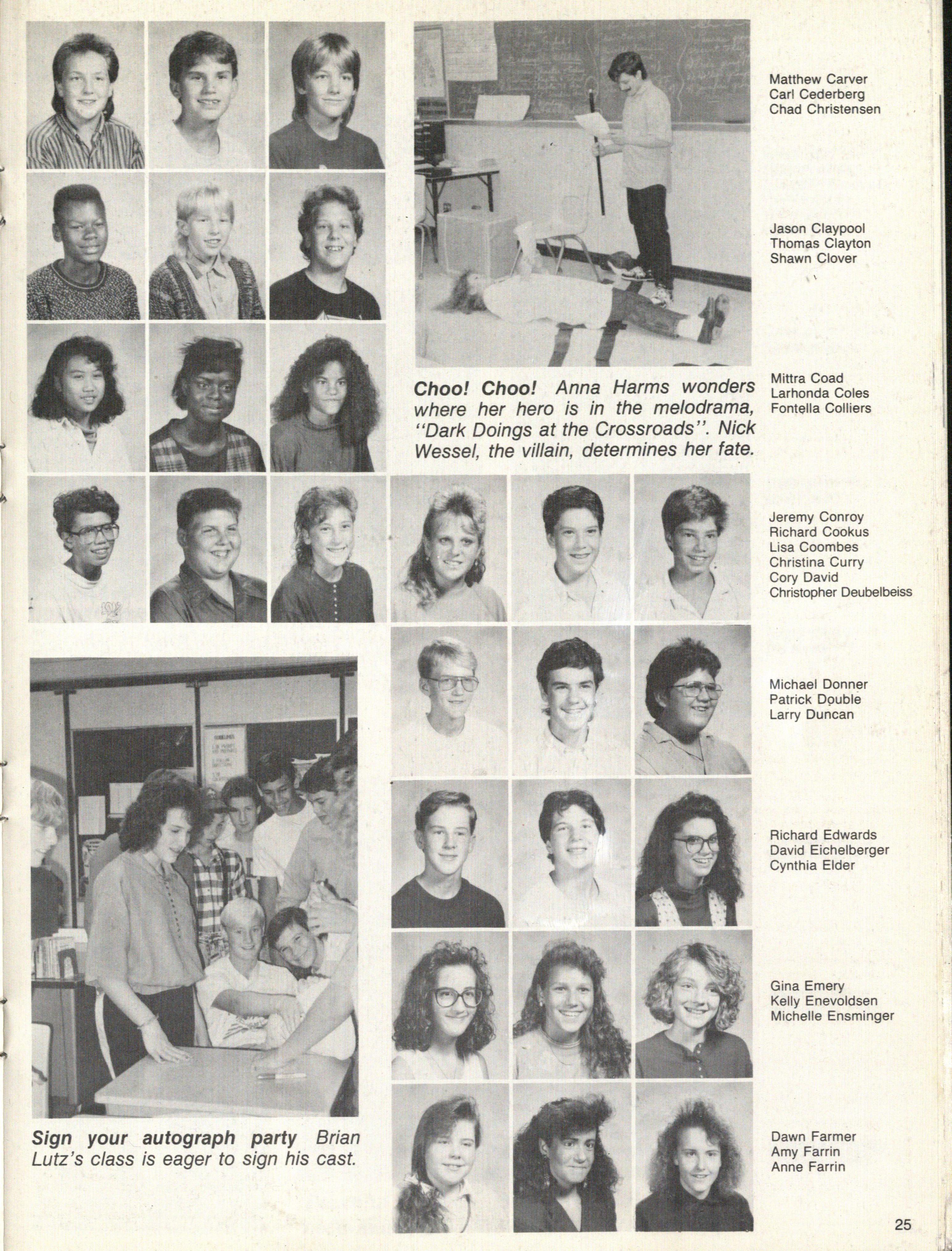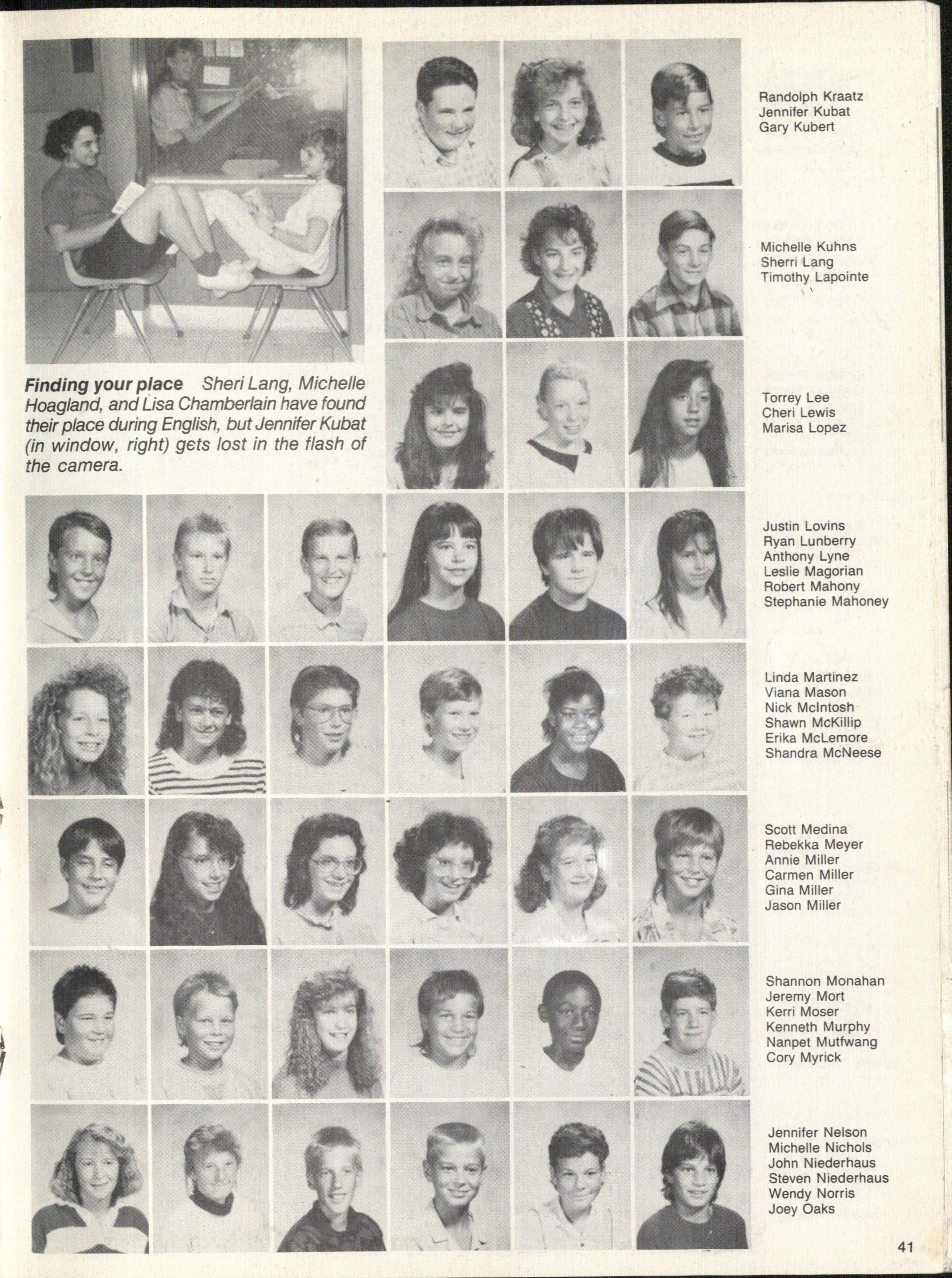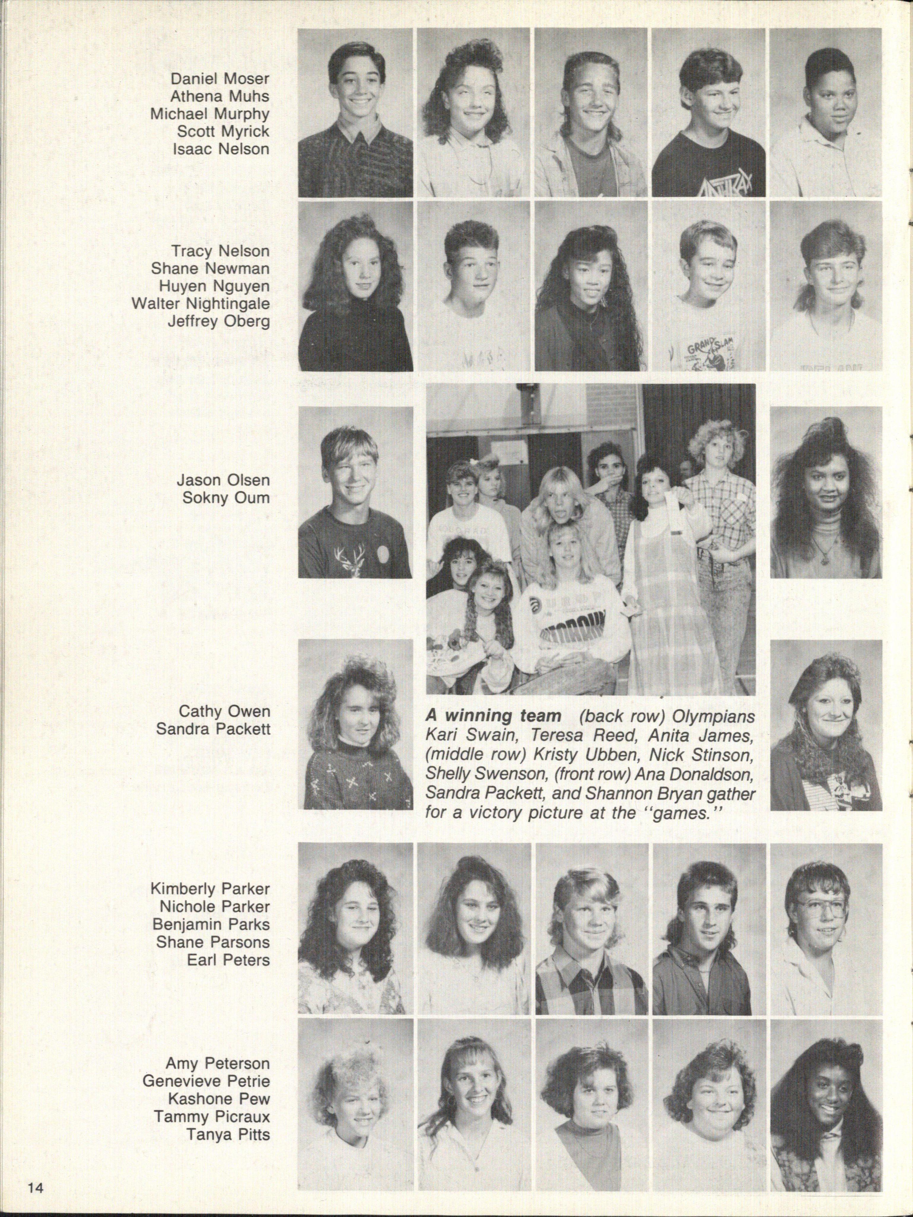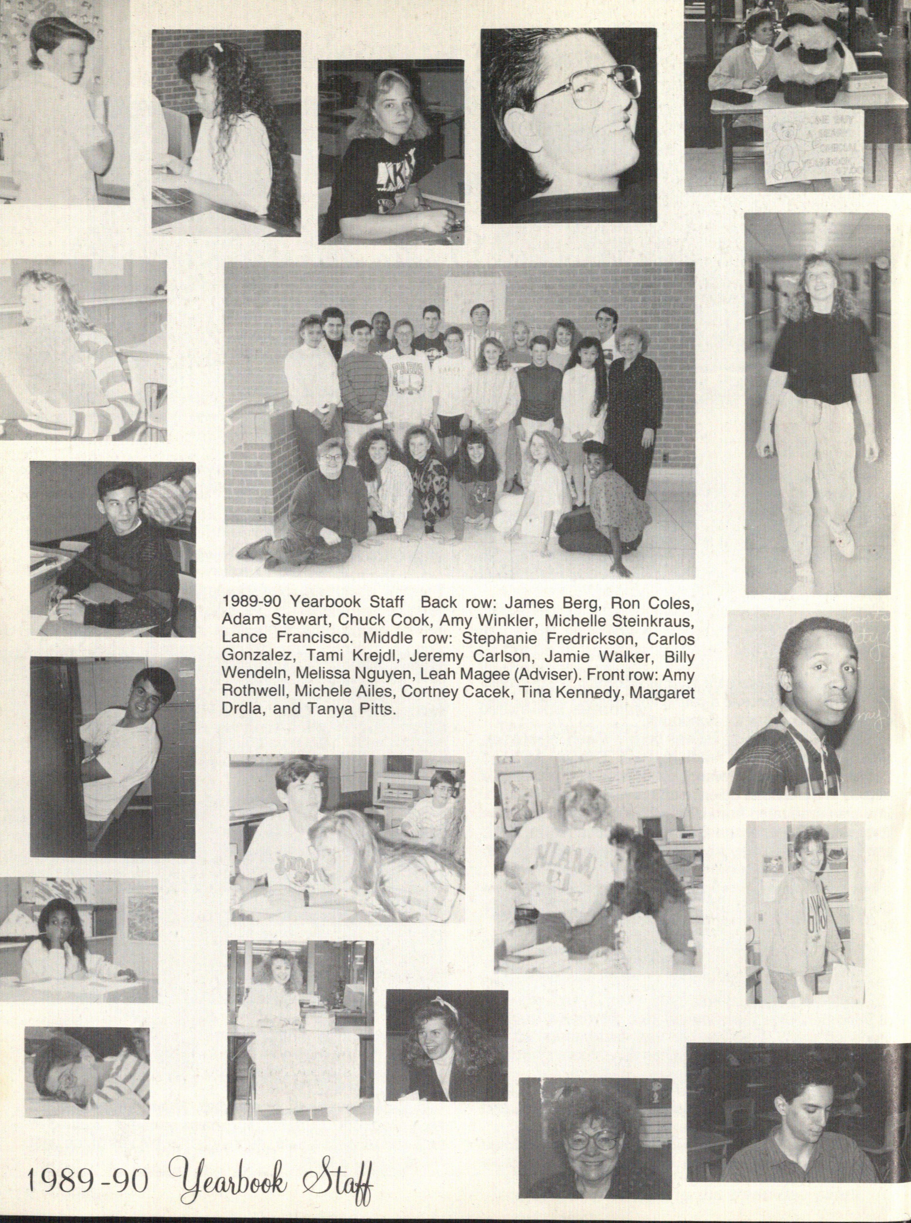 1989-90 Yearbook Staff Back row: James Berg, Ron Coles, Adam Stewart, Chuck Cook, Amy Winkler, Michelle Steinkraus, Lance Francisco. Middle row: Stephanie Fredrickson, Carlos Gonzalez, Tami Krejdl, Jeremy Carlson, Jamie Walker, Billy Wendeln, Melissa Nguyen, Leah Magee (Adviser). Front row: Amy Rothwell, Michele Ailes, Cortney Cacek, Tina Kenn.edy, Mar.garet Drdla, and Tanya Pitts.
