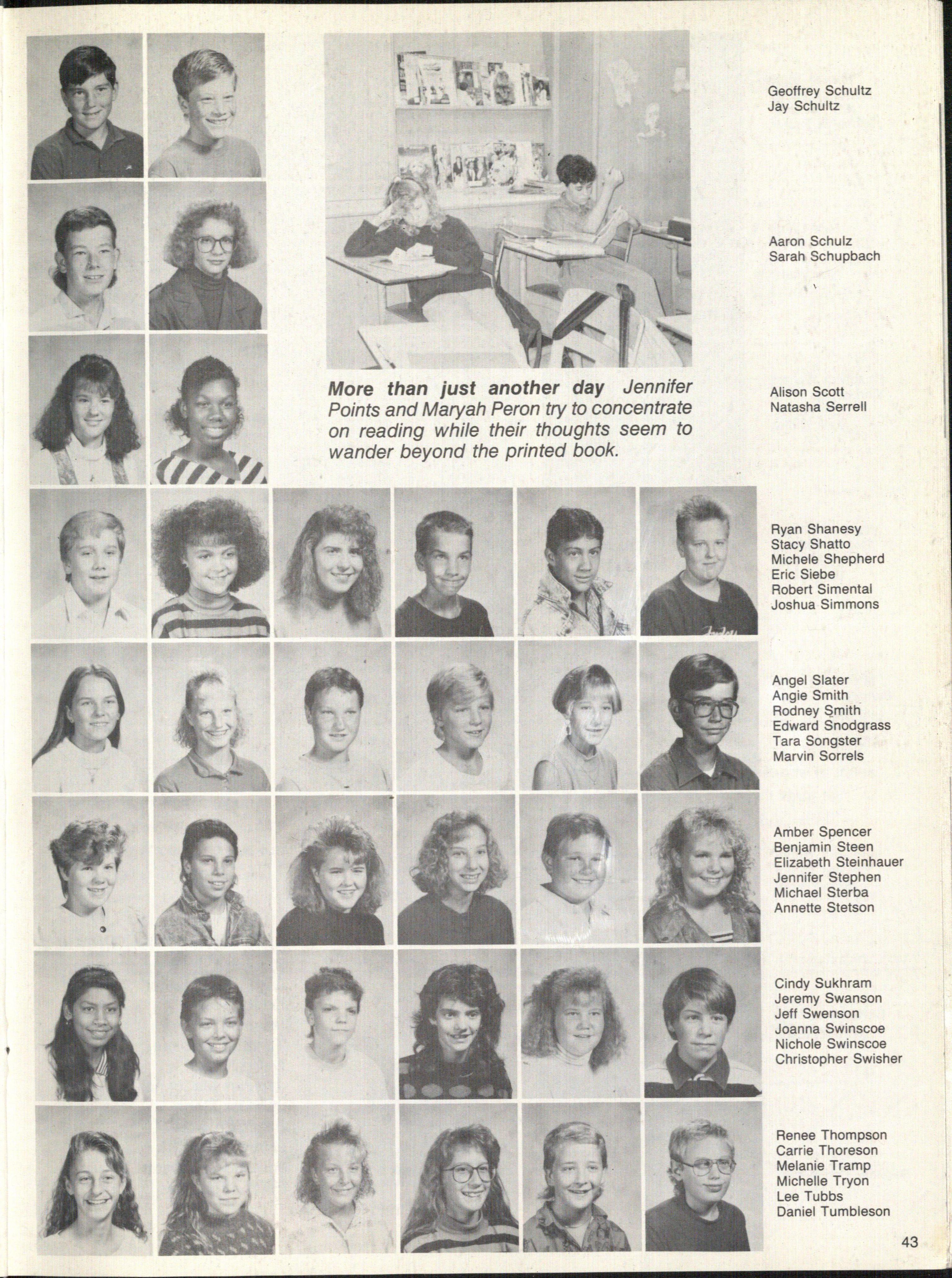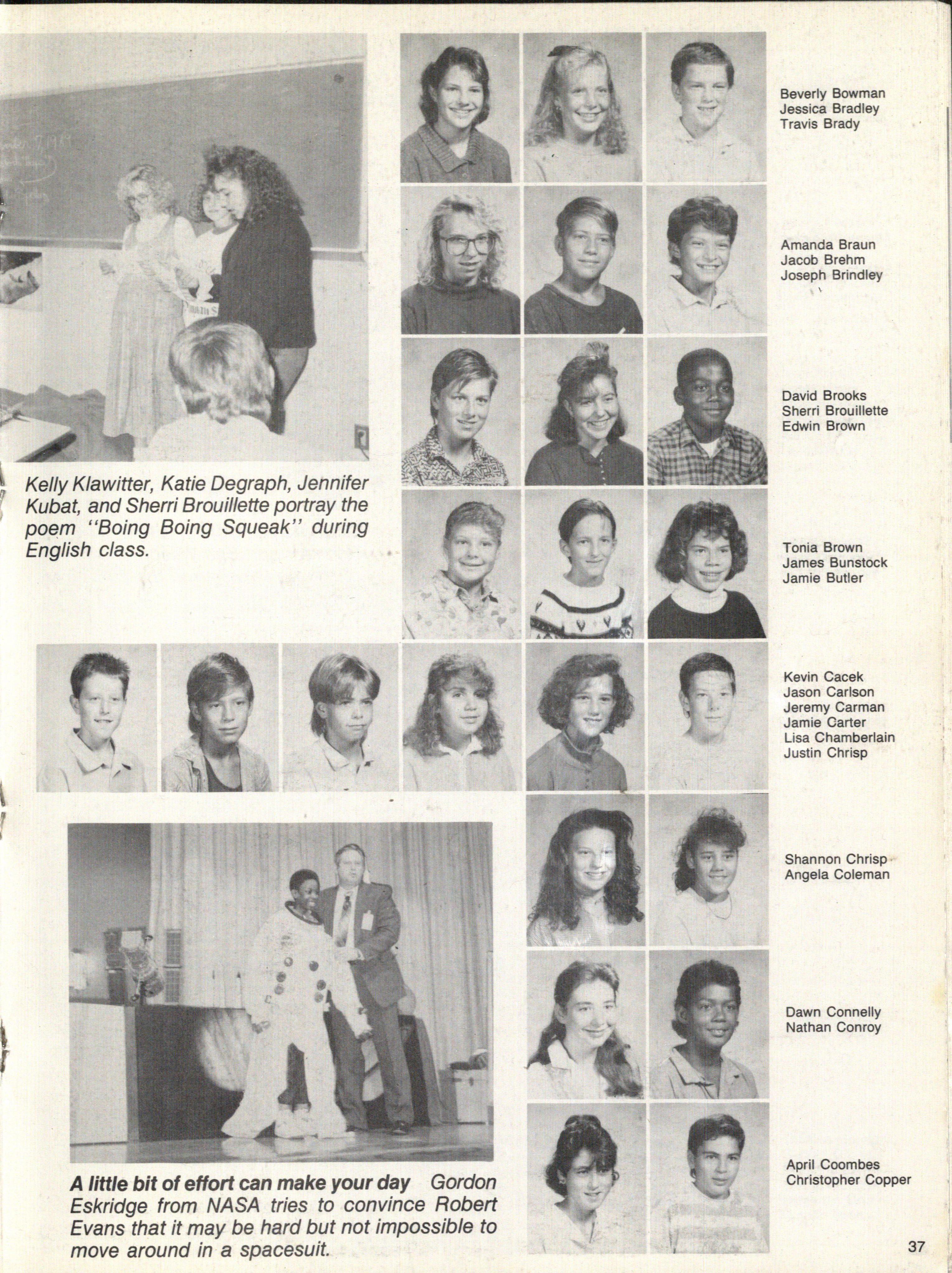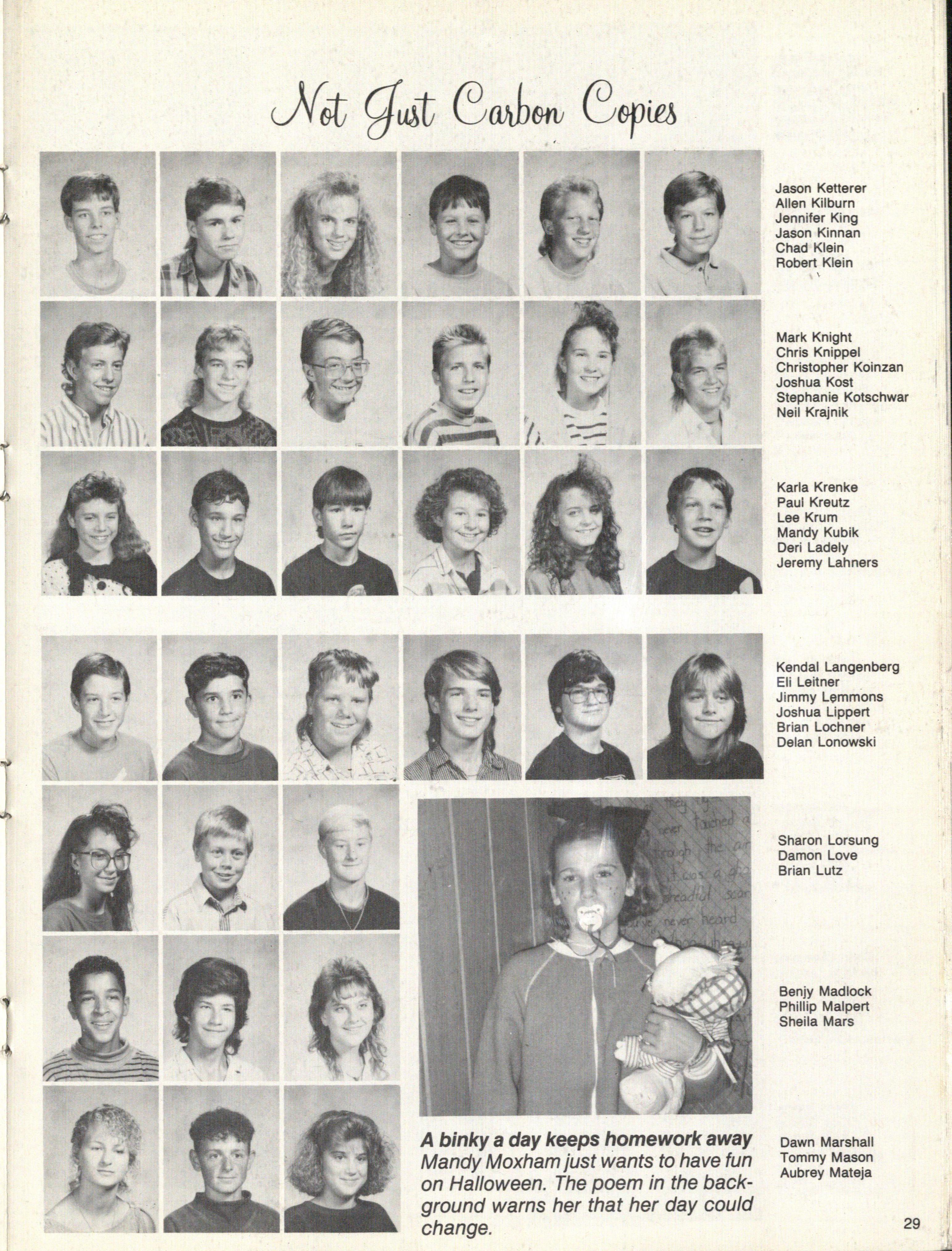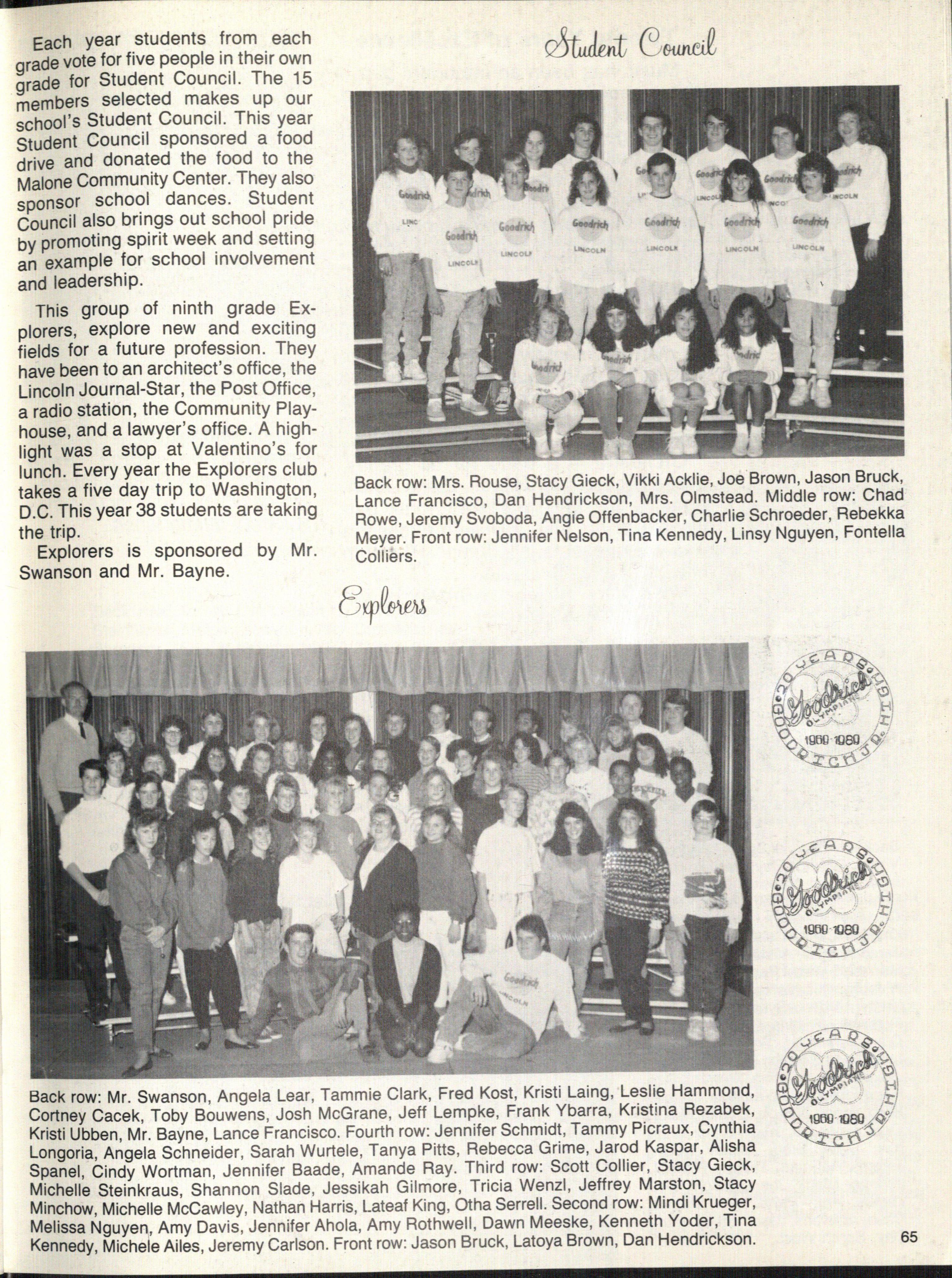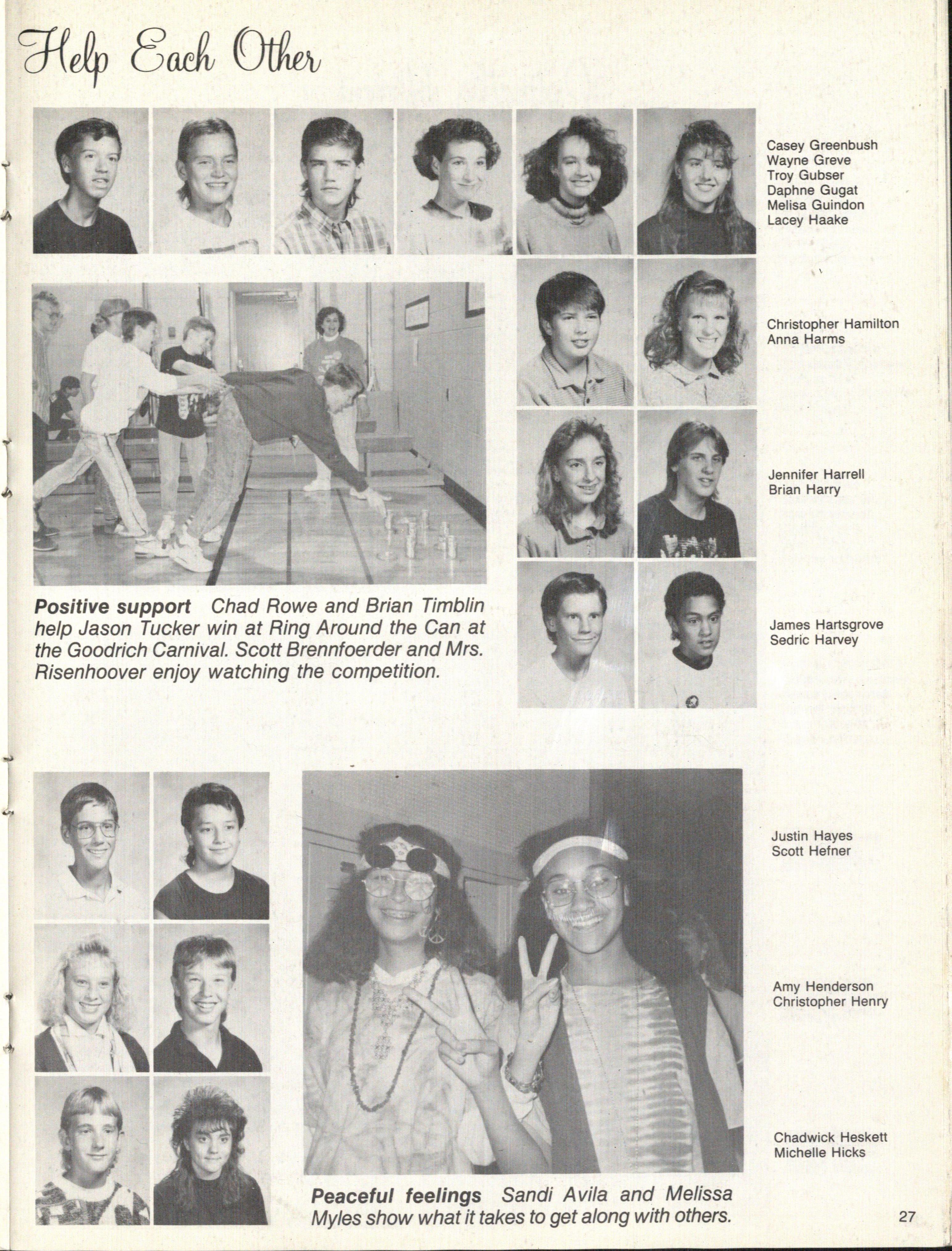 1989-90 Yearbook Staff Back row: James Berg, Ron Coles, Adam Stewart, Chuck Cook, Amy Winkler, Michelle Steinkraus, Lance Francisco. Middle row: Stephanie Fredrickson, Carlos Gonzalez, Tami Krejdl, Jeremy Carlson, Jamie Walker, Billy Wendeln, Melissa Nguyen, Leah Magee (Adviser). Front row: Amy Rothwell, Michele Ailes, Cortney Cacek, Tina Kenn.edy, Mar.garet Drdla, and Tanya Pitts.