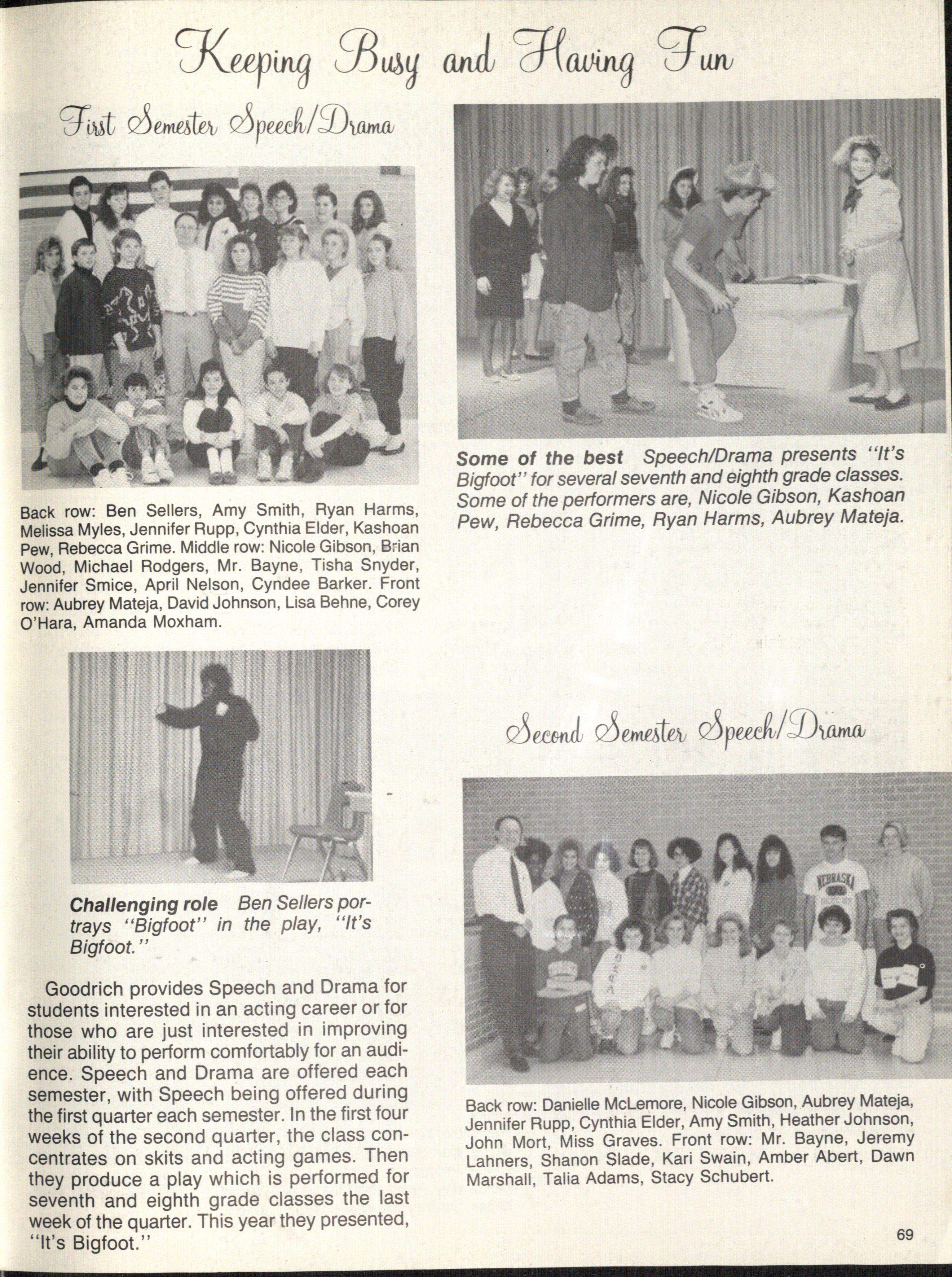 Goodrich provides Speech and Drama for students interested in an acting career or for those who are just interested in improving their ability to perform comfortably for an audience. Speech and Drama are offered each semester, with Speech being offered during the first quarter each semester. In the first four weeks of the second quarter, the class concentrates on skits and acting games. Then they produce a play which is performed for seventh and eighth grade classes the last week of the quarter This year they presented, "It's Bigfoot."