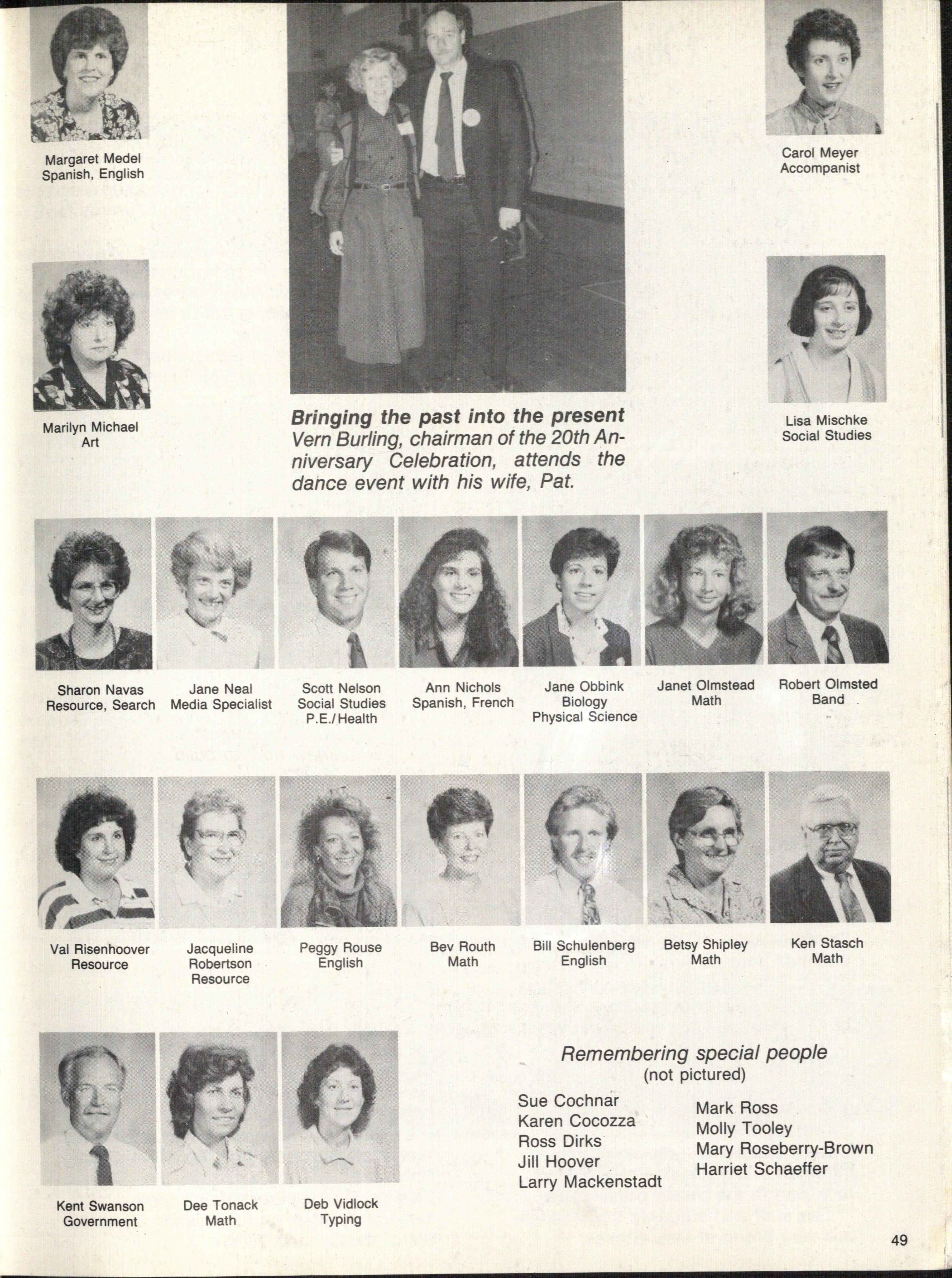 An anniversary celebration commemorating 20 years of history took place on November 8-10, 1989 at the school. The event centered around two main areas which included room displays, featuring events from past years, and departmental disciplines and