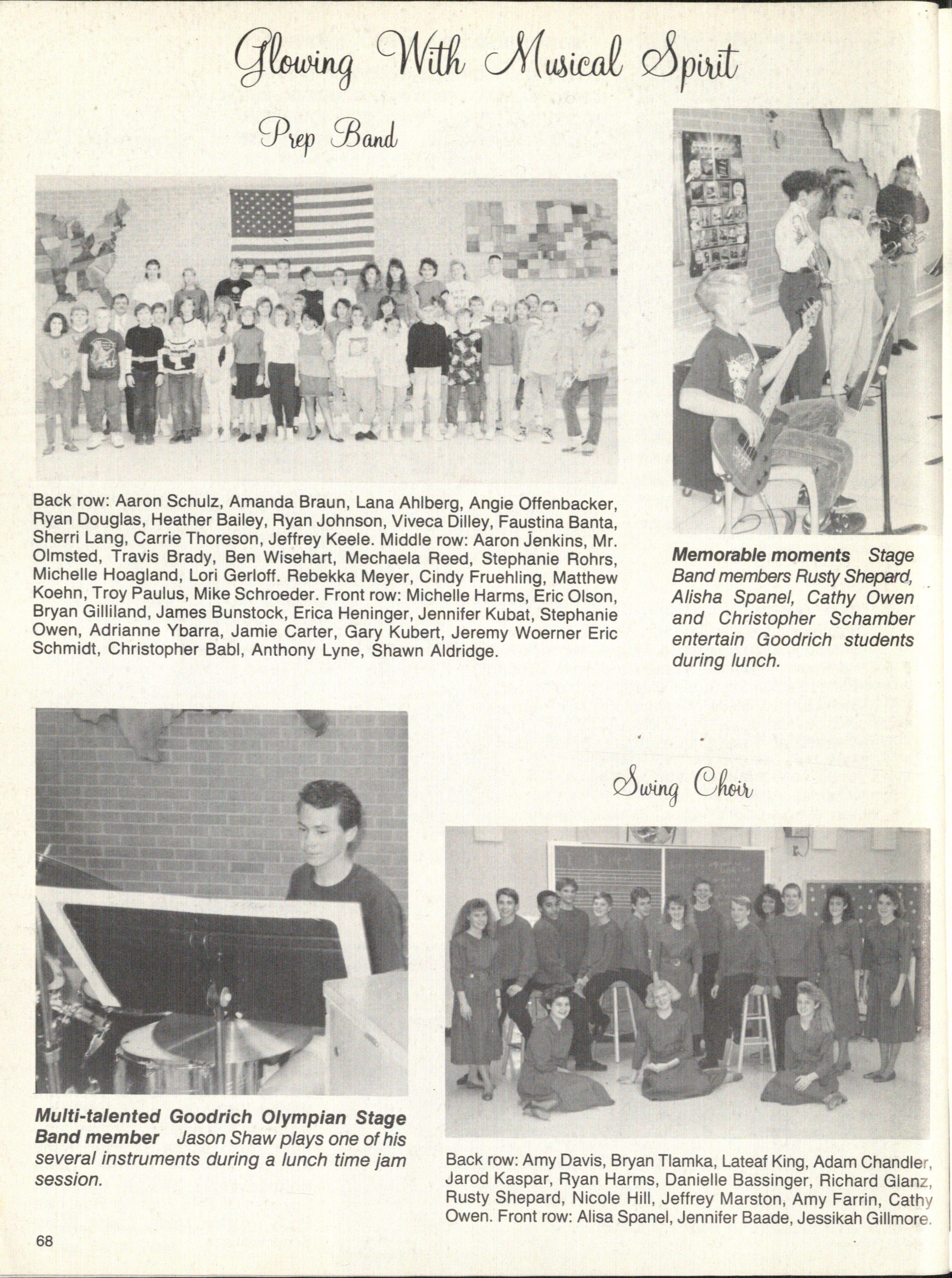Music has been an important part in this school's activities. Mr. Olmsted, teacher of Prep, Intermediate, Symphonic and Stage Bands, has been with Goodrich for all of its 20 years. Prep Band works on fundamentals while Intermediate is more advanced. Symphonic Band is made up of many ninth graders with some eig hth graders in the class.