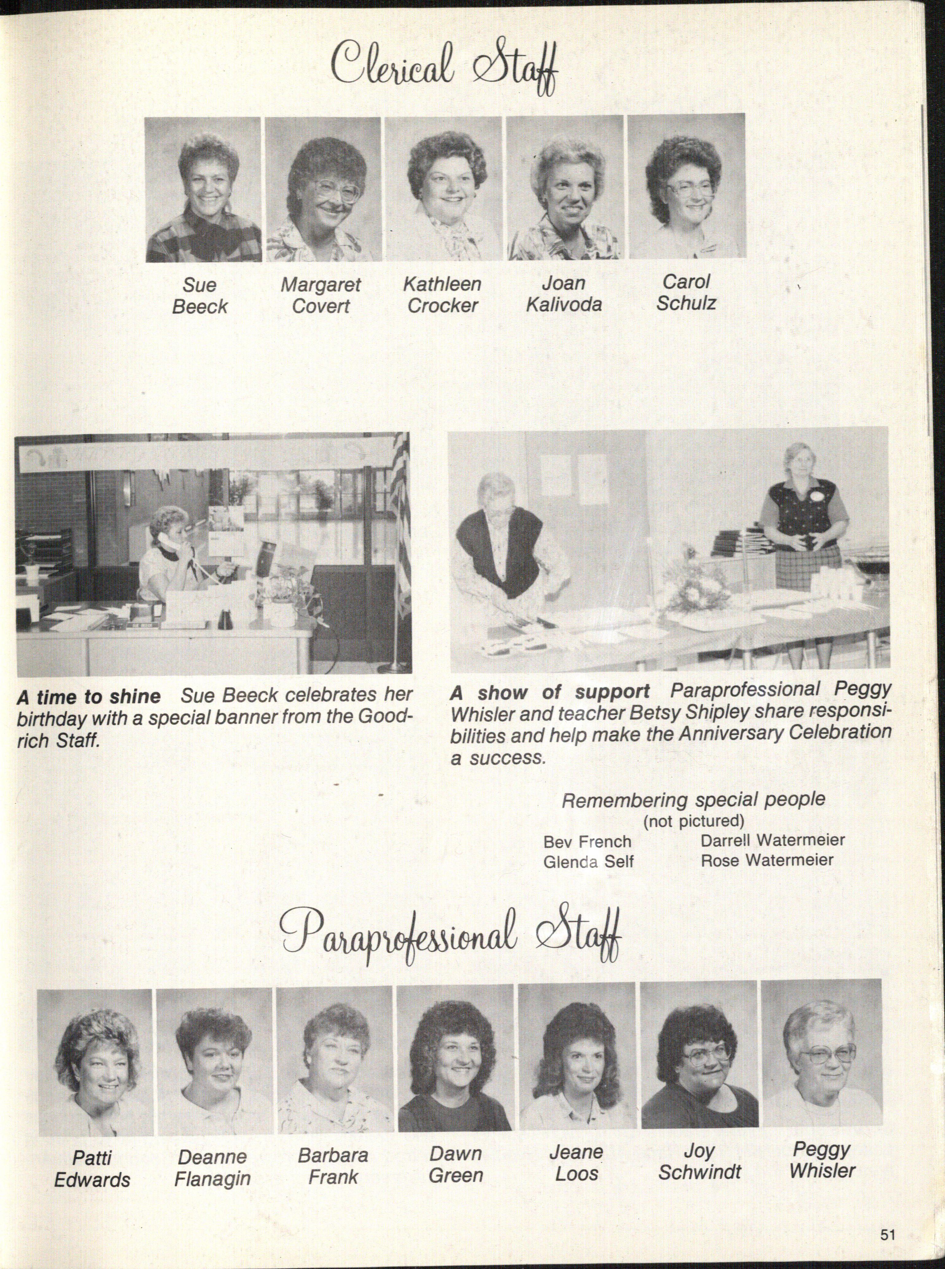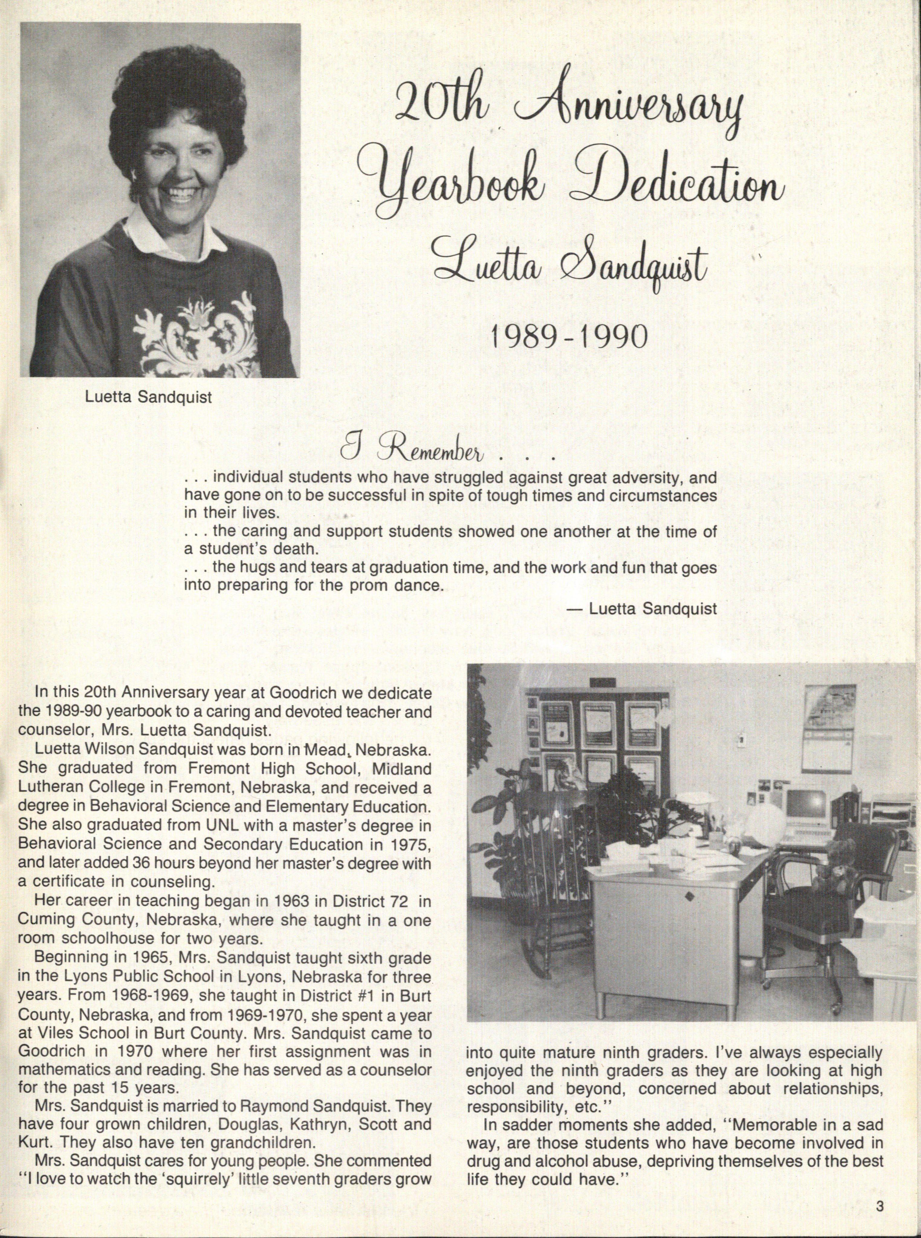 In this 20th Anniversary year at Goodrich we dedicate the 1989-90 yearbook to a caring and devoted teacher and counselor, Mrs. Luetta Sandquist.