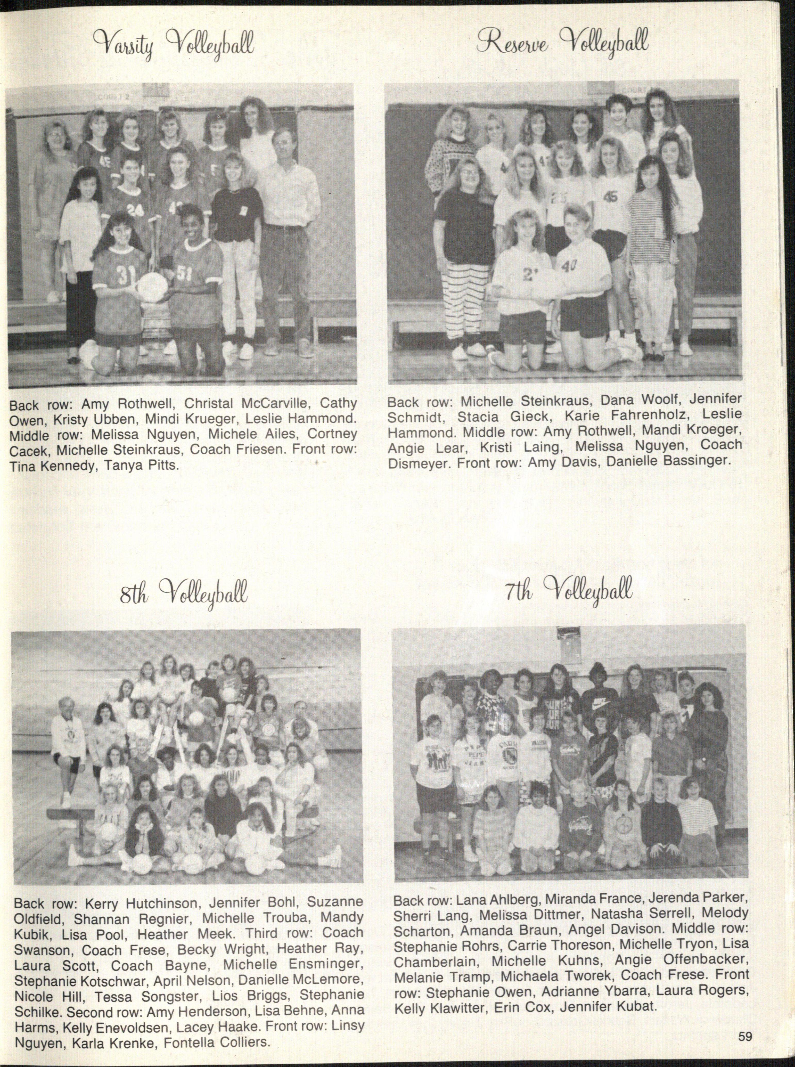 Back row : Gina Emery , Anna Harms , Cyn t hia Elder , Jennifer King , Heather T ho ms en , Angila Longwell , Stephanie Schilke , Anne Farrin , Ma rc e ll a Scharton , Elena Ulrich , Nicole Rung , April Nelson. M idd le row: Coach Bayne , Lacey Haake , Dena Bogdanovich , Heid i Perry, Michelle Ensminger , Nicole Hill , Lisa ·Behne , Me li ssa Myles , Mittra Coad , Susan Shephard , Coach Fr iesen Front row: Janelle Howell , Lisa Pool , Laura Scott , Mandy Ku bik, Crystal Williams , Fontella Colliers , Suzanne Oldfie ld , Lisa Baronio , Stacy Schubert , Joey McKernan , Amy He nderson.