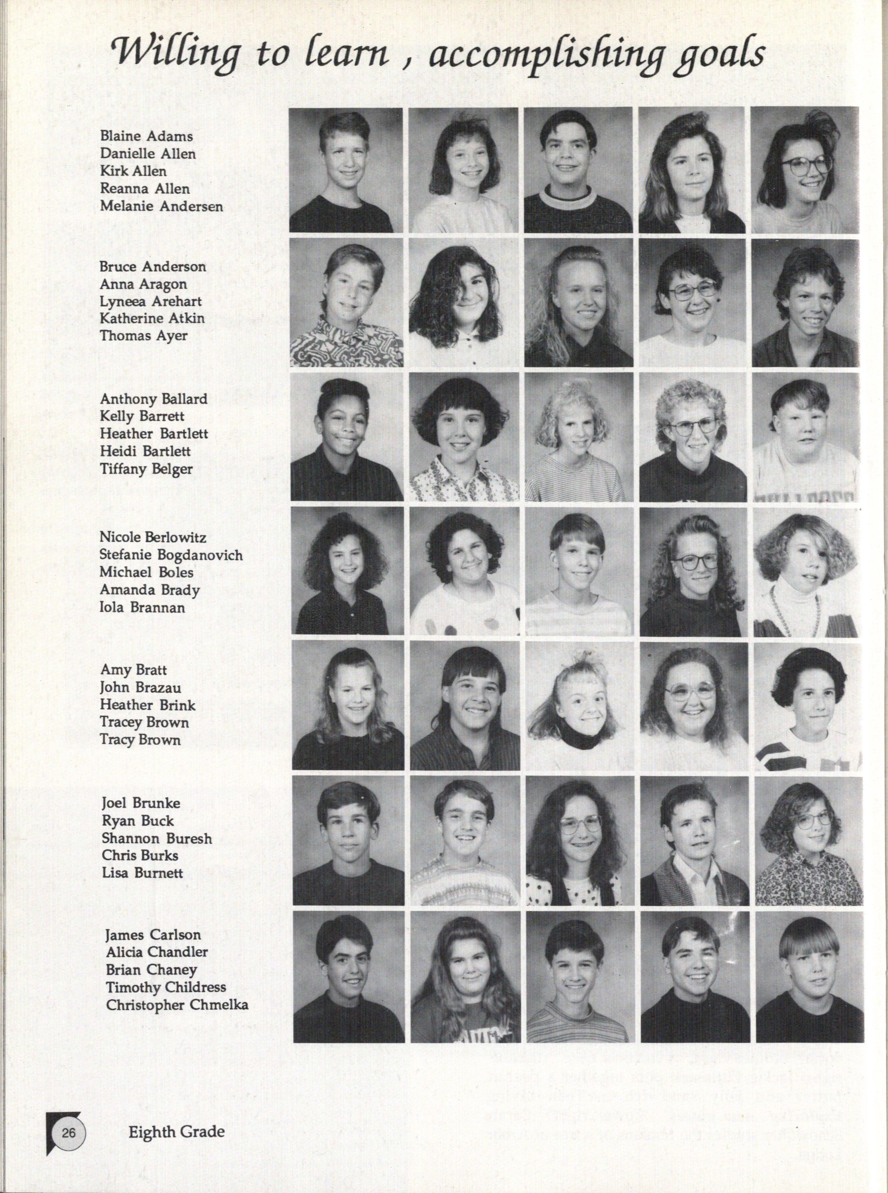 8th Grade (Below) Back row: James Keller, Timothy Childress, Shawn Van Dyke, Cory Lyons, Danny Marshall, Taryn Tolliver, Gwen Daarud, Kirk Allen, Melvin Revilla, Paula Lile, T.J. Swanson Fifth row: Michaela Dubbs, Brian Podwinski, Jenifer Wood, Desirae Dockter, •Jim Carlson, Jessica Deville, Melissa Steinkraus, Kelly Barrett, Rebecca Leapley, Courtney Knippel, Michelle Ketterer, Shannon Buresh, Bevin McLaughlin, Elizabeth Frye, Michael Boles, •Monica Kepler, Danita Howe, Julia Gamer, Heidi Bartlett, Heather Bartlett, Stephani Zechmann, Jason Crandall Fourth row: Jeffrey Harris, James Knight, Enoch Ulmer, Michael Mccawley, •Brian Chaney, Daniel Schulz, J~ffrey Sheets, John Ferrin, John Brazau Third row: Ryan Rader, Gary Downs, Ty Mumgaard, Kelli Mitchell, Angela Watson, Andrea Taulborg, Toby Schroder, Karina Fredrickson, Michelle Musick, Tracy Brown, Jaime Neurohr, Tracey Brown Second row: Andrew Staehr, Steven Mercer, •Derek Walker, •Kari Rowe, Corissa Stewart, Amanda Brady, Lyneea Arehart, Trad Lewandowski, Amy Bratt, Laura Irons, Stephanie Shields, Lindsay Gilmore Front row: Piper Hill, Hilary Donovan, Keri Keller, Nickey Sampson, Erica Hejsek, Luke Johnson, T.J. Hammond, Jason Hanlon, Jesse Theiler, •Joe Rupp, Melissa Merrill •committee members