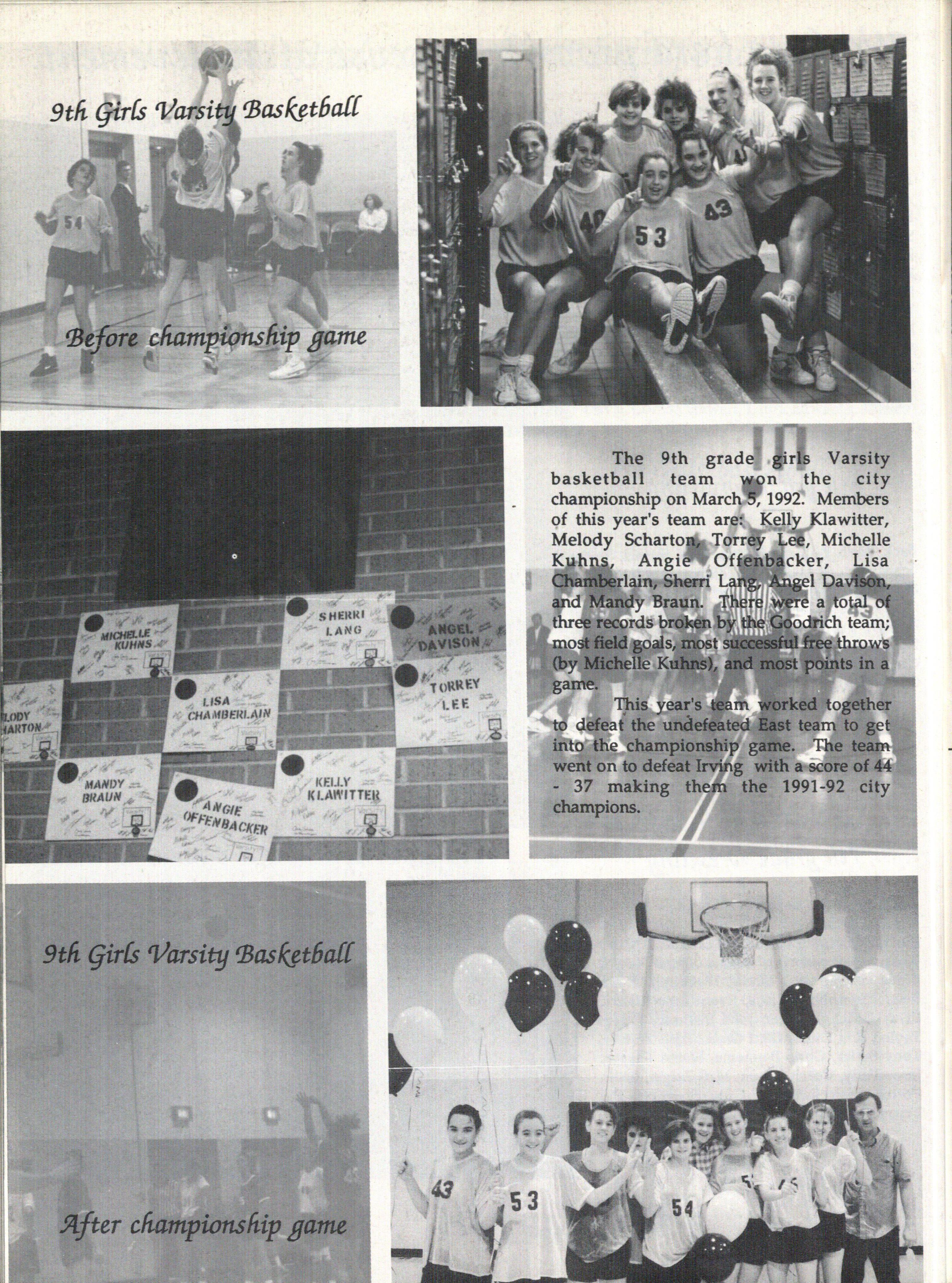 The 9th grade Varsity basketball team n the city championship on March , 1992. Members of this year's team are: Kelly l(lawitter, Michelle