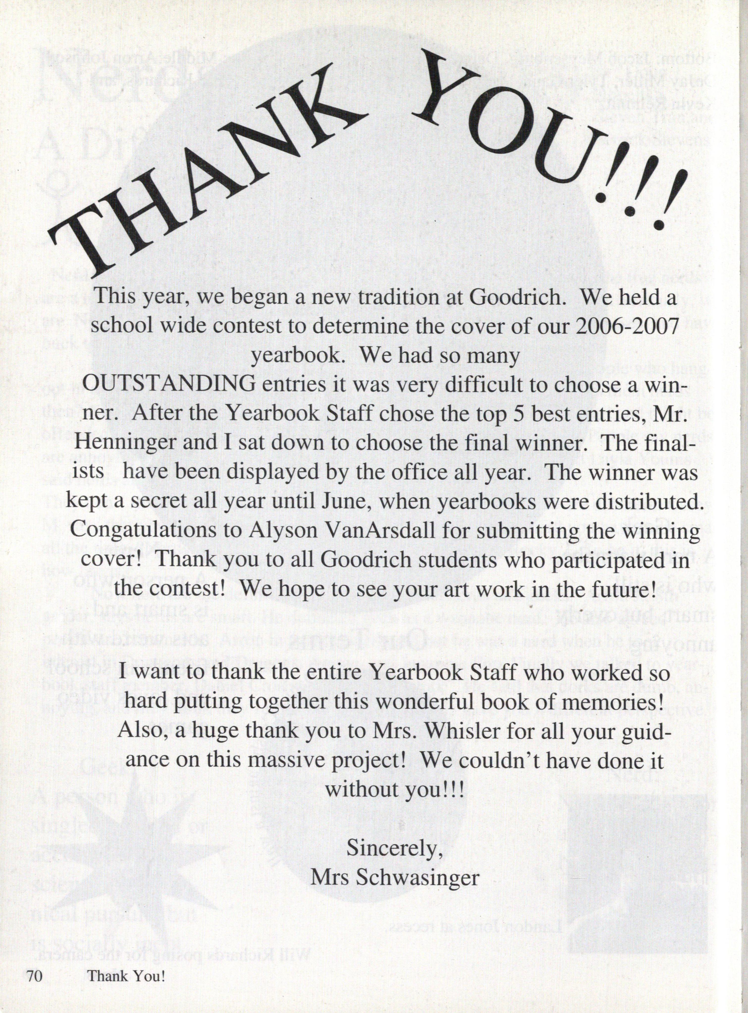 This year, we began a new tradition at Goodrich. We held a school wide contest to determine the cover of our 2006-2007 yearbook. We had so many OUTSTANDING entries it was very difficult to choose a winner. After the Yearbook Staff chose the top 5 best entries, Mr. Henninger and I sat down to choose the final winner. The finalists have been displayed by the office all year. The winner was kept a secret all year until June, when yearbooks were distributed. Congatulations to Alyson VanArsdall for submitting the winning cover! Thank you to all Goodrich students who participated in the contest! We hope to see your art work in the future!