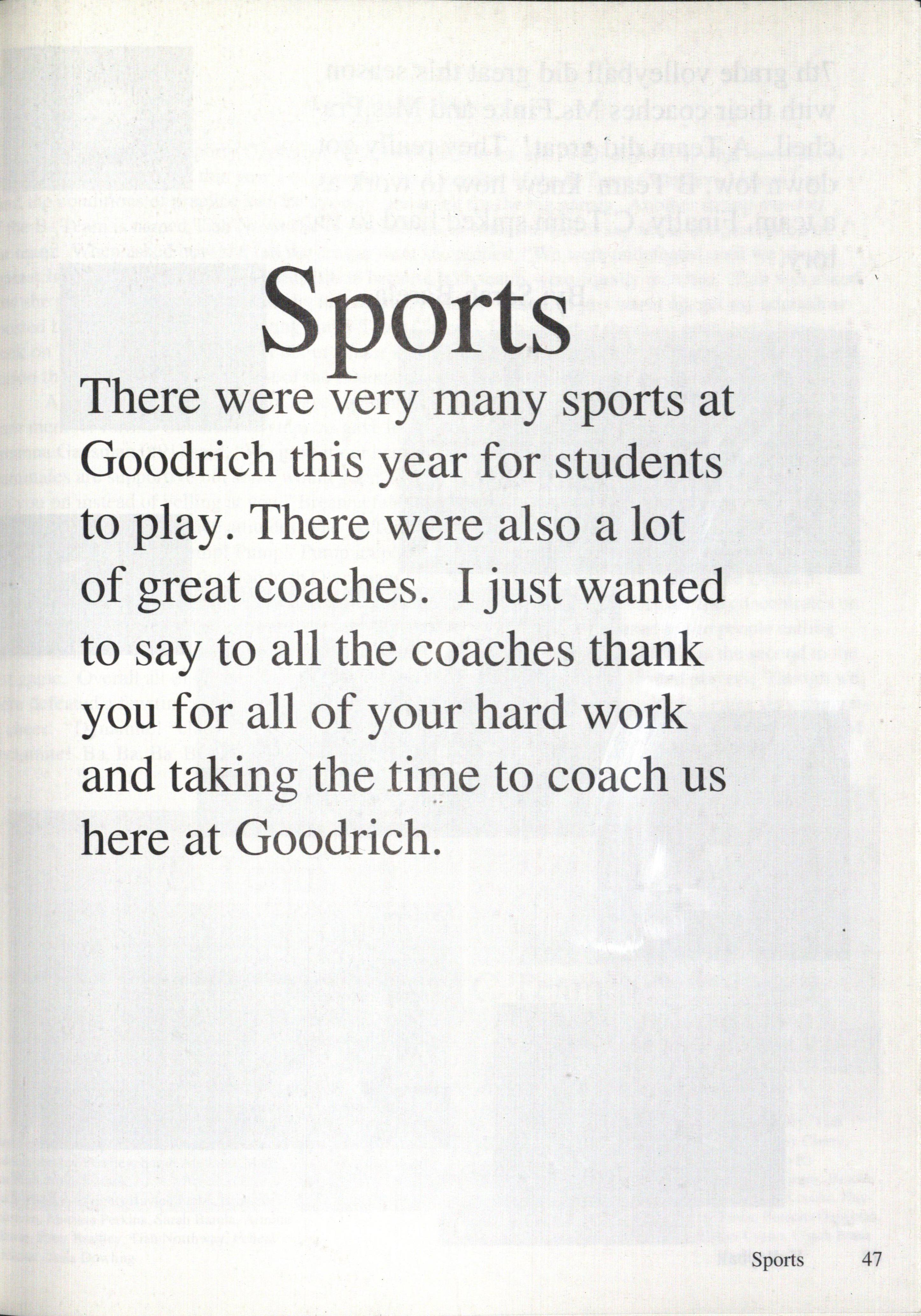 There were very many sports at Goodrich this year for students to play. There were also a lot of great coaches. I just wanted to say to all the coaches thank you for all of your hard work and taking the tirp.e to coach us hereatGoodrich.