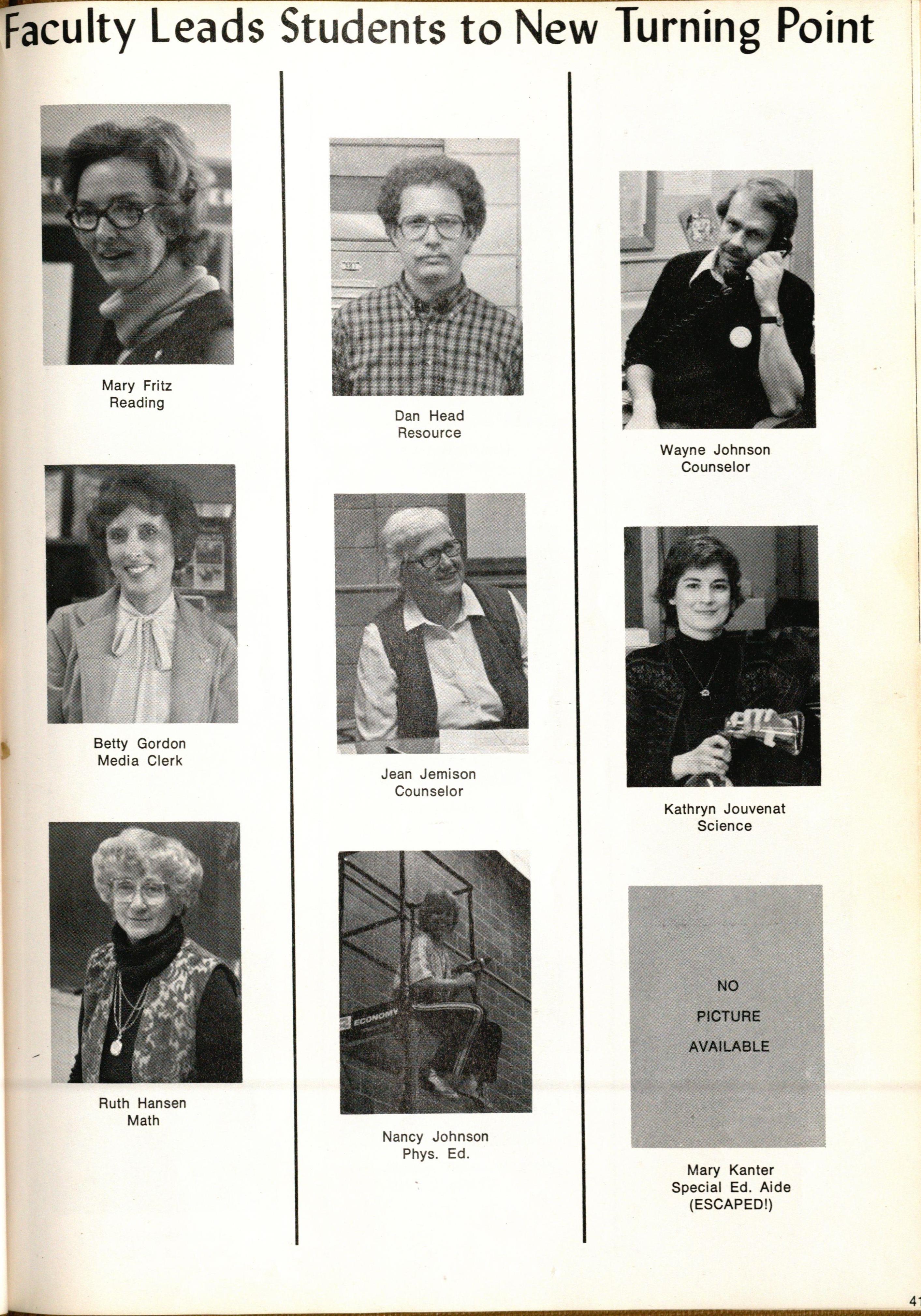 What's cropping? What's bleeding? How do we do headlines? What if the printer can't mak~ this picture the right size? When can we set this picture up? How come the faculty never shows up when we schedule their picture? We missed our deadline? Impossible! These were only a few questions that were brought up in yearbook class throughout the year. As Mrs. Shafer pulled her hair out, and explained everything to us time after time, it started to penetrate into our heads. The first thing we had to do was choose a title, "The Turning Point. " We selected cover