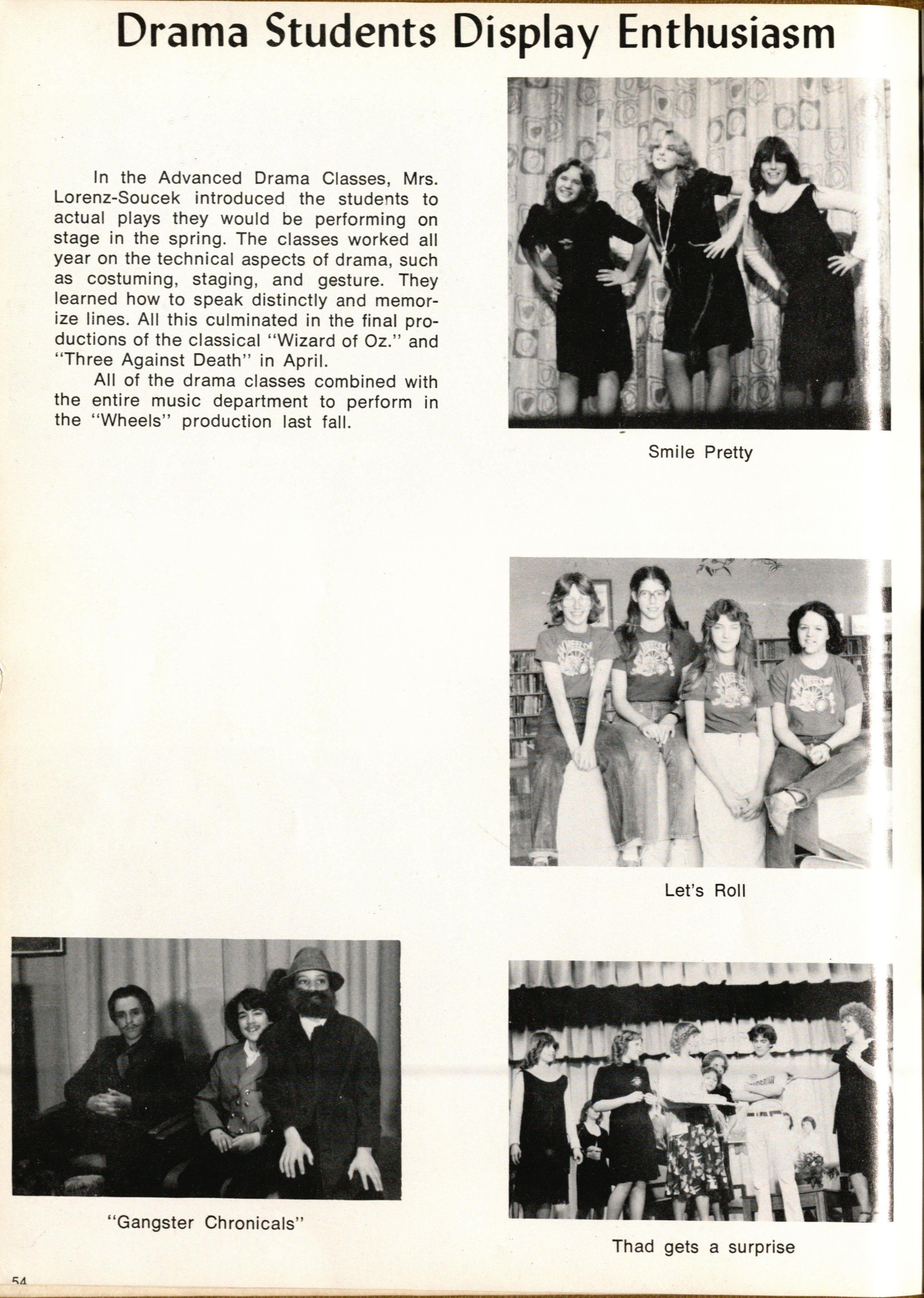 In the Advanced Drama Classes, Mr s Lorenz-Soucek introduced the students to actual plays they wou l d be performing on stage in the spring The classes worked all year on the technical aspects of drama , such as costuming , stag i ng , and gesture. They learned how to speak distinctly and memorize lines. All this culminated in the final productions of the classical "Wizard of Oz. " and " Three Against Death " in April. All of the drama classes combined with the entire music department to perform in the " Wheels " production last fall.