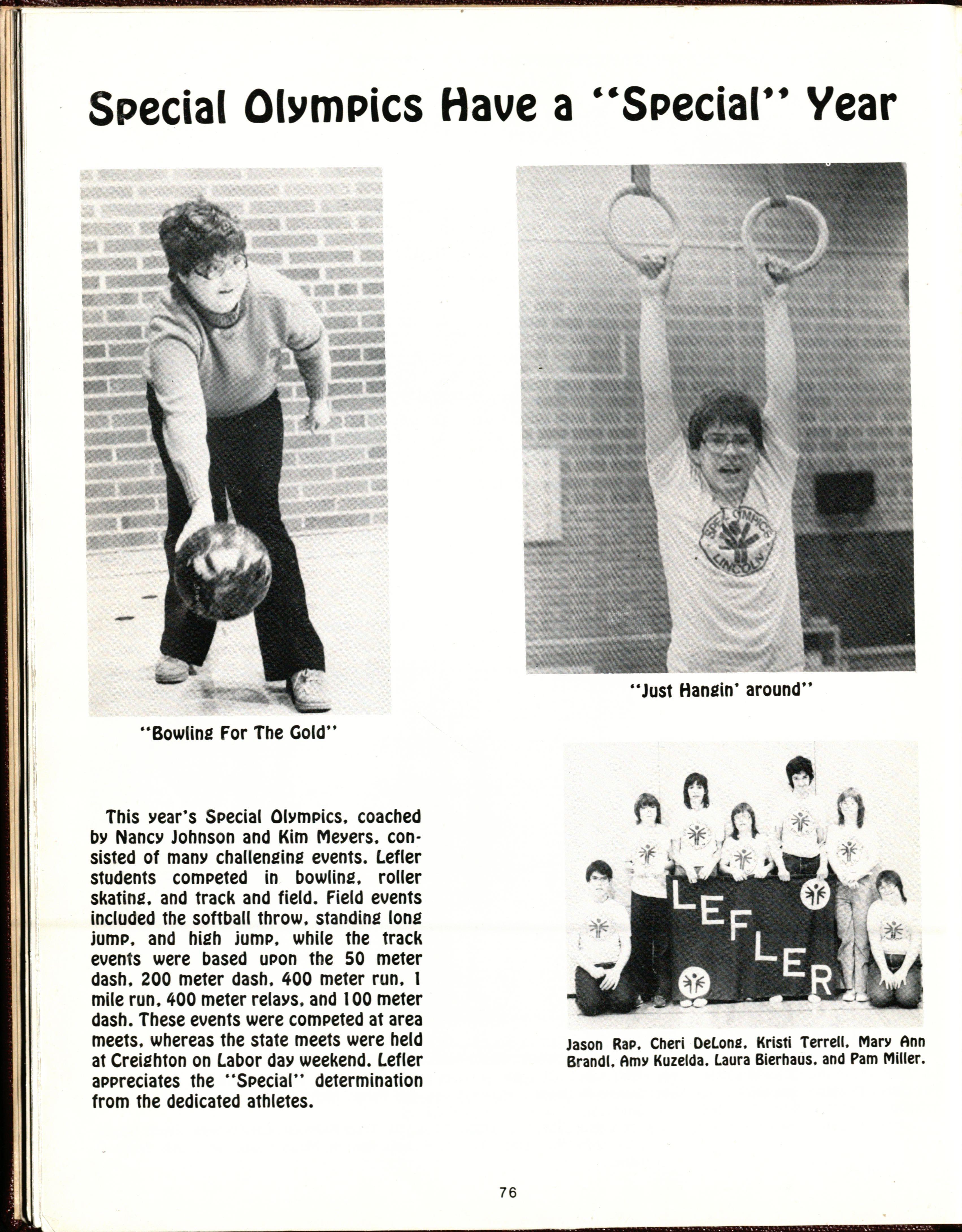 This Year's SPecial OIYmPics. coached by Nancy Johnson and Kim Meyers. consisted of many challenE!inE! events. Lefler students competed in bowlinE!. roller skatinE!. and track and field. Field events included the softball throw. standinE! lonE! jump. and hiE!h jump. while the track events were based upon the so meter dash. 200 meter dash. 400 meter run. 1 mile run. 400 meter relaYs. and 100 meter dash. These events were competed at area meets. whereas the state meets were held at CreiE!hton on Labor day weekend. Lefler aPPreciates the --special.. determination from the dedicated athletes.