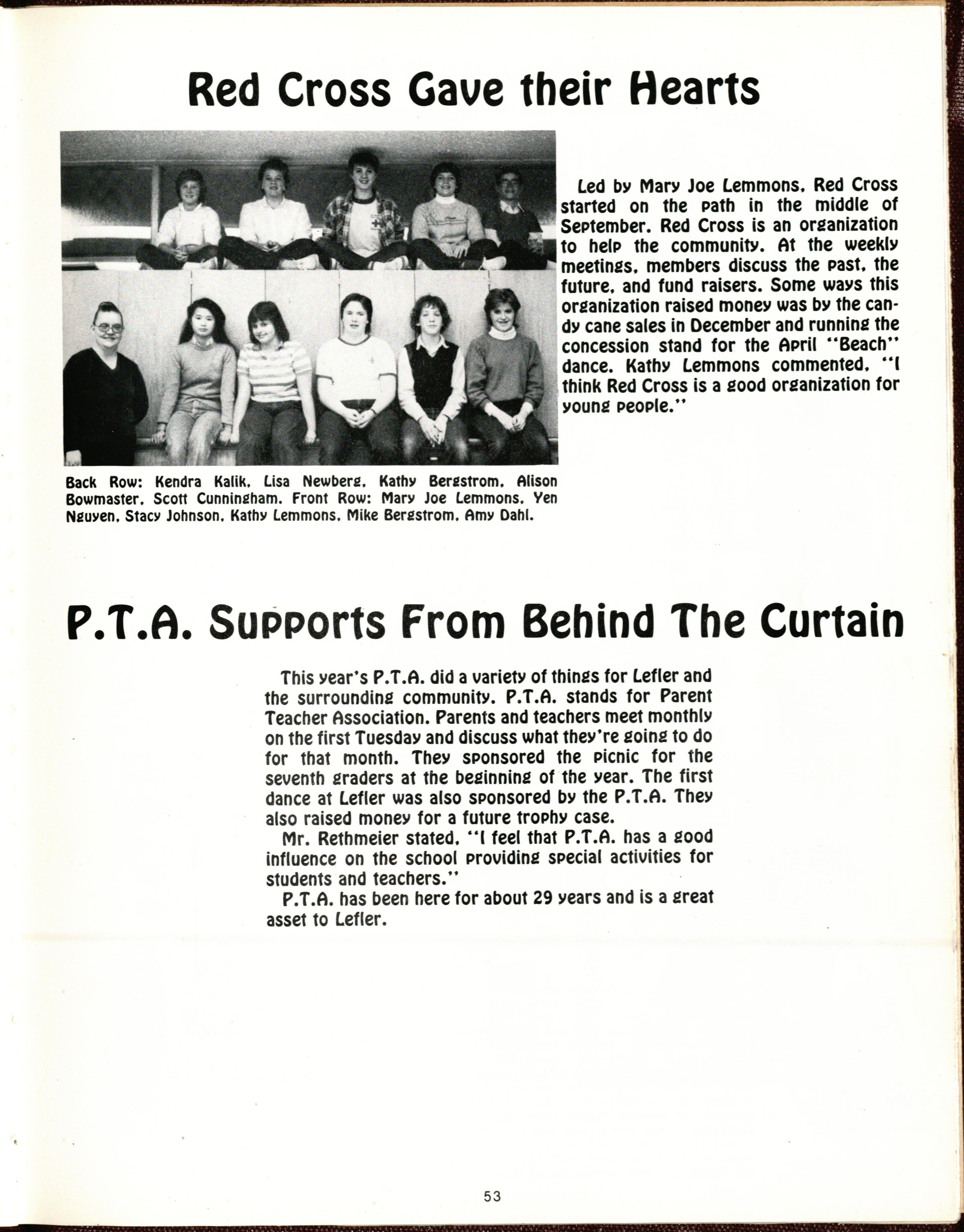 led by Mary Joe Lemmons. Red Cross started on the Path in the middle of September. Red Cross is an oreanization to helP the community. At the weekly meetines. members discuss the Past. the future. and fund raisers. Some ways this oreanization raised money was bY the candy cane sales in December and runnine the concession stand for the APril ""Beach .. dance. Kathy Lemmons commented. ""I think Red Cross is a eood oreanization for youne People.··