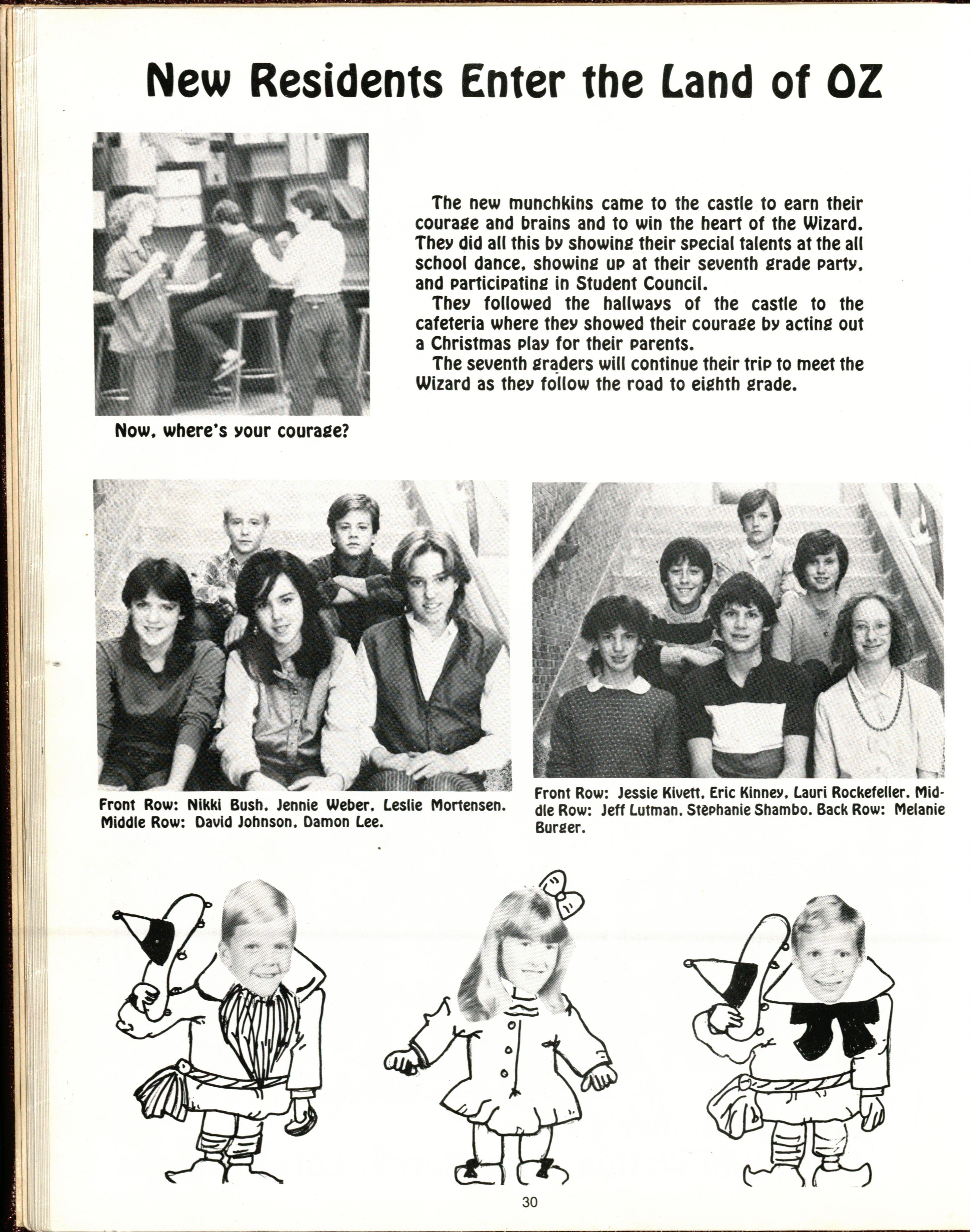 The new munchkins came to the castle to earn their coura2e and brains and to win the heart of the Wizard. They did all this bY showin2 their special talents at the all school dance. showin2 UP at their seventh 2rade Party. and ParticiPatin2 in Student Council.