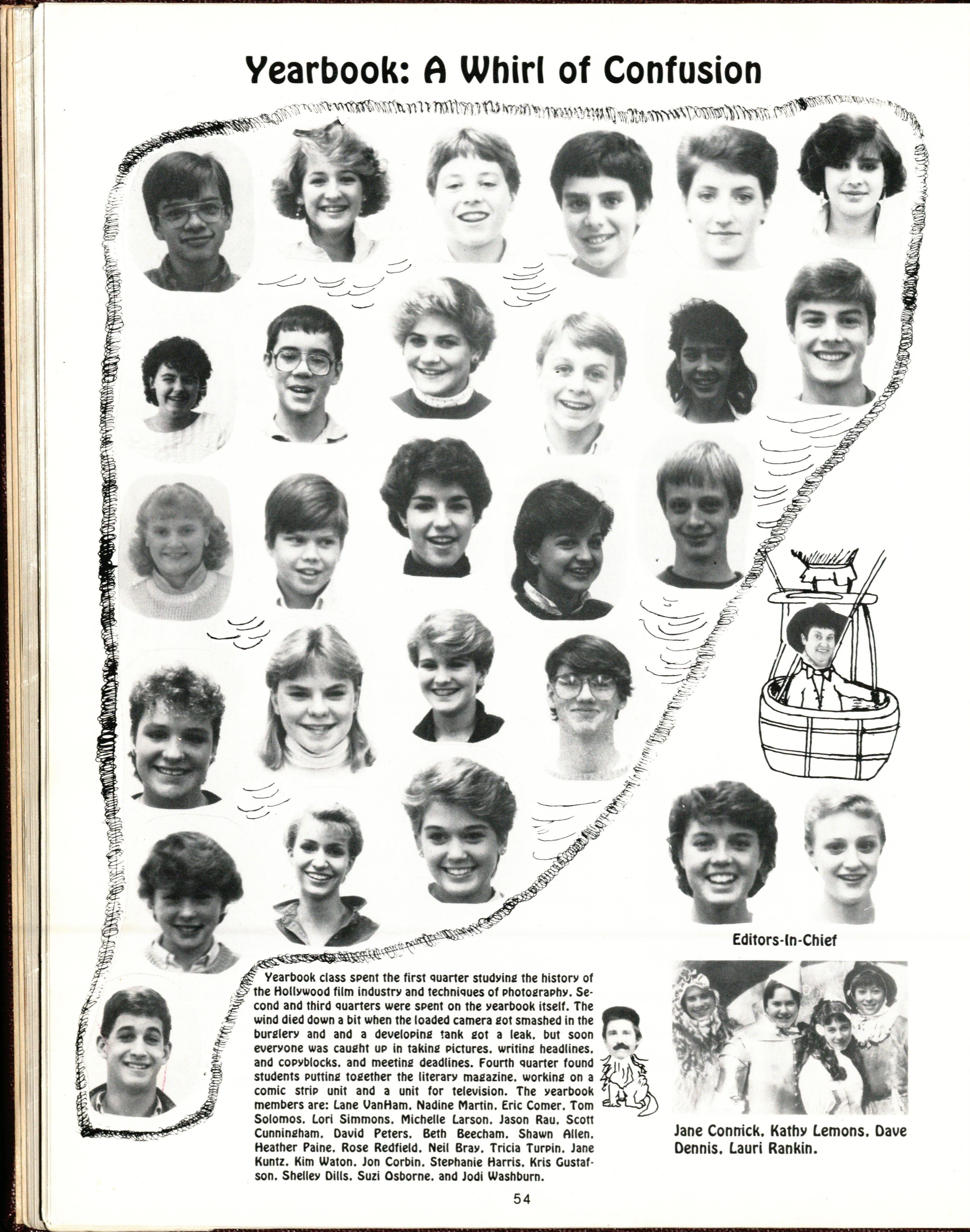 stud~nts Puttine_ toeether the_ literarY ma~~zine. workine on a comic strip unit and a unit for telev1s1on. The Yearbook members are: Lane VanHam. Nadine Martin. Eric Comer. Tom Solomos. Lori Simmons. Michelle Larson. Jason Rau Scott Cunnineham. David Peters. Beth Beecham. Shawn Allen. Heather Paine. Rose Redfield. Neil Bray , Tricia TurPin. Jane Kuntz. Kim Waton. Jon Corbin. StePhanie Harris. Kris Gustafson. Shelley Dills. Suzi Osborne. and Jodi Washburn.