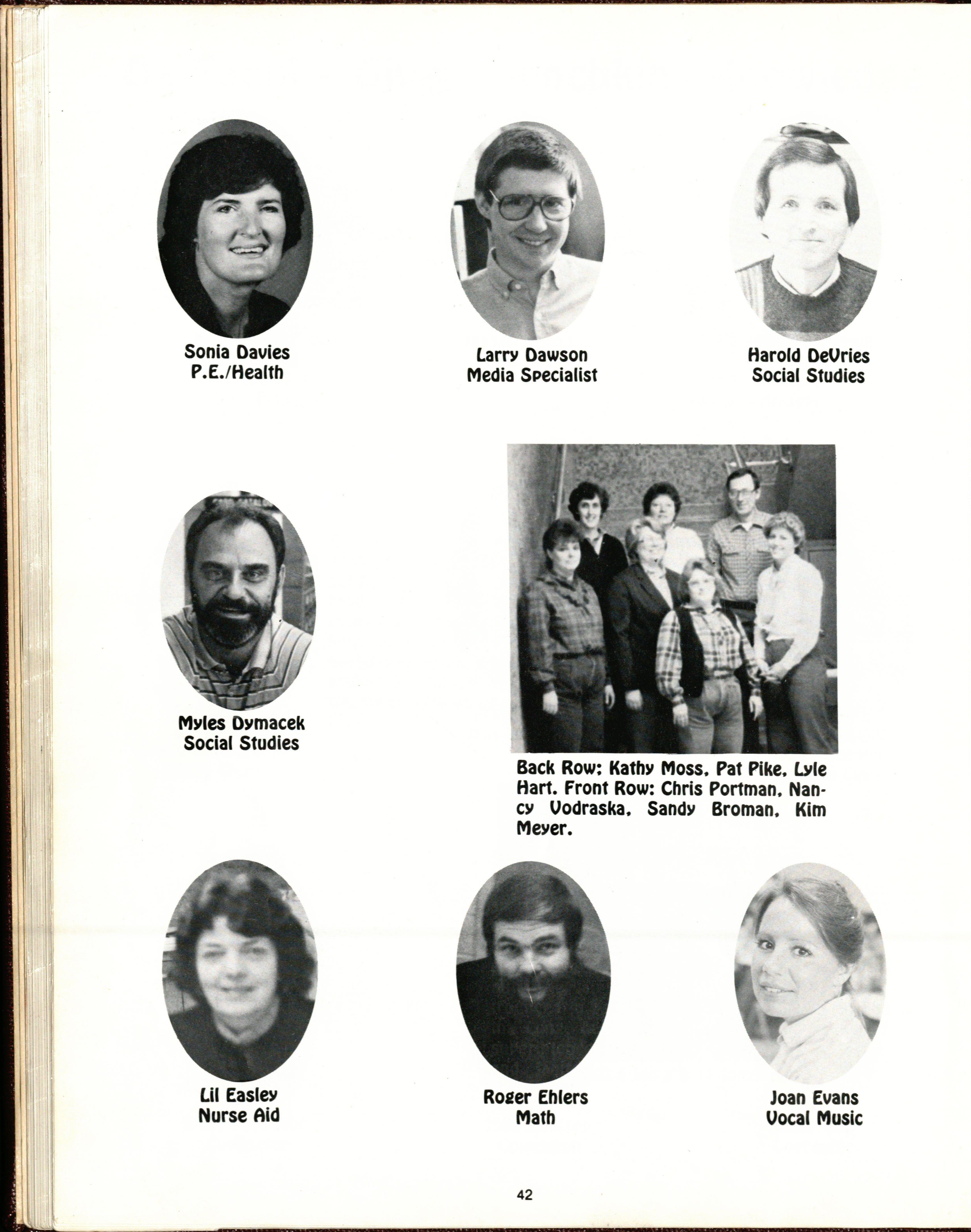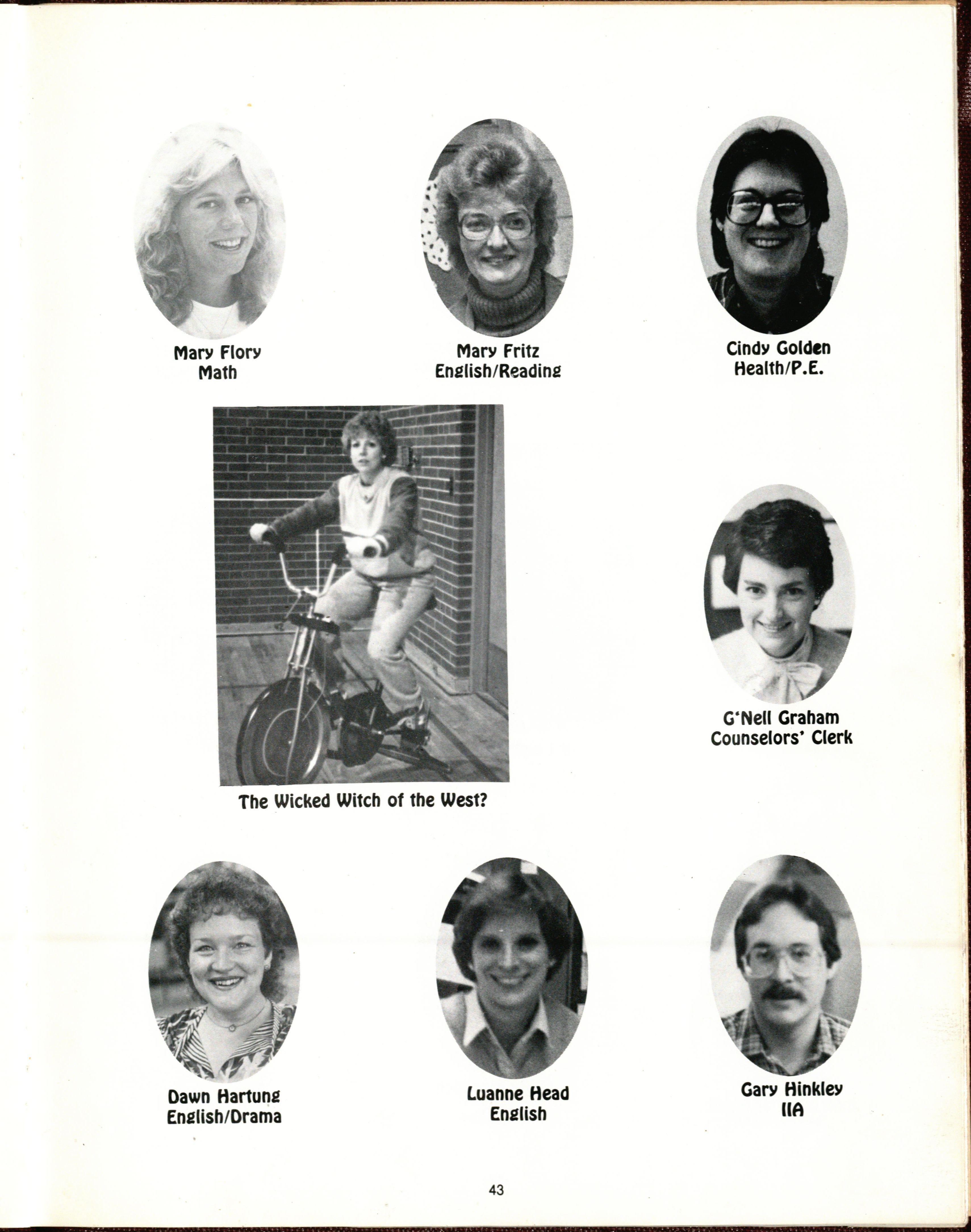 The Faculty of Oz lead very busy lives. Besides 2ivin2 the munchkins the necessary knowledee to eet further down the yellow brick road. th~Y also have many other imPortant functions amone themselves. Mr. Carroll. Ms. Evans. Mrs. Yeck. Mrs. Golden. and Ms. Olsen are members of the social committee. which Provides social activities amone the Faculty of Oz. Without the Faculty of Oz. we munchkins would never make it to Emerald CitY.