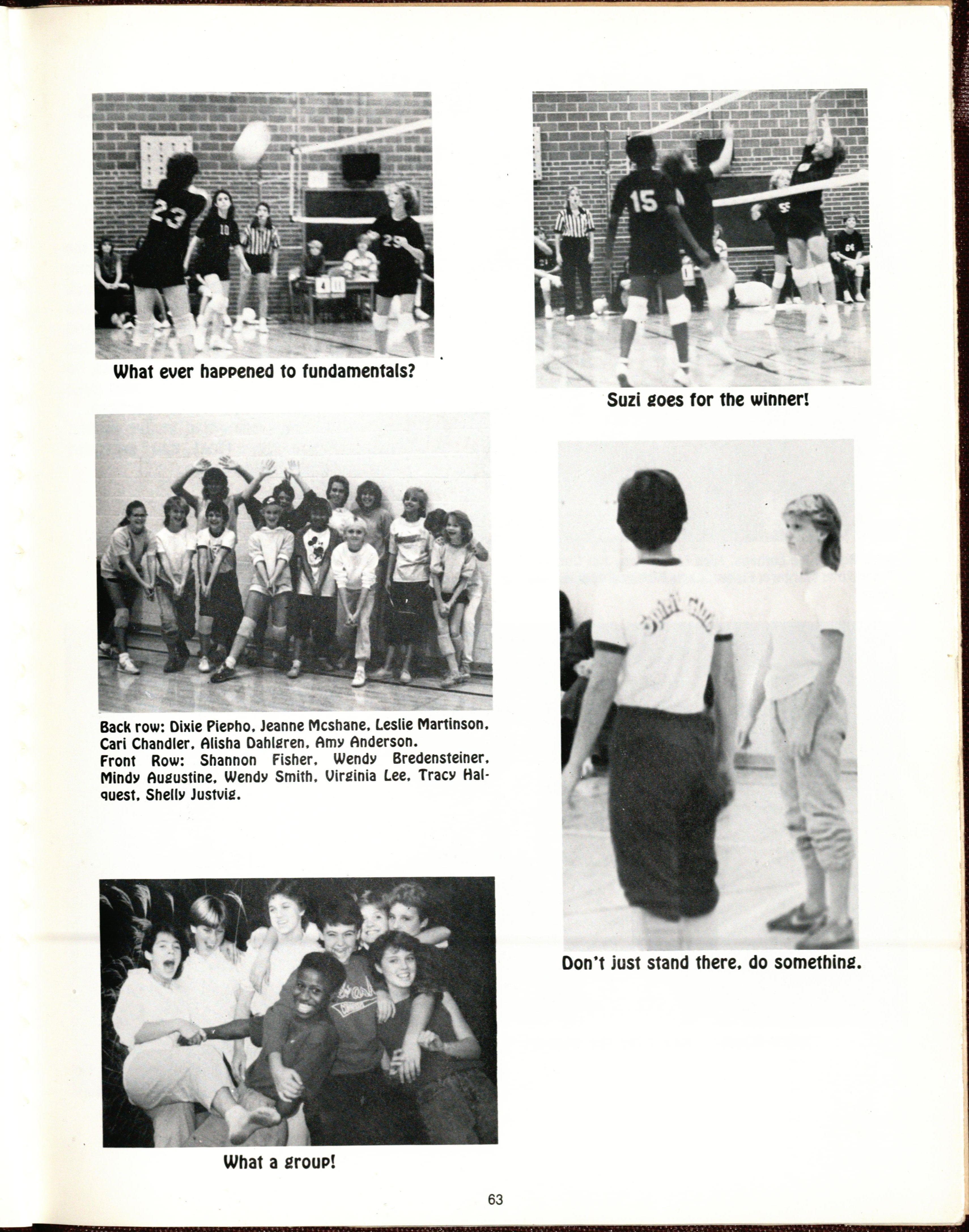 This Year·s varsity and reserve·s volleyball teams followed the Yellow brick road to success. The competition was touah. but the varsity Pulled throuah and took city chamPionshiP for the third season at 5-3. Dorthy•s dream was to leave Emerald CitY. however. varsity•s dream was to ... take citY: • Dreams do come true. Daily Practices and determination insPired the seventh and eiahth araders as they attempted to follow the Path set by the ninth araders. Conaratulations to all who ParticiPated in the winnina volleyball season.