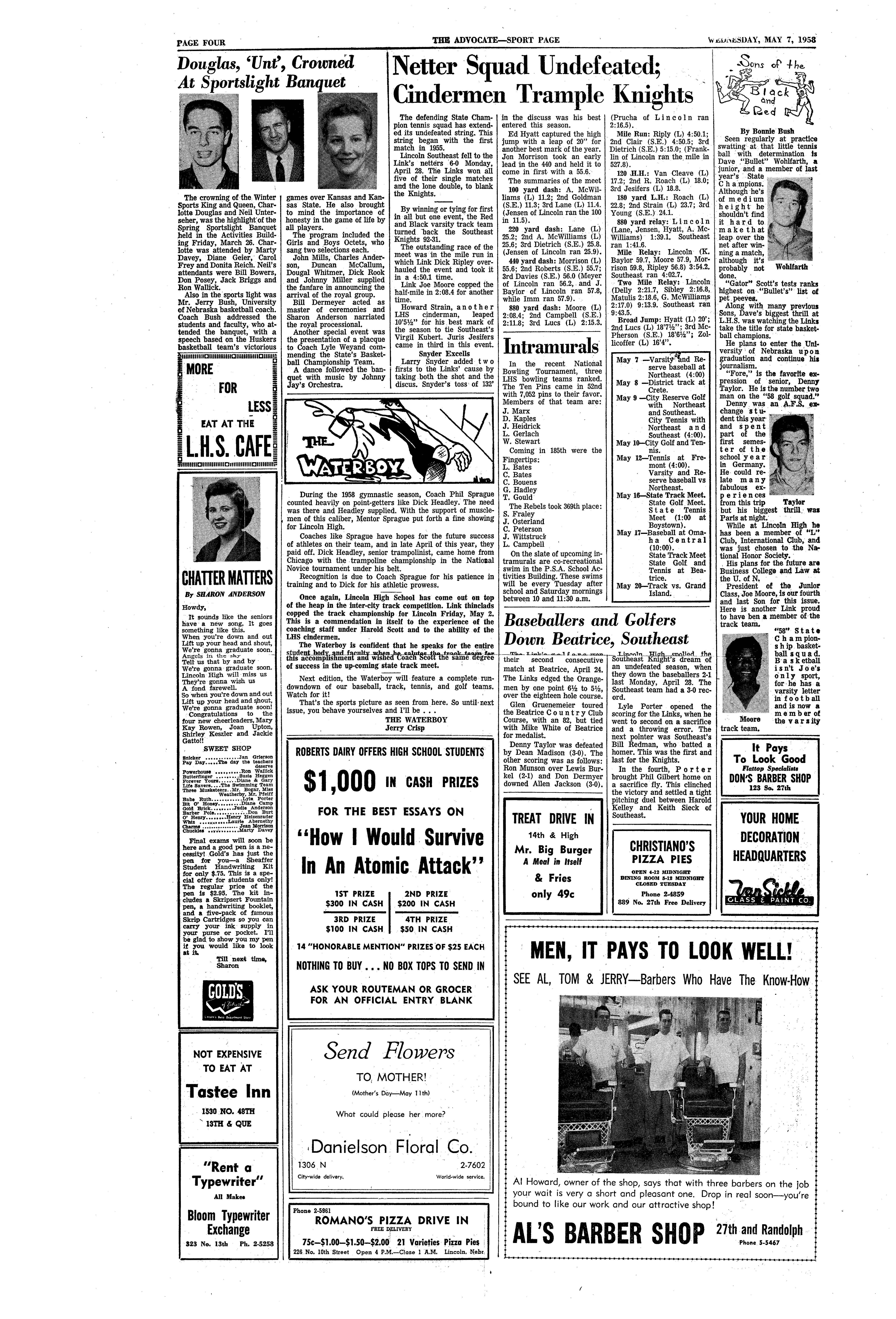 CLASS A SINGLES Semi flnal11-Nei1Unterseher.Lincoln High. Central.defeatedDougMarteeny_Omaha 6-0, 6-0. Bob Colwell,Grand Island,defeatedSteveGleason,Hastings, ,.s.7•5.Flnal11-Unterseherdefeated Colwell, l-0, 6-1. CLASS A DOUBLES Semi finals-Gene Idcka-JackLieb. Omaha central, defeatedBill Reichen-llert-SteveVanney,Scottsbluff.6-3,3-G. '1·5- MarkGlgena-DaveWolfarth ; LincolnHigh,defeatedDonSmlth•DiCk·Whitney. LincolnSontheast,7.5, 7•5. Flnals-Gigena-WolfarthdefeatedLlcka•Lieb, fi.11,6-Z. Undefeated, The Lincoln High varsity . tennis squad completed a very successful season with a record of 10 wins, no ties, and no defeats. Five members of the n;etters placed in the annual city tennis tournament. Neil' Unterseher defeated Southeast's Bruce Anderson, 6-0, 6-0, for the singles crown, and both Links doubles teams ranked first · positions. Dave Wohlfarth-Dick Gibson downed Bruce Sloan-Dean Beebe of Lincoln Northeast, and Ray Bowlet-Bob Hewes defeated Rich Woods-Mike Miller of Lincoln Southeast. How they scored: Slna:les:Groni>I-Bruce Anderson.SE. def. GeneHart. NE,6-3,6-3;NeilUnter- ""her.·LHS, def_ Anderson,6-0. 6-0; Unterseherdef. H.art. 6-0, 6-0.Group2- !MarkGigena,LHS,def. GeraldSnook, ~!;,:.;?·tJ.= 6~~ss:~im~~- ::t Snook,6'-0, 6-0. · Donbl~: Group!-Dick Whitney-DonSmith,S7,def.BruceSloan-DeanBeebe, NE, 6-0, 6-4; DaveWohlfarth-DickGib' son. LHS,def. Wohµarth-GibsonWhitney-Smith,6-1,6-3; def. Sloan-Beebe,6-0, ~1. Group2-R0y Howlett-BobHewes, LHS, def. RonStrawn.StanFoster,NE, 6·0, 6-0; Howlett-Hewesdef.·RichWoods,· ~GFRRIN~ I · 8HliAPl'ER SPECIAL •.• STUDENTS ONL"t •3.44 VALUE NOW, LIMITED TIME ONL.Y