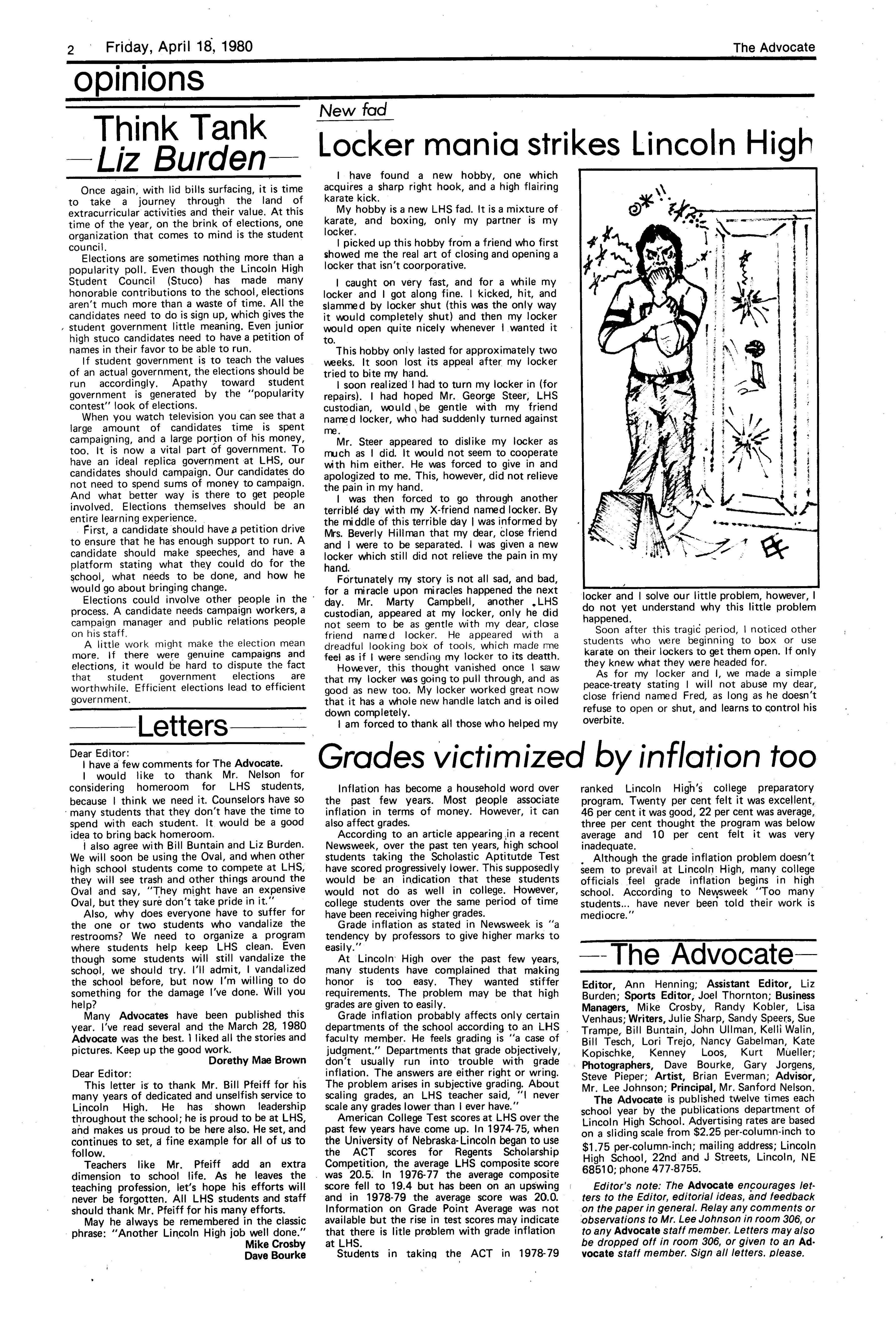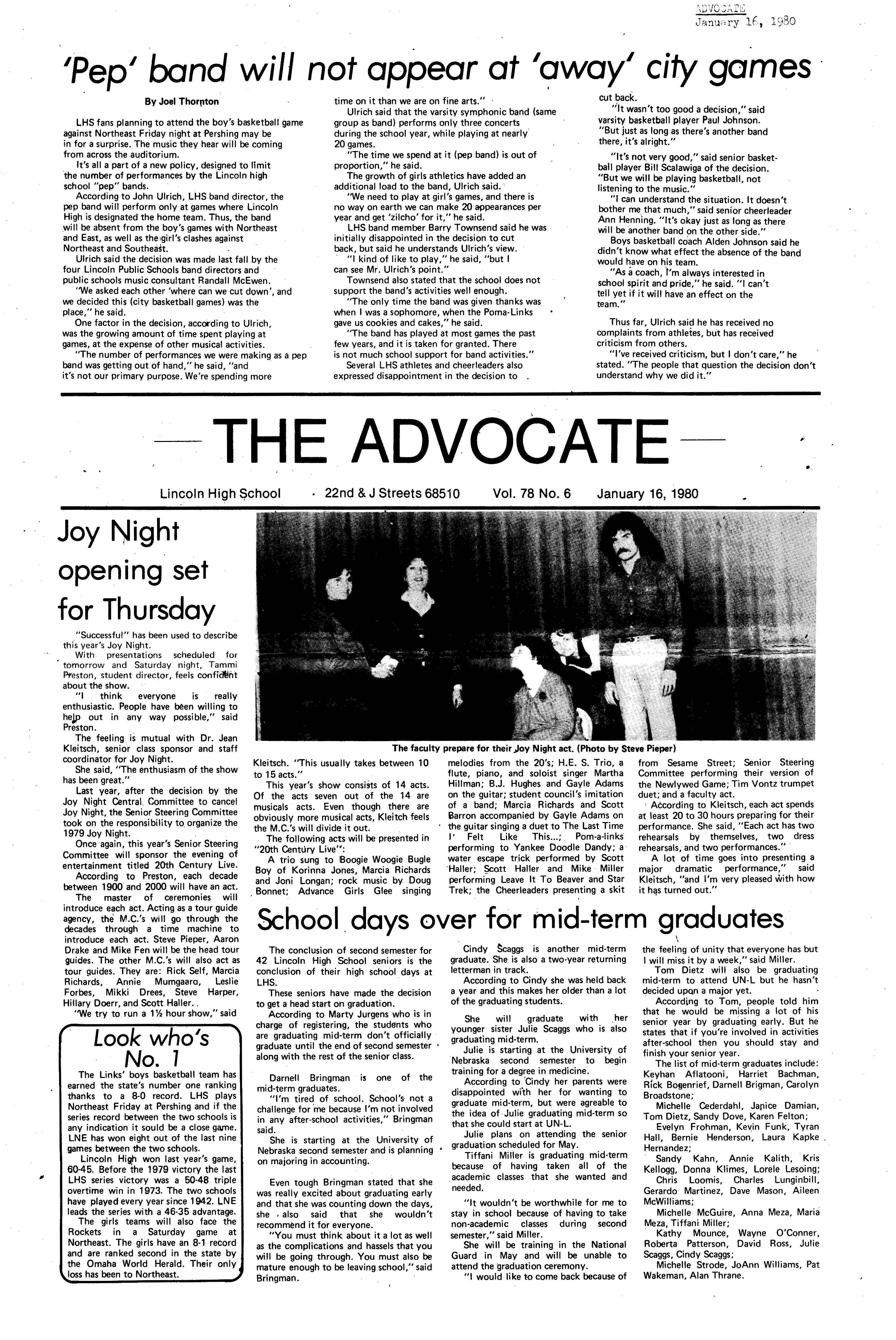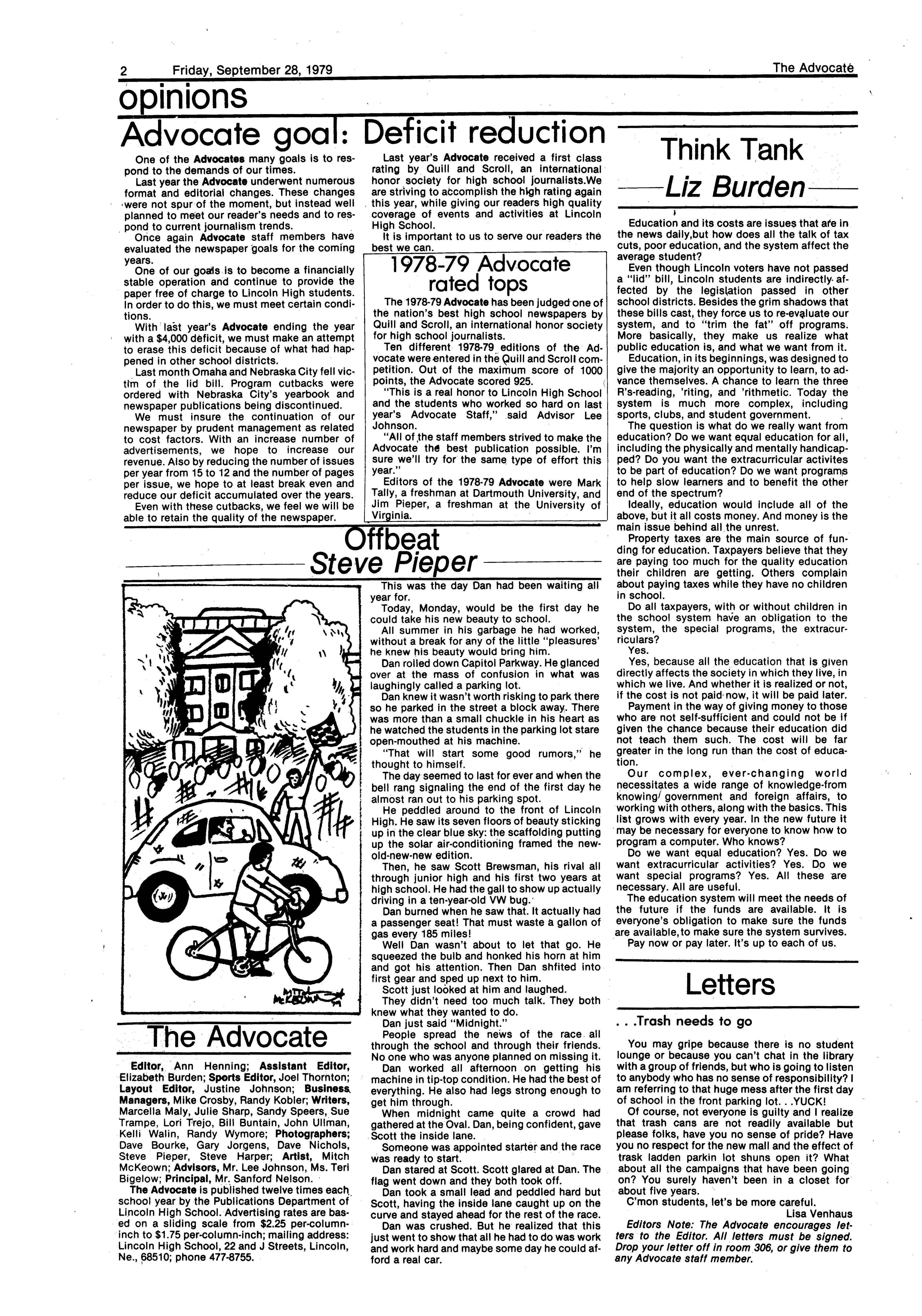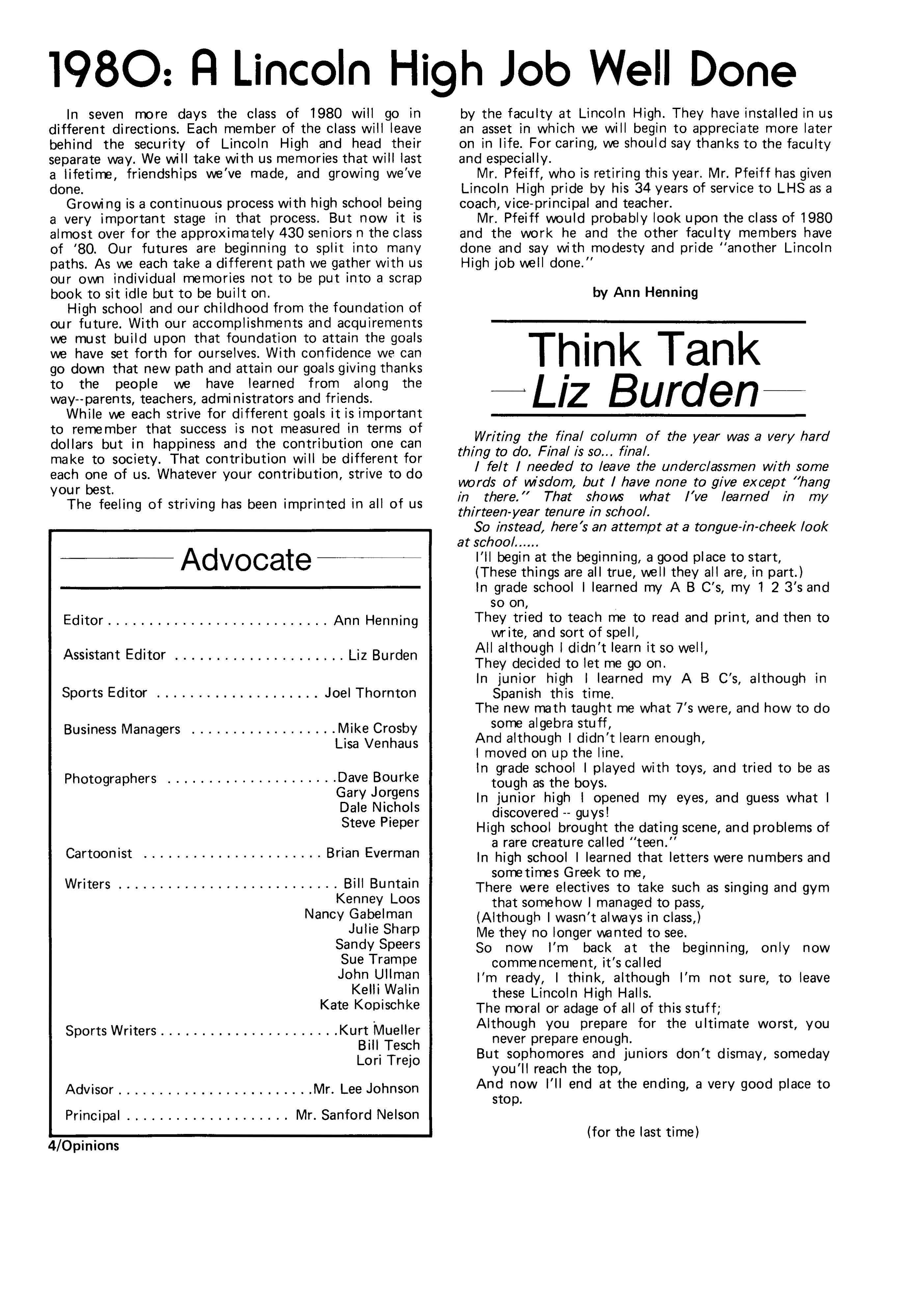 Edlte>r,· Ann Henning; Assistant Editor, Elizabeth Burden; Sports Editor, Joel Thornton; ·Layout Editor, Justine Johnson; Business. Managers, Mike Crosby, Randy Kobler; Writers, Marcella Maly, Julie Sharp, Sandy Speers, Sue lrampe, Lori l1rejo, Bill Buntain, John Ullman, Kelli Walin, Randy Wymore; Photographers; Dave Bourke, Gary Jorgens, Dave Nichols, Steve Pieper, Steve Harper; Artist, Mitch McKeown; Advisors,Mr. Lee Johnson, Ms. Teri Bigelow; Principal, Mr Sanford Nelson~ · The Advocateis published twelve times each • school year by the Publications Department of Ll ncoln High School. Advertising rates are based on a sliding scale from $2.25 per-column- • inch to $1.75 per-column-inch; mailing address: Lincoln High School, 22 and J Streets, Lincoln, Ne., 68510; phone 477-8755. I