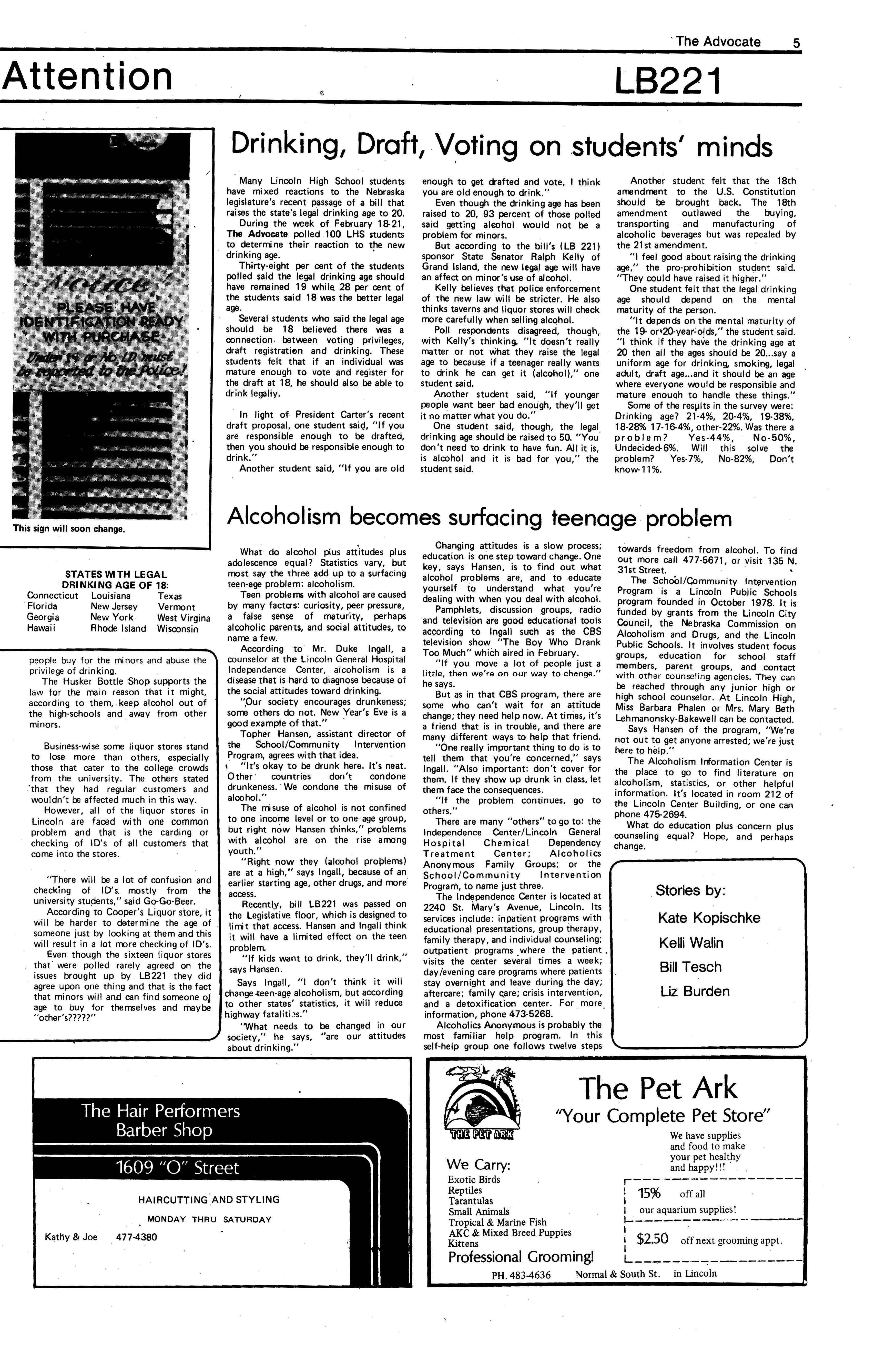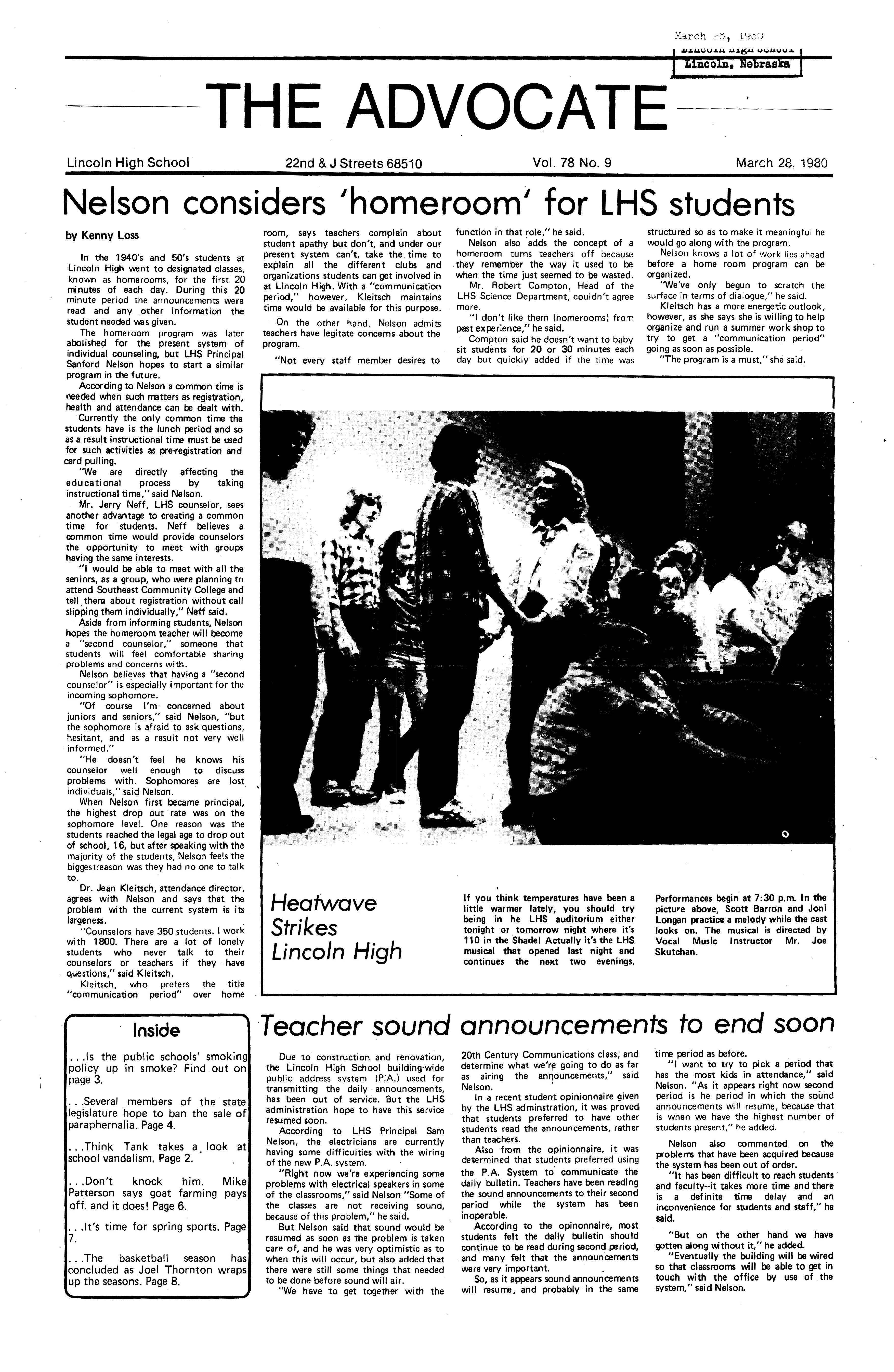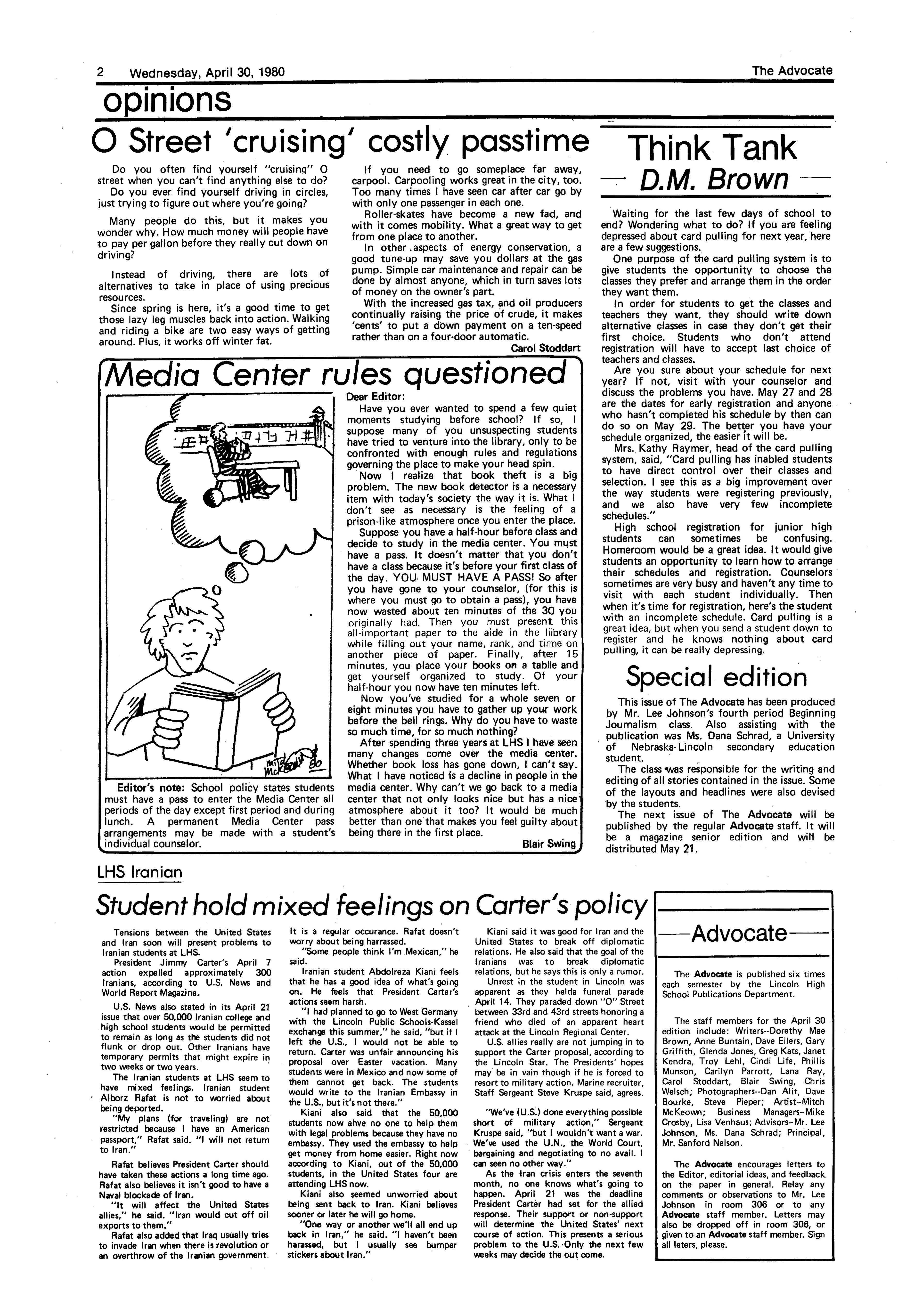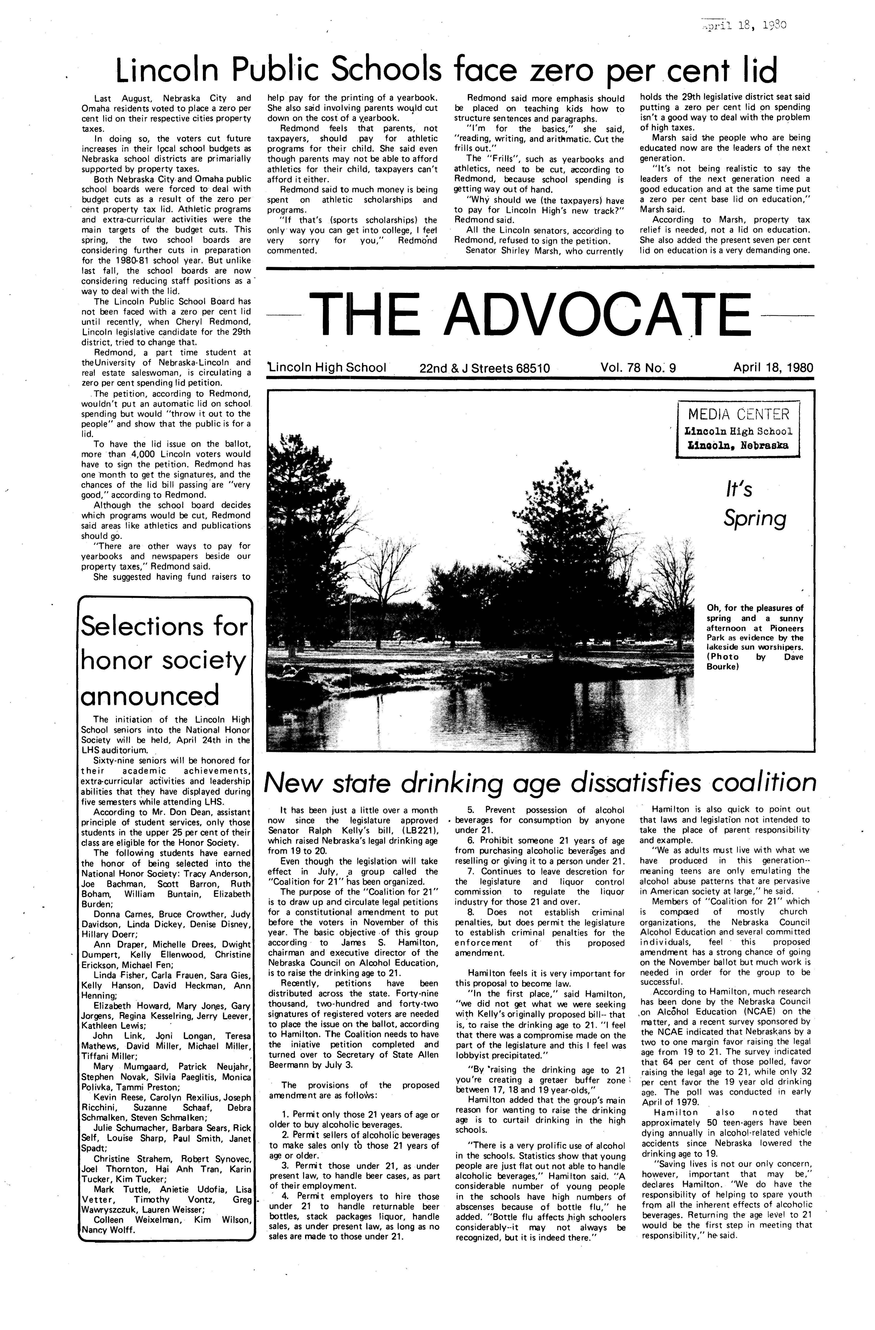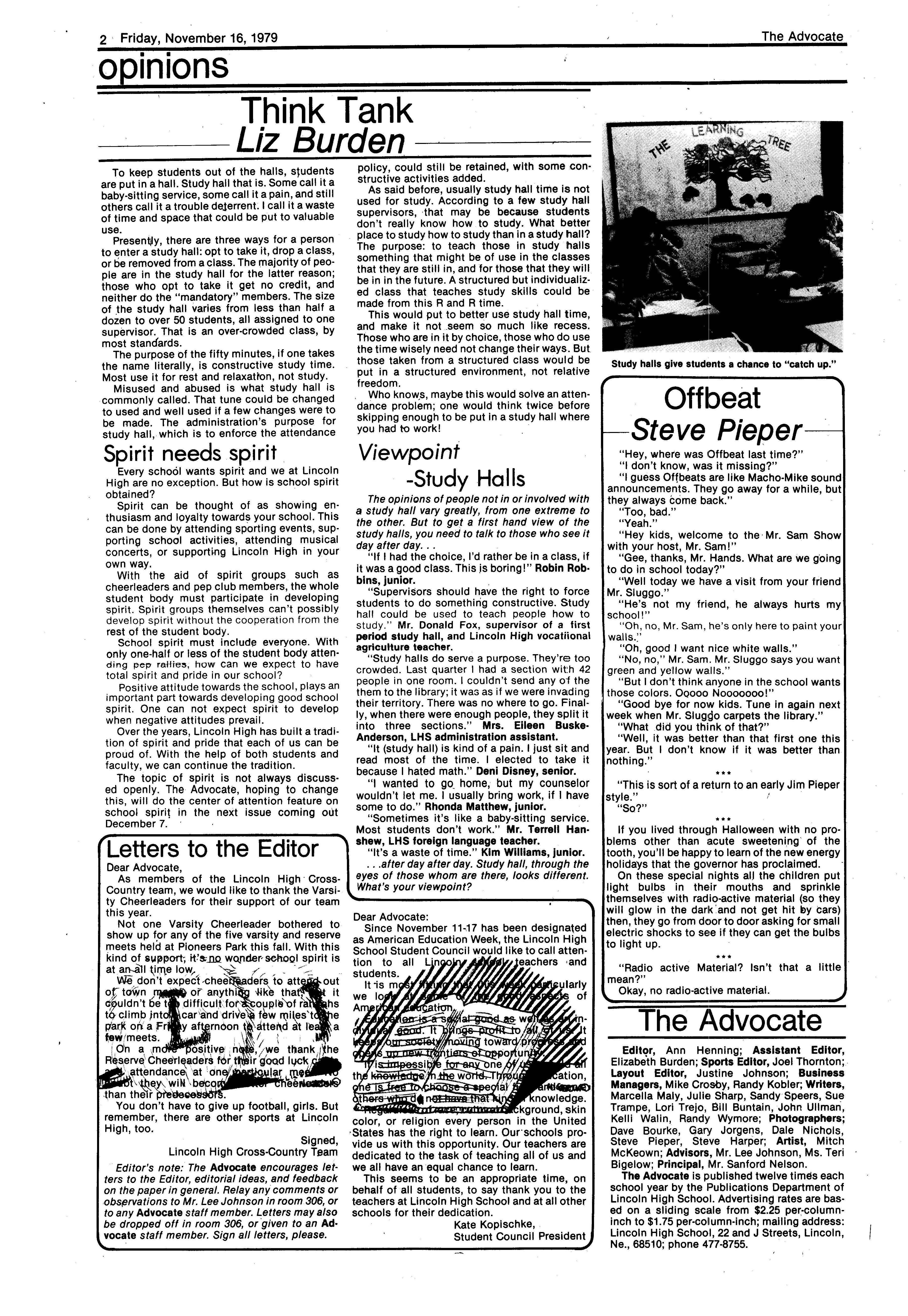 Edlte>r,· Ann Henning; Assistant Editor, Elizabeth Burden; Sports Editor, Joel Thornton; ·Layout Editor, Justine Johnson; Business. Managers, Mike Crosby, Randy Kobler; Writers, Marcella Maly, Julie Sharp, Sandy Speers, Sue lrampe, Lori l1rejo, Bill Buntain, John Ullman, Kelli Walin, Randy Wymore; Photographers; Dave Bourke, Gary Jorgens, Dave Nichols, Steve Pieper, Steve Harper; Artist, Mitch McKeown; Advisors,Mr. Lee Johnson, Ms. Teri Bigelow; Principal, Mr Sanford Nelson~ · The Advocateis published twelve times each • school year by the Publications Department of Ll ncoln High School. Advertising rates are based on a sliding scale from $2.25 per-column- • inch to $1.75 per-column-inch; mailing address: Lincoln High School, 22 and J Streets, Lincoln, Ne., 68510; phone 477-8755. I