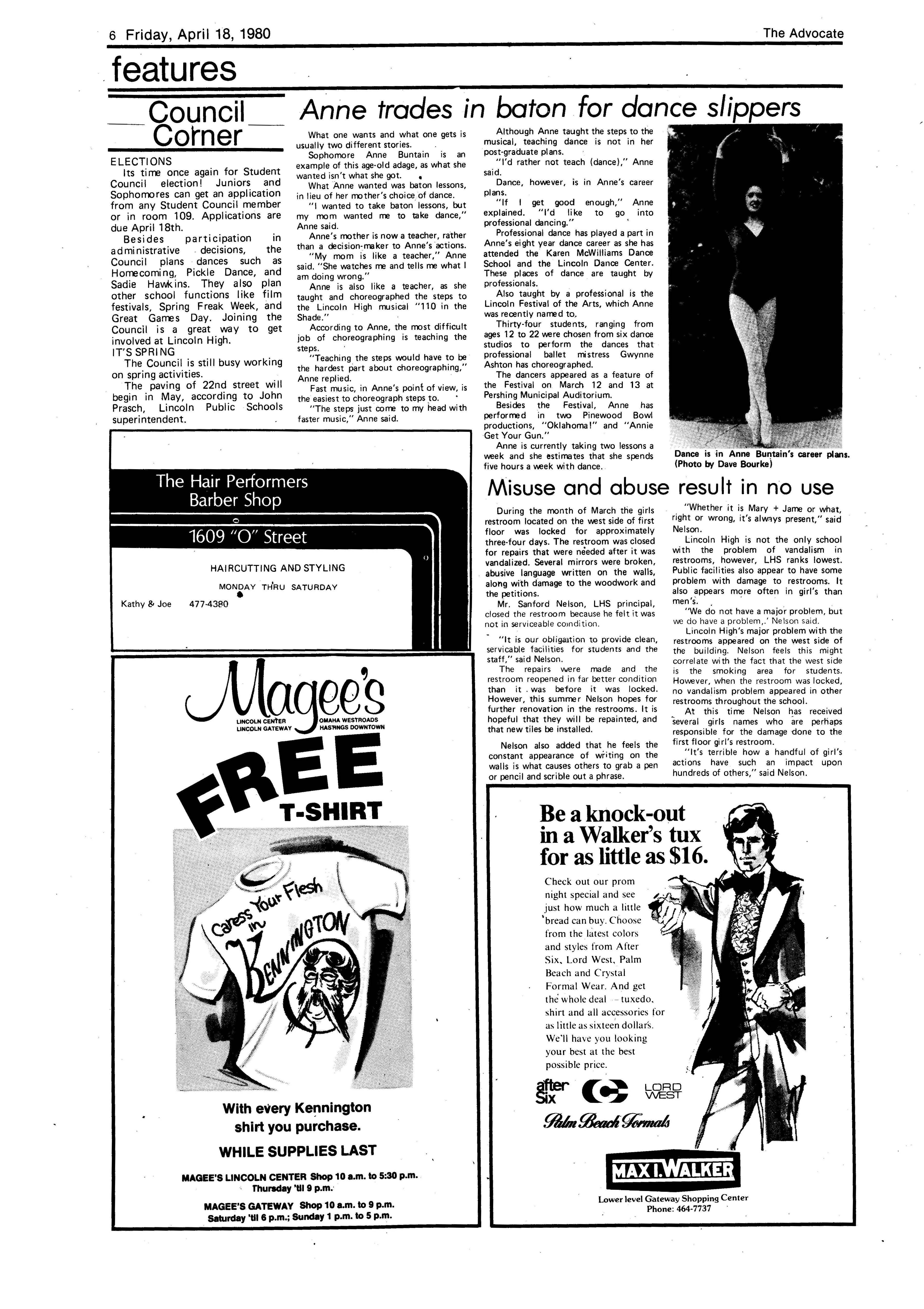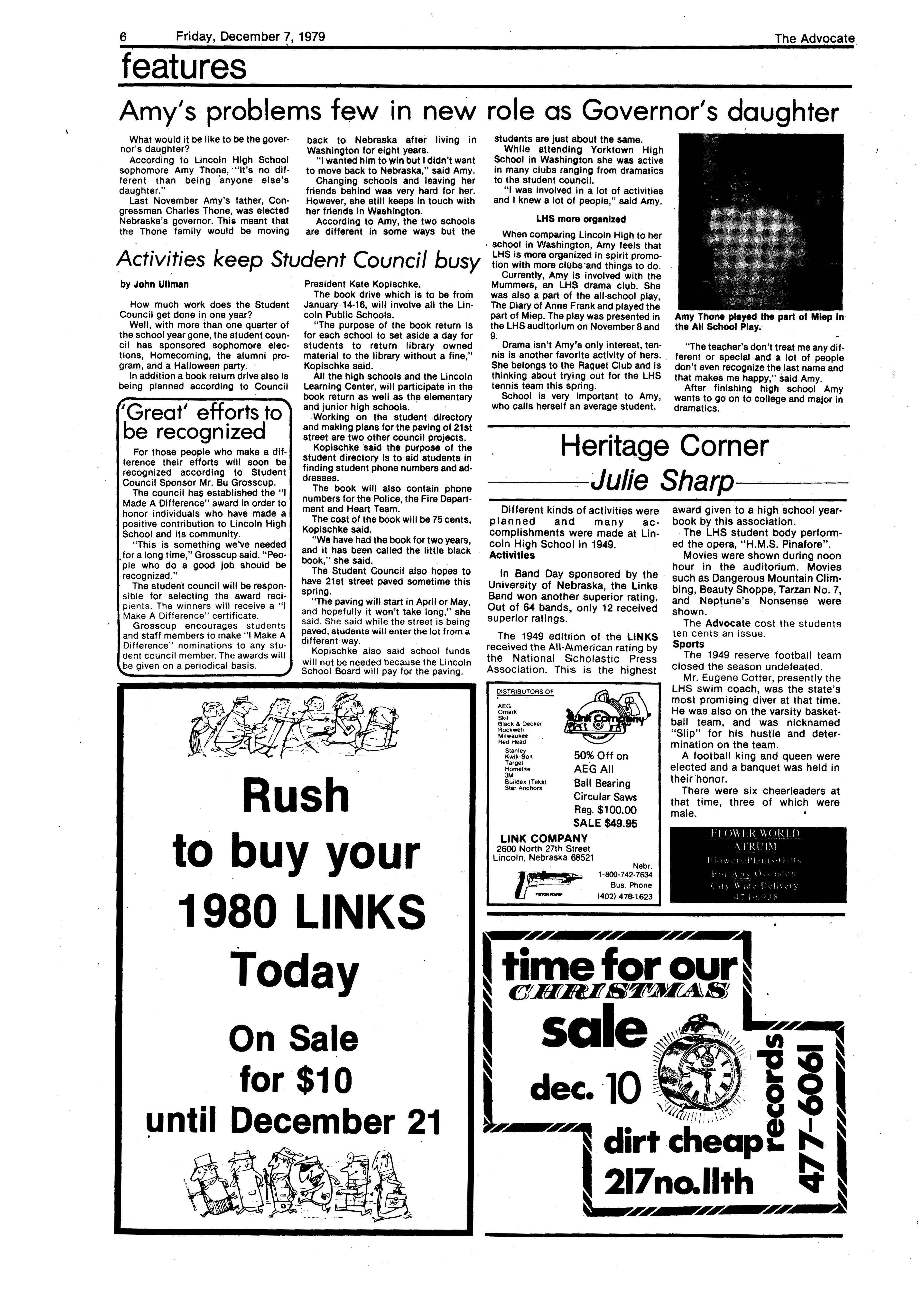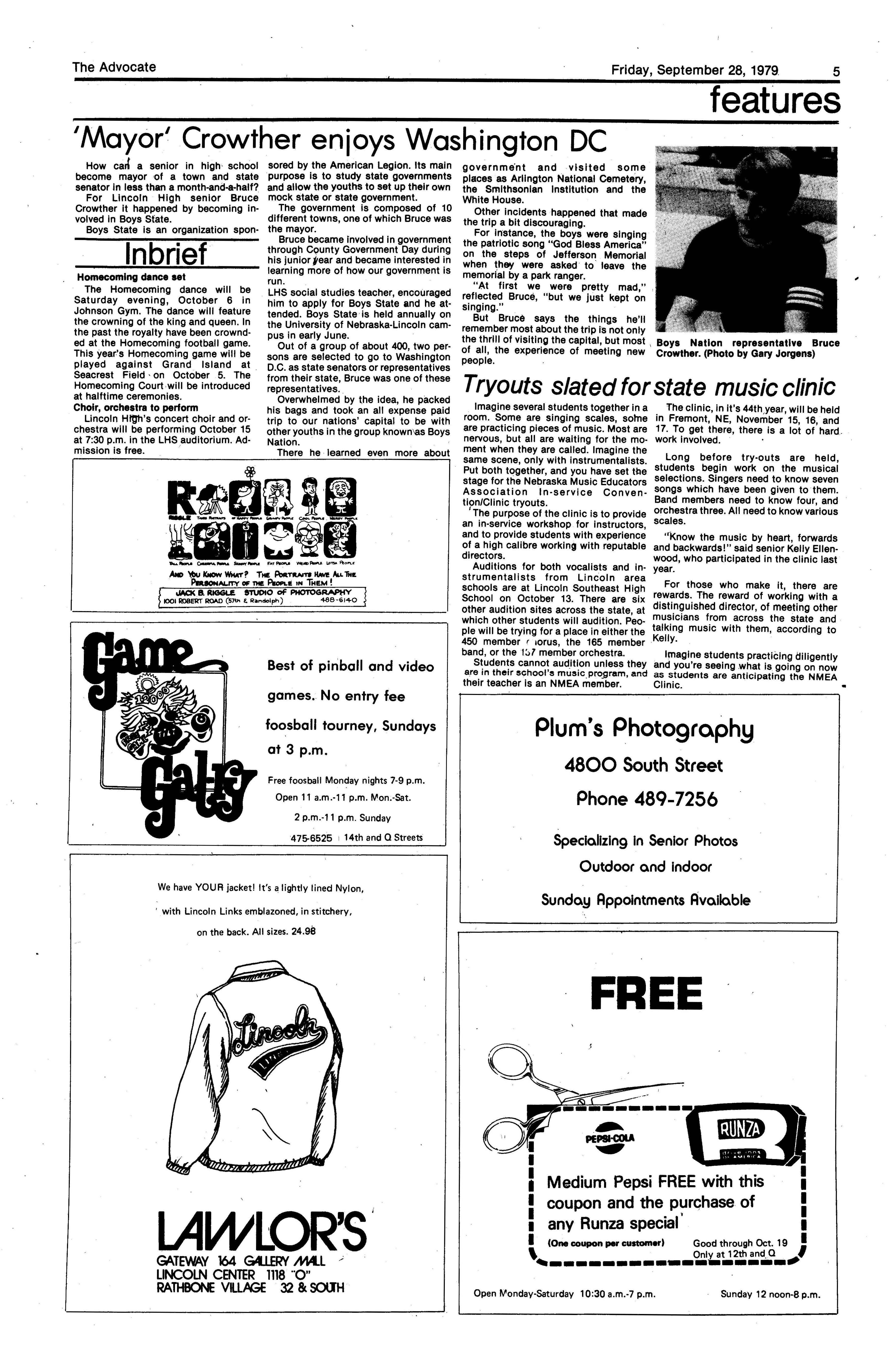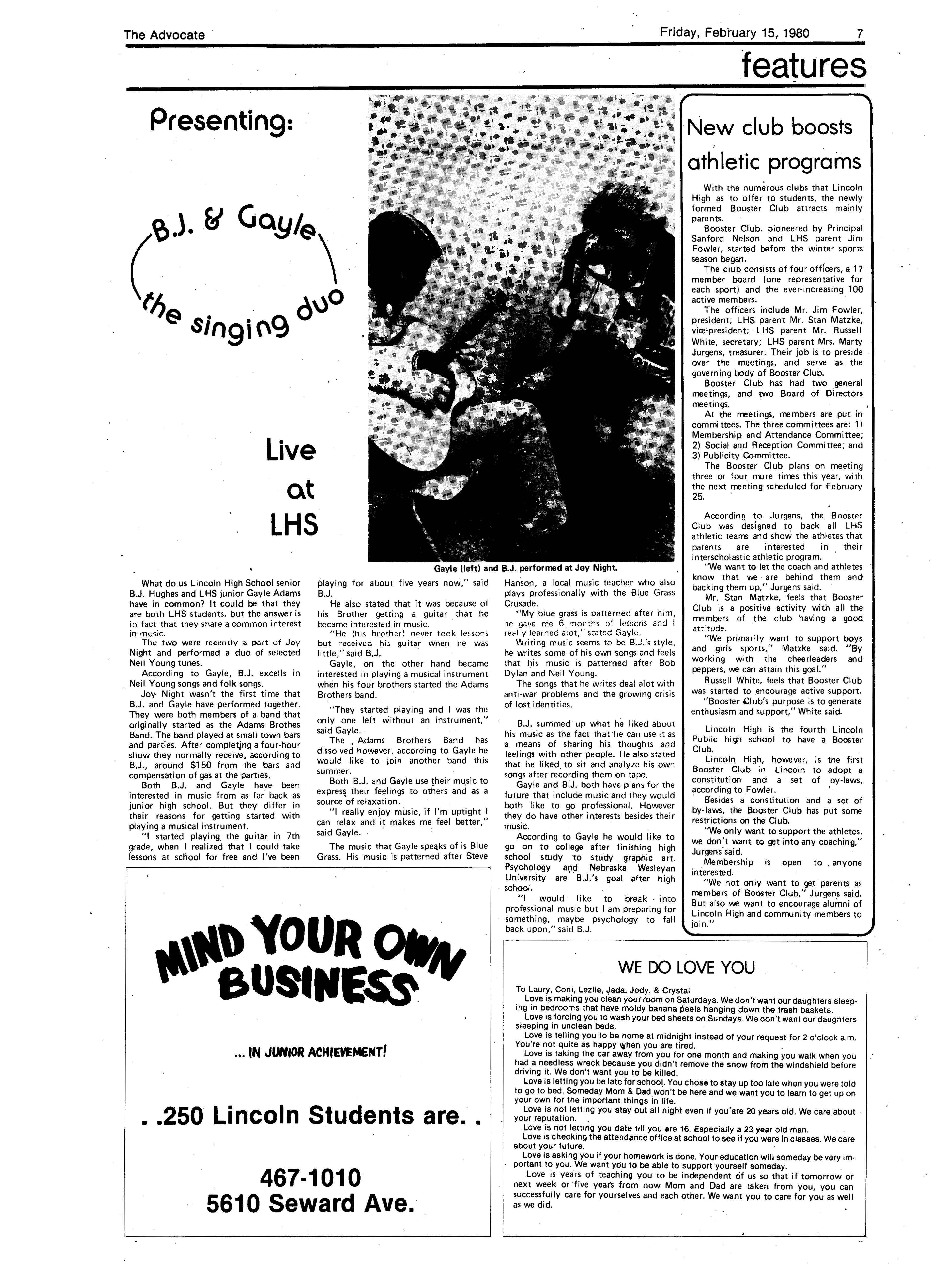 Edlte>r,· Ann Henning; Assistant Editor, Elizabeth Burden; Sports Editor, Joel Thornton; ·Layout Editor, Justine Johnson; Business. Managers, Mike Crosby, Randy Kobler; Writers, Marcella Maly, Julie Sharp, Sandy Speers, Sue lrampe, Lori l1rejo, Bill Buntain, John Ullman, Kelli Walin, Randy Wymore; Photographers; Dave Bourke, Gary Jorgens, Dave Nichols, Steve Pieper, Steve Harper; Artist, Mitch McKeown; Advisors,Mr. Lee Johnson, Ms. Teri Bigelow; Principal, Mr Sanford Nelson~ · The Advocateis published twelve times each • school year by the Publications Department of Ll ncoln High School. Advertising rates are based on a sliding scale from $2.25 per-column- • inch to $1.75 per-column-inch; mailing address: Lincoln High School, 22 and J Streets, Lincoln, Ne., 68510; phone 477-8755. I