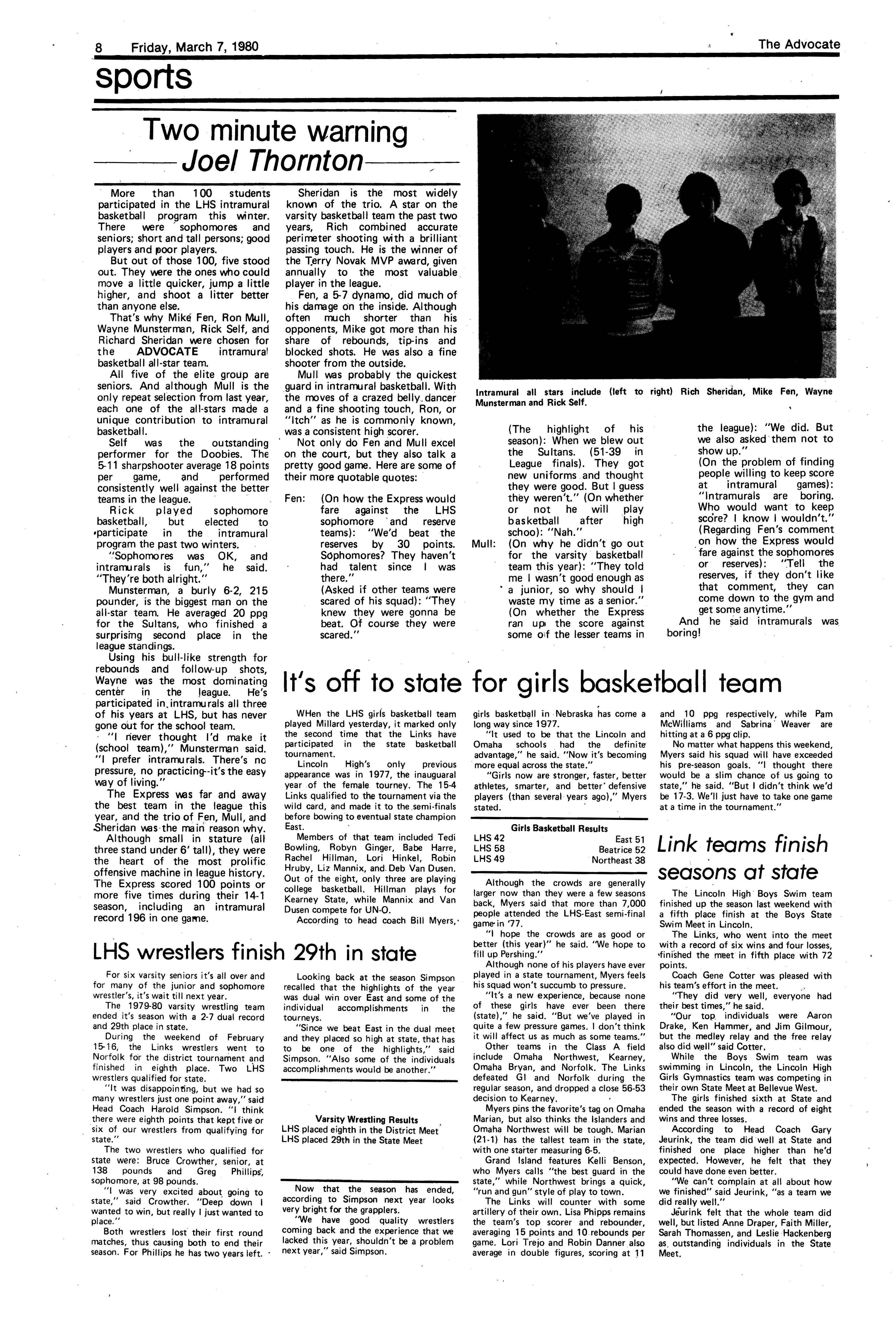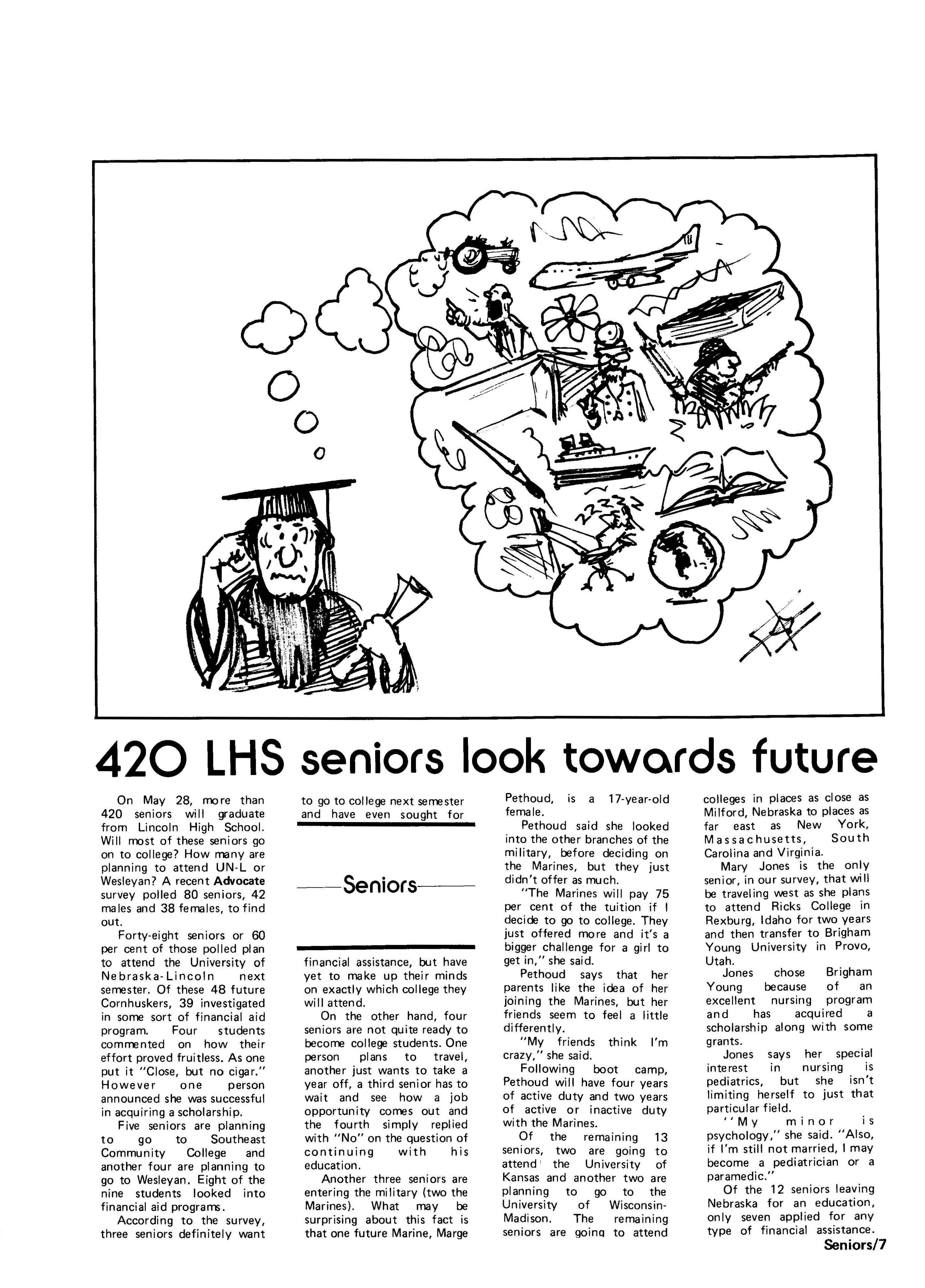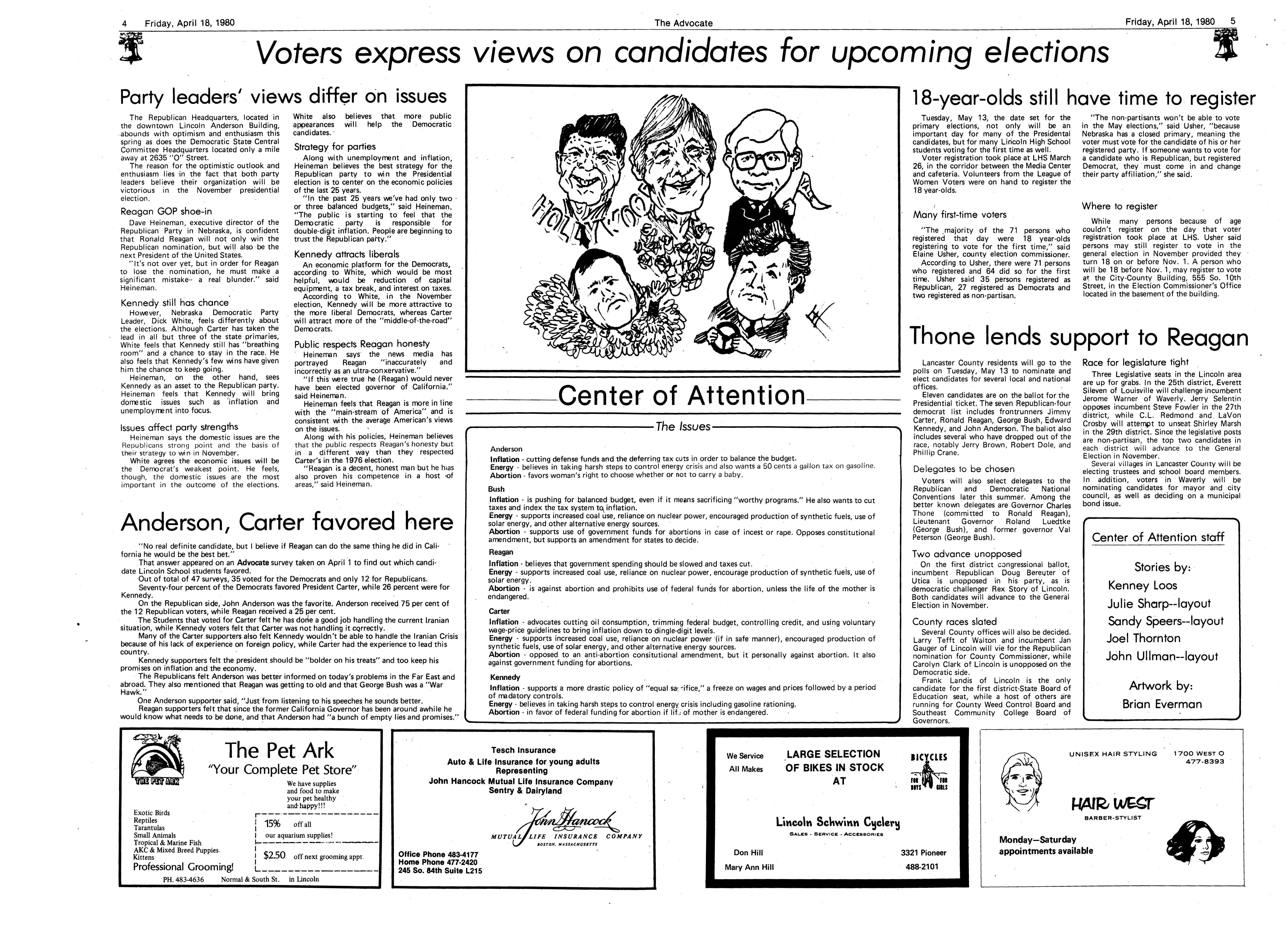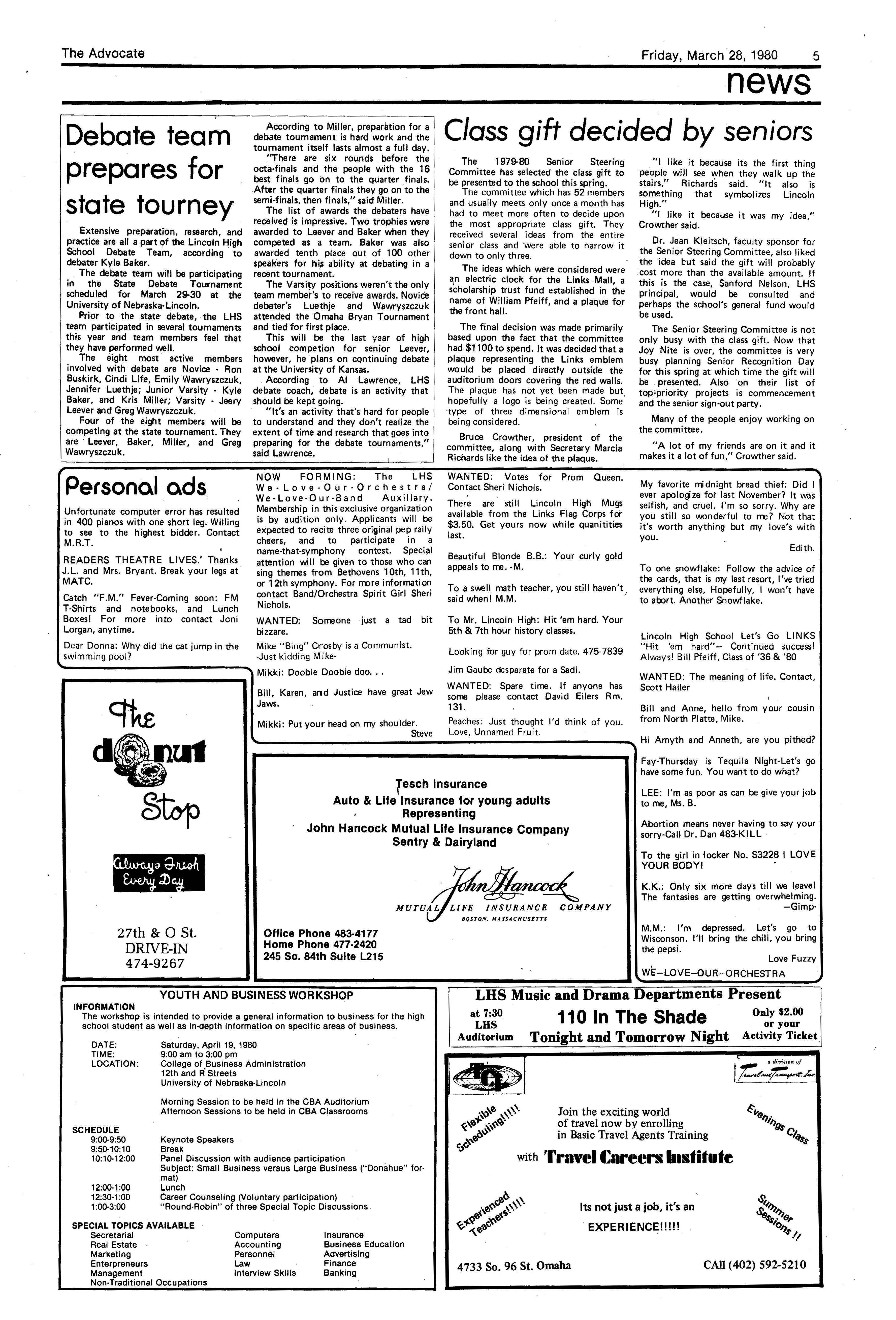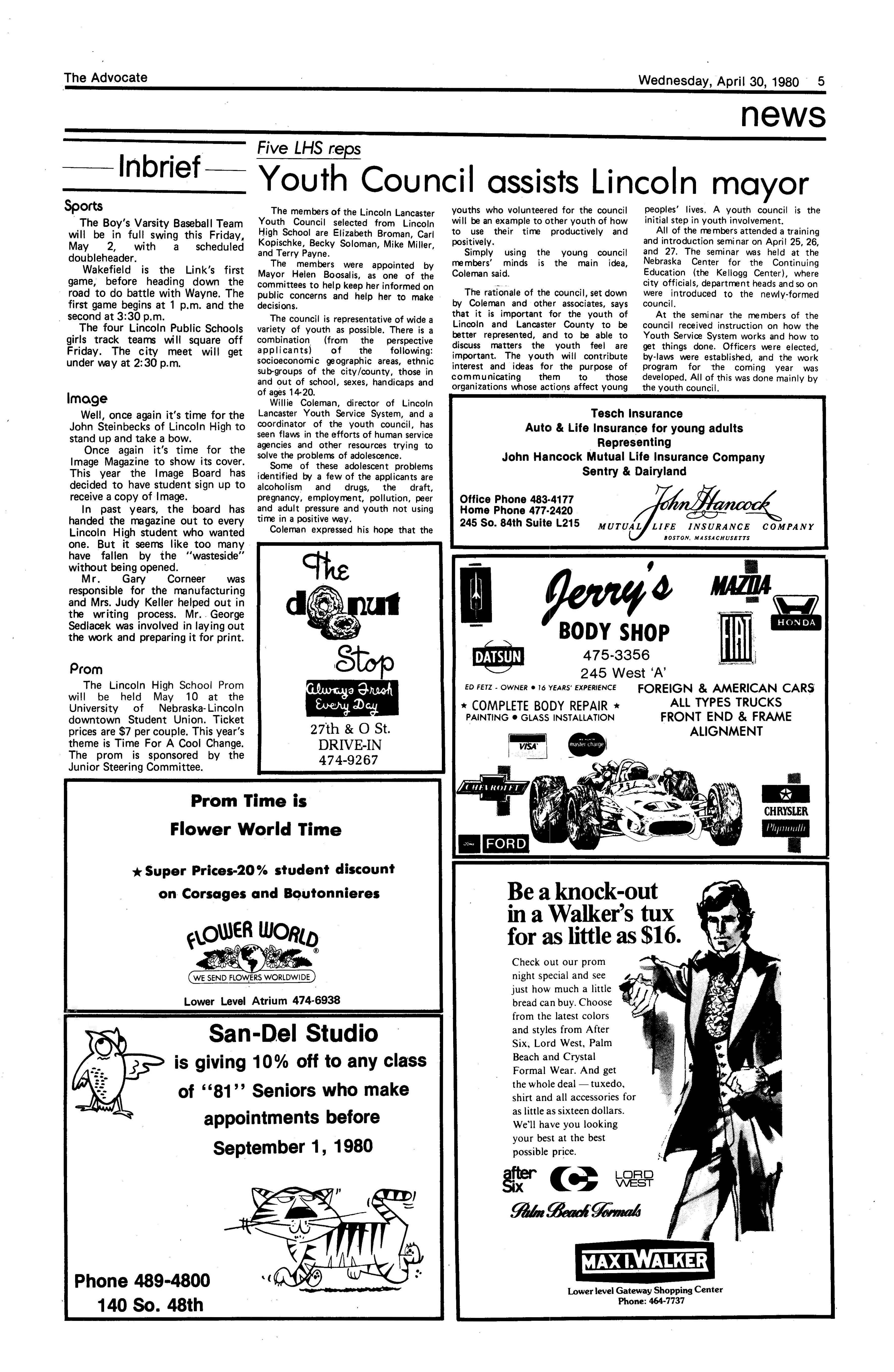 Edlte>r,· Ann Henning; Assistant Editor, Elizabeth Burden; Sports Editor, Joel Thornton; ·Layout Editor, Justine Johnson; Business. Managers, Mike Crosby, Randy Kobler; Writers, Marcella Maly, Julie Sharp, Sandy Speers, Sue lrampe, Lori l1rejo, Bill Buntain, John Ullman, Kelli Walin, Randy Wymore; Photographers; Dave Bourke, Gary Jorgens, Dave Nichols, Steve Pieper, Steve Harper; Artist, Mitch McKeown; Advisors,Mr. Lee Johnson, Ms. Teri Bigelow; Principal, Mr Sanford Nelson~ · The Advocateis published twelve times each • school year by the Publications Department of Ll ncoln High School. Advertising rates are based on a sliding scale from $2.25 per-column- • inch to $1.75 per-column-inch; mailing address: Lincoln High School, 22 and J Streets, Lincoln, Ne., 68510; phone 477-8755. I