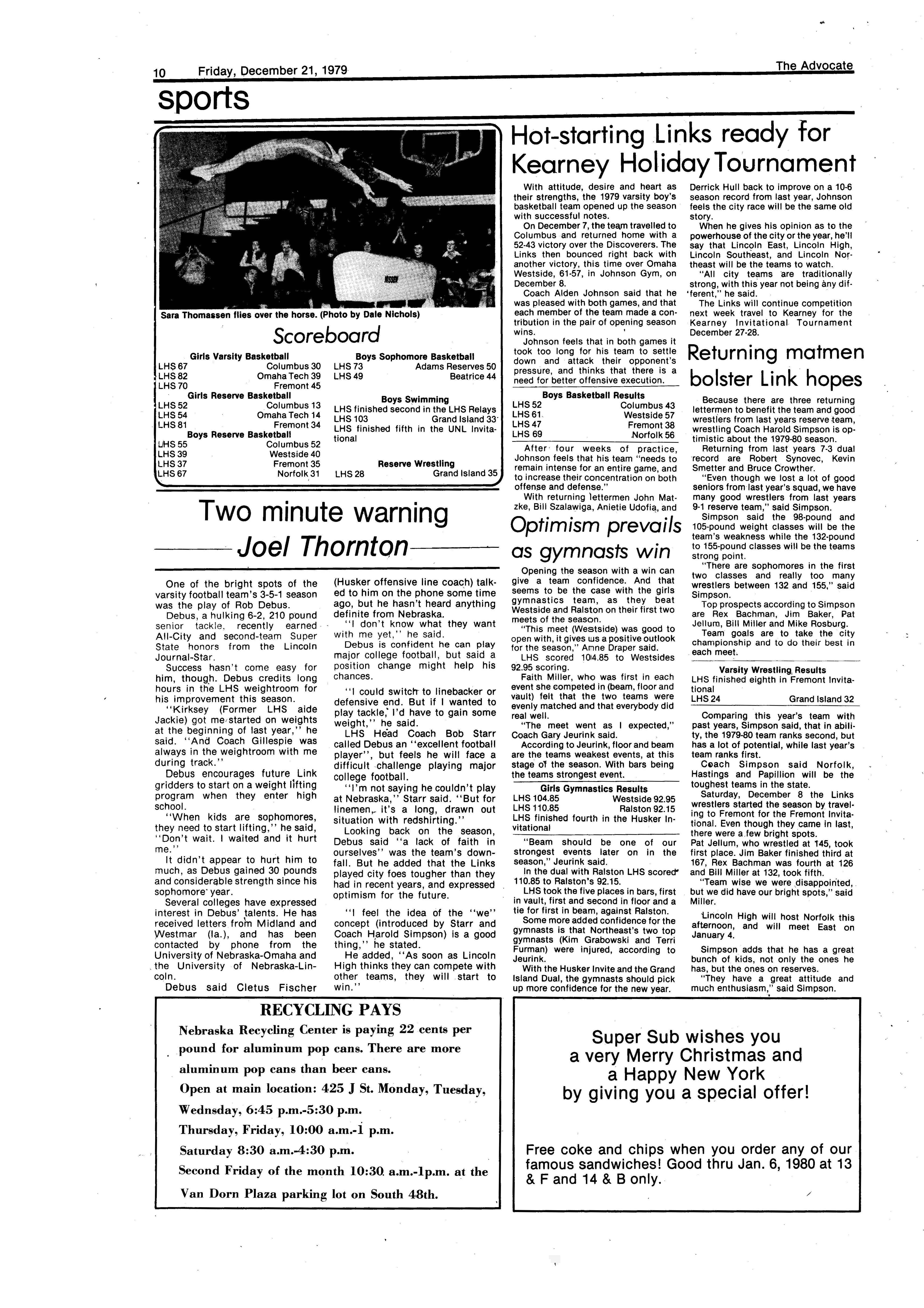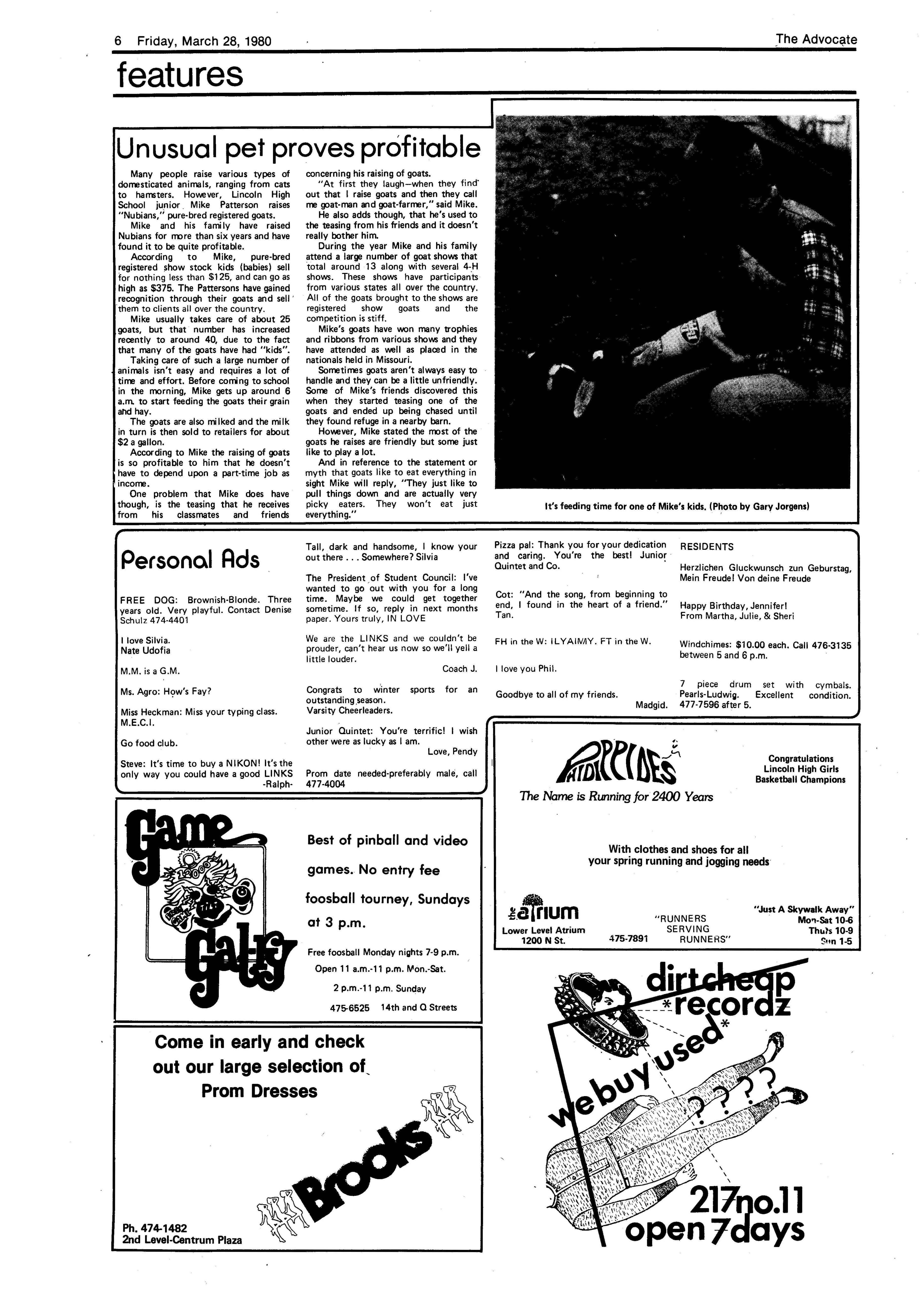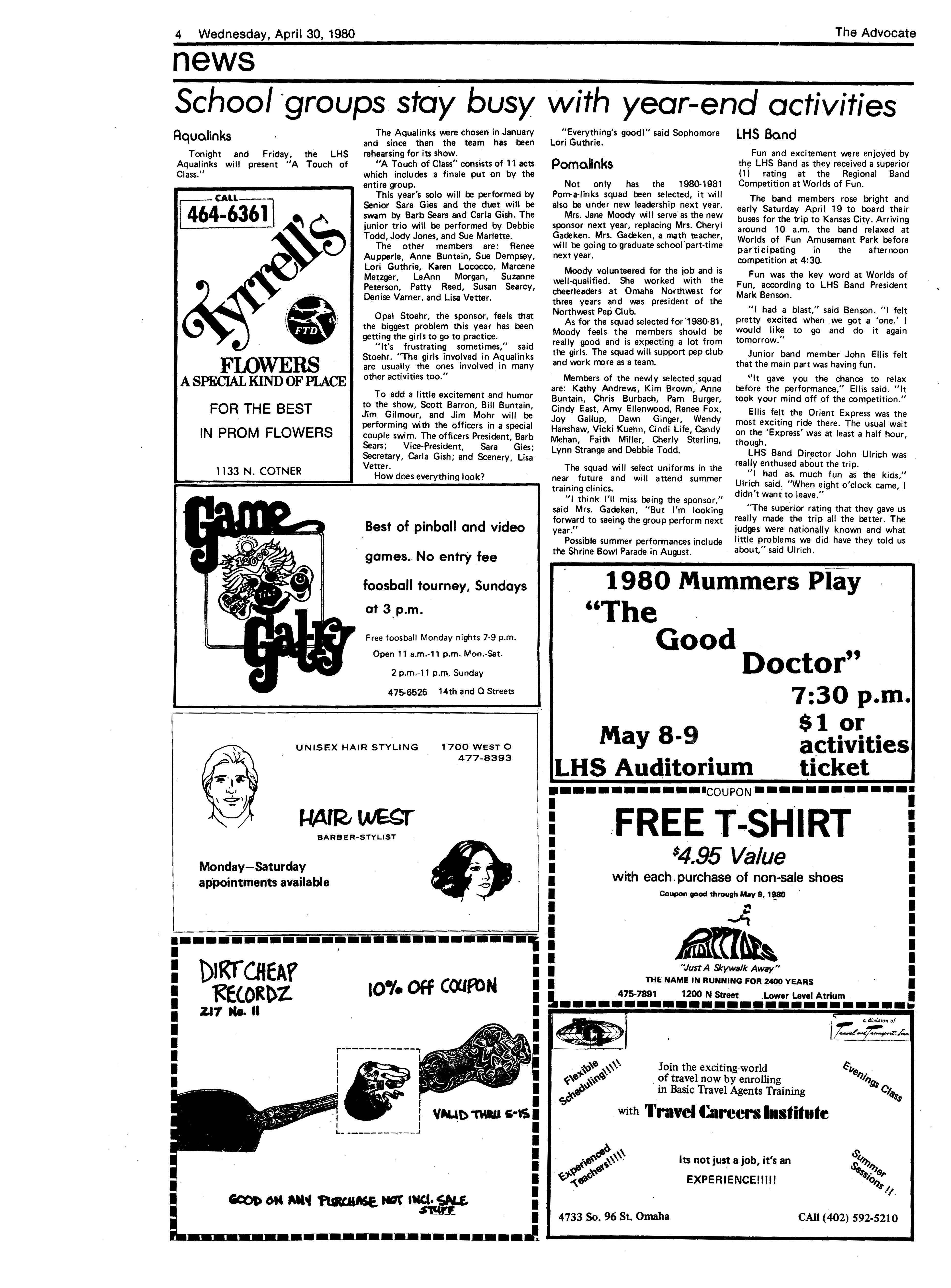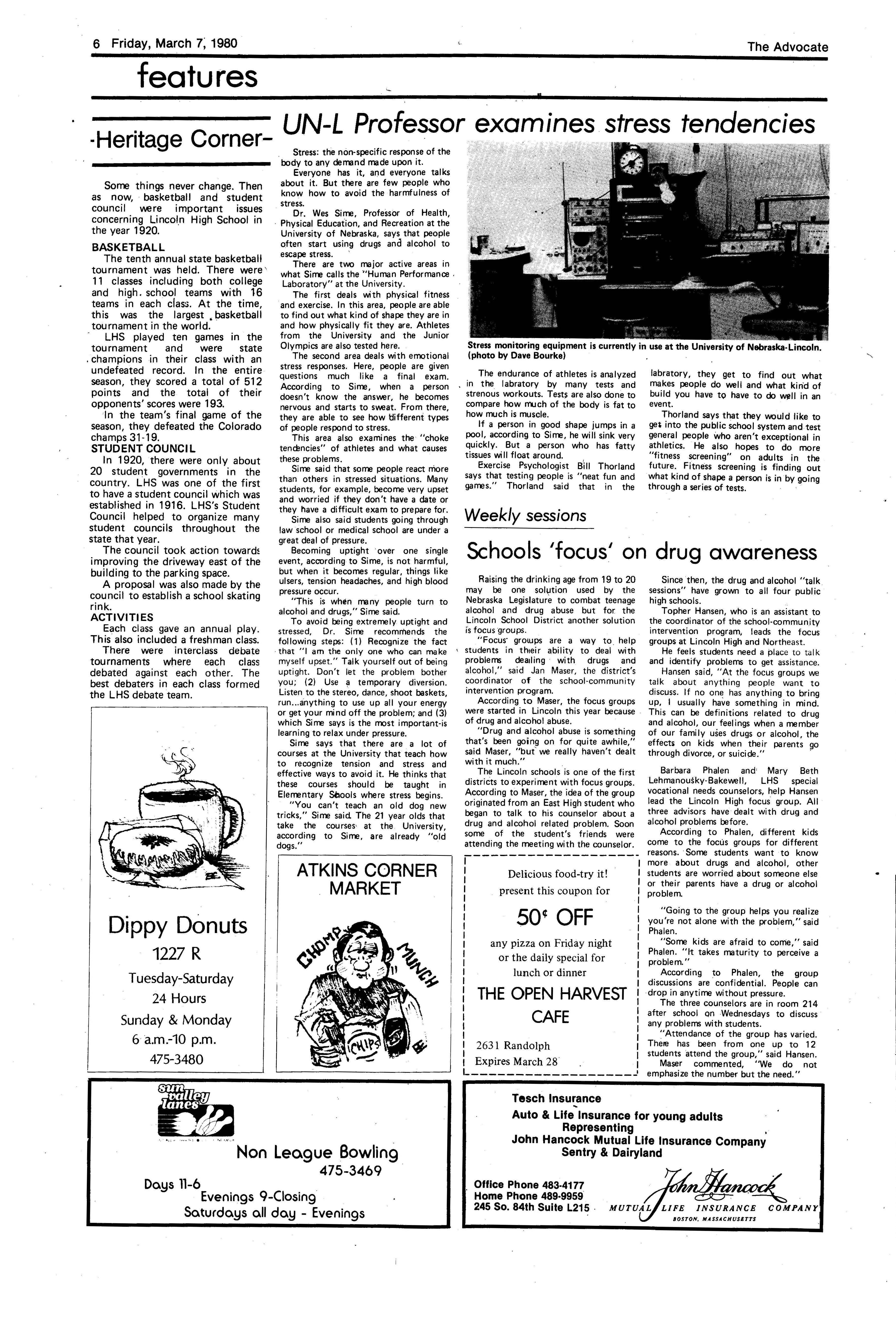 Edlte>r,· Ann Henning; Assistant Editor, Elizabeth Burden; Sports Editor, Joel Thornton; ·Layout Editor, Justine Johnson; Business. Managers, Mike Crosby, Randy Kobler; Writers, Marcella Maly, Julie Sharp, Sandy Speers, Sue lrampe, Lori l1rejo, Bill Buntain, John Ullman, Kelli Walin, Randy Wymore; Photographers; Dave Bourke, Gary Jorgens, Dave Nichols, Steve Pieper, Steve Harper; Artist, Mitch McKeown; Advisors,Mr. Lee Johnson, Ms. Teri Bigelow; Principal, Mr Sanford Nelson~ · The Advocateis published twelve times each • school year by the Publications Department of Ll ncoln High School. Advertising rates are based on a sliding scale from $2.25 per-column- • inch to $1.75 per-column-inch; mailing address: Lincoln High School, 22 and J Streets, Lincoln, Ne., 68510; phone 477-8755. I