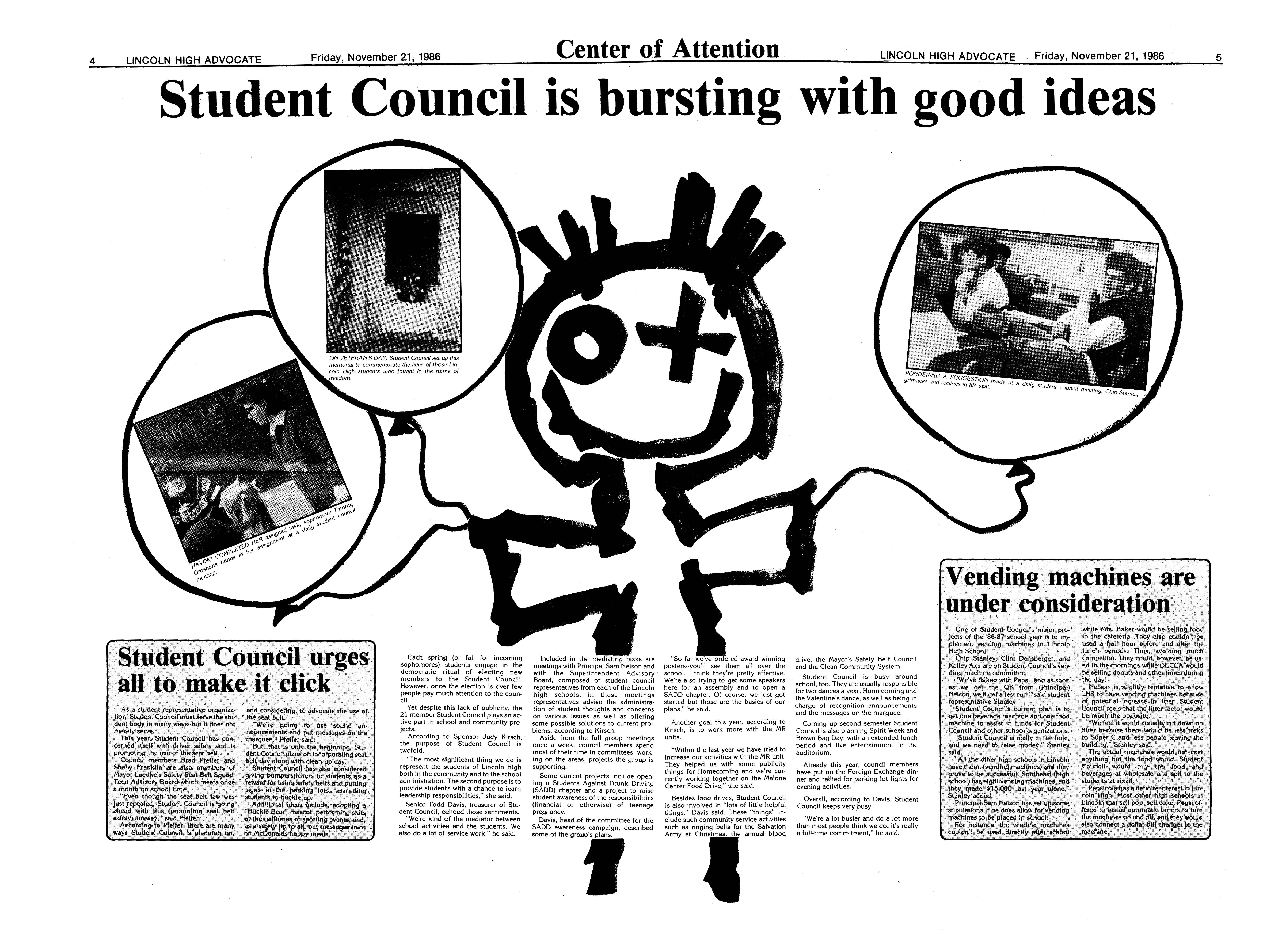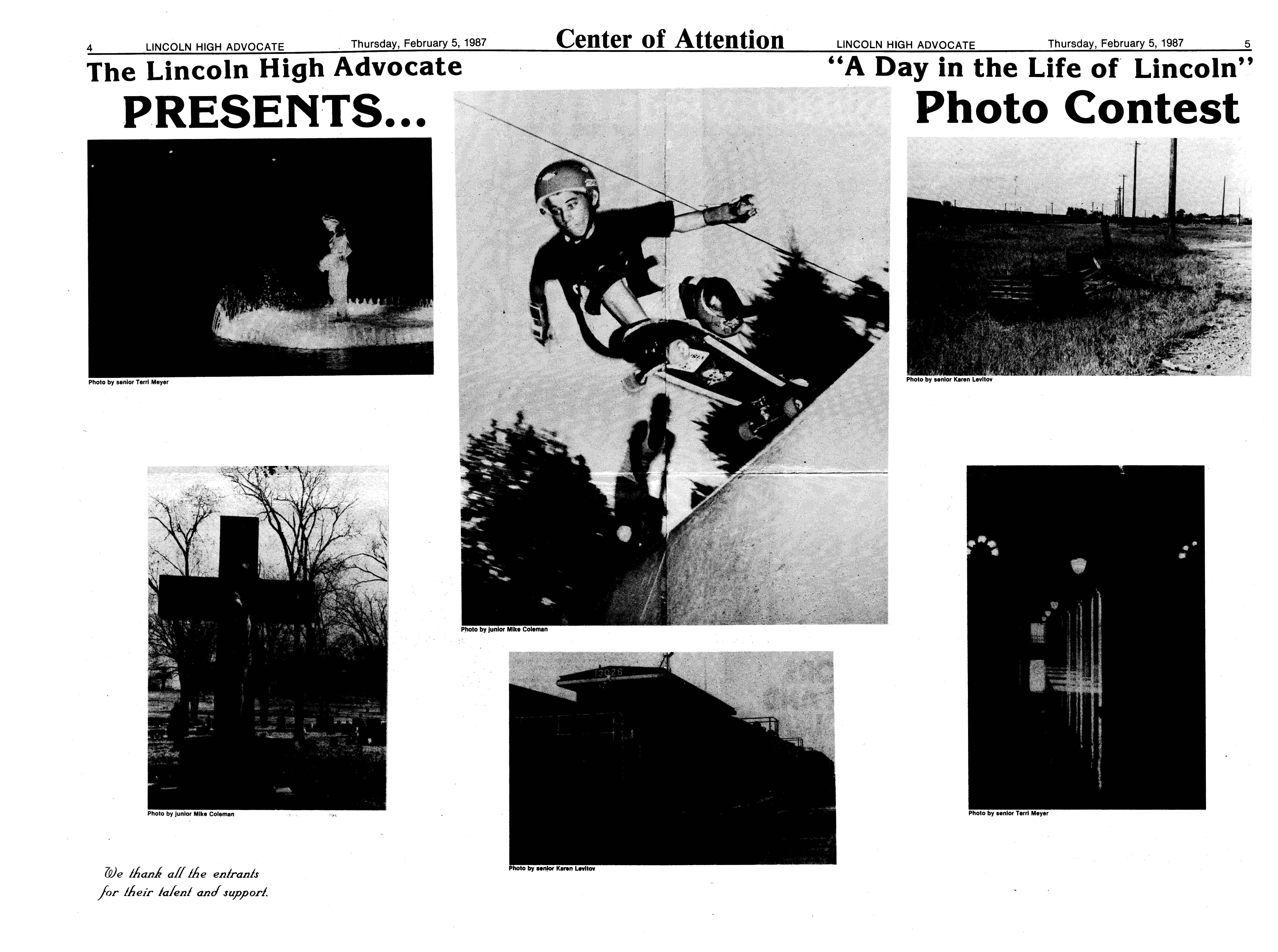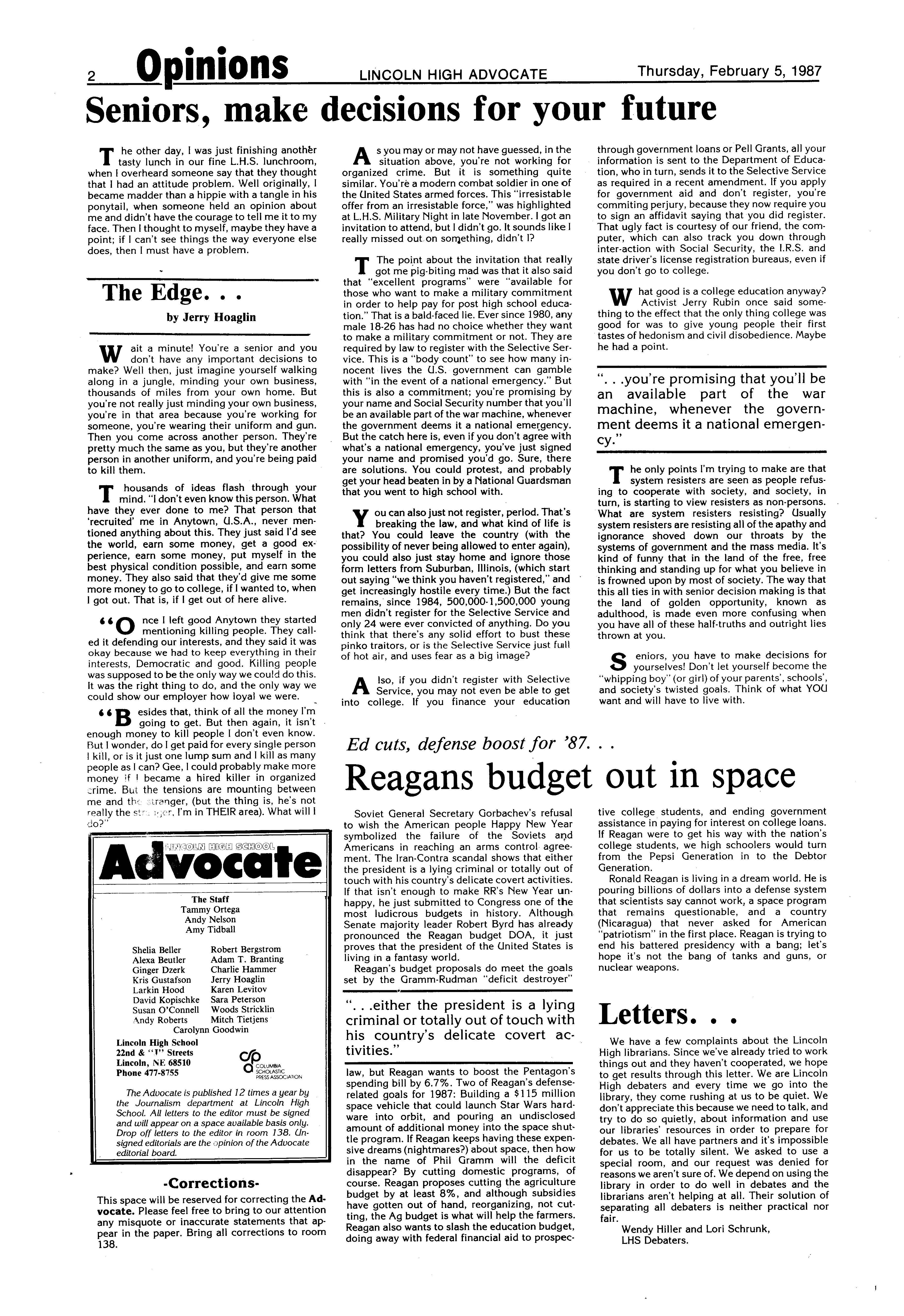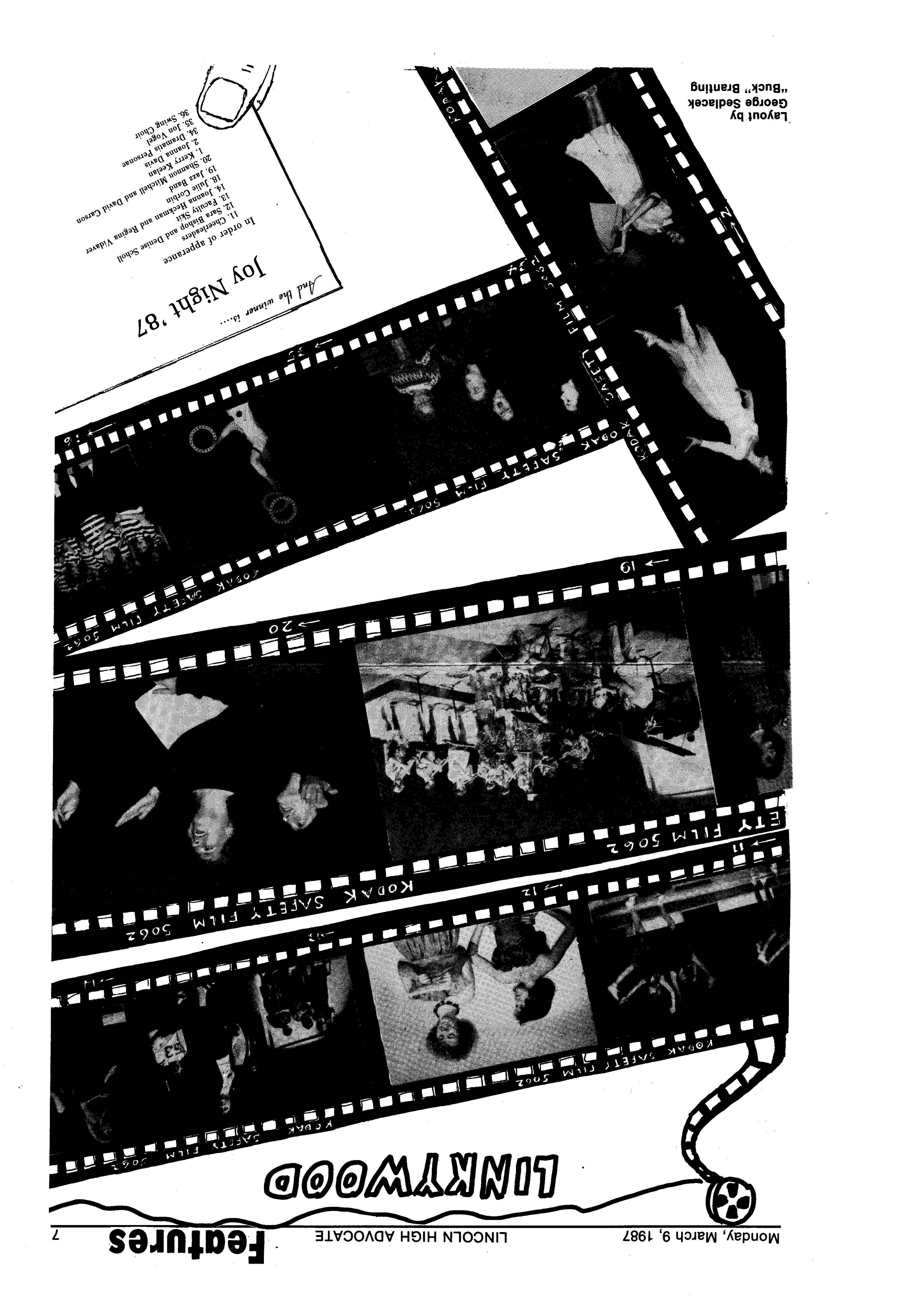 On behalf of the '86-'87 Advocate staff I would like to welcome you to a new year at Lincoln High. This year promises to be full of many fascinating events, and as usual we at the Advocate will be there to cover thenn as they happen. ·