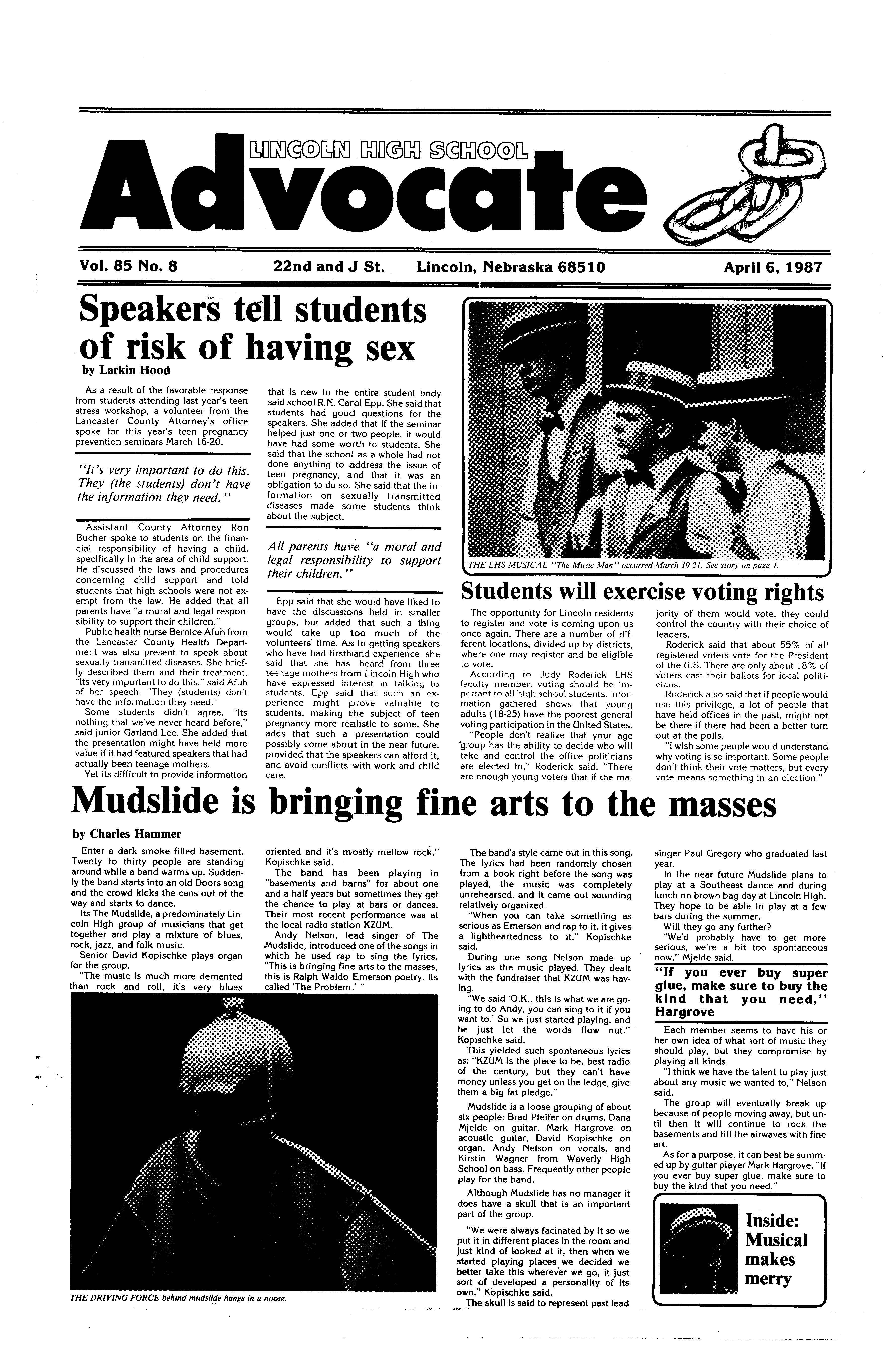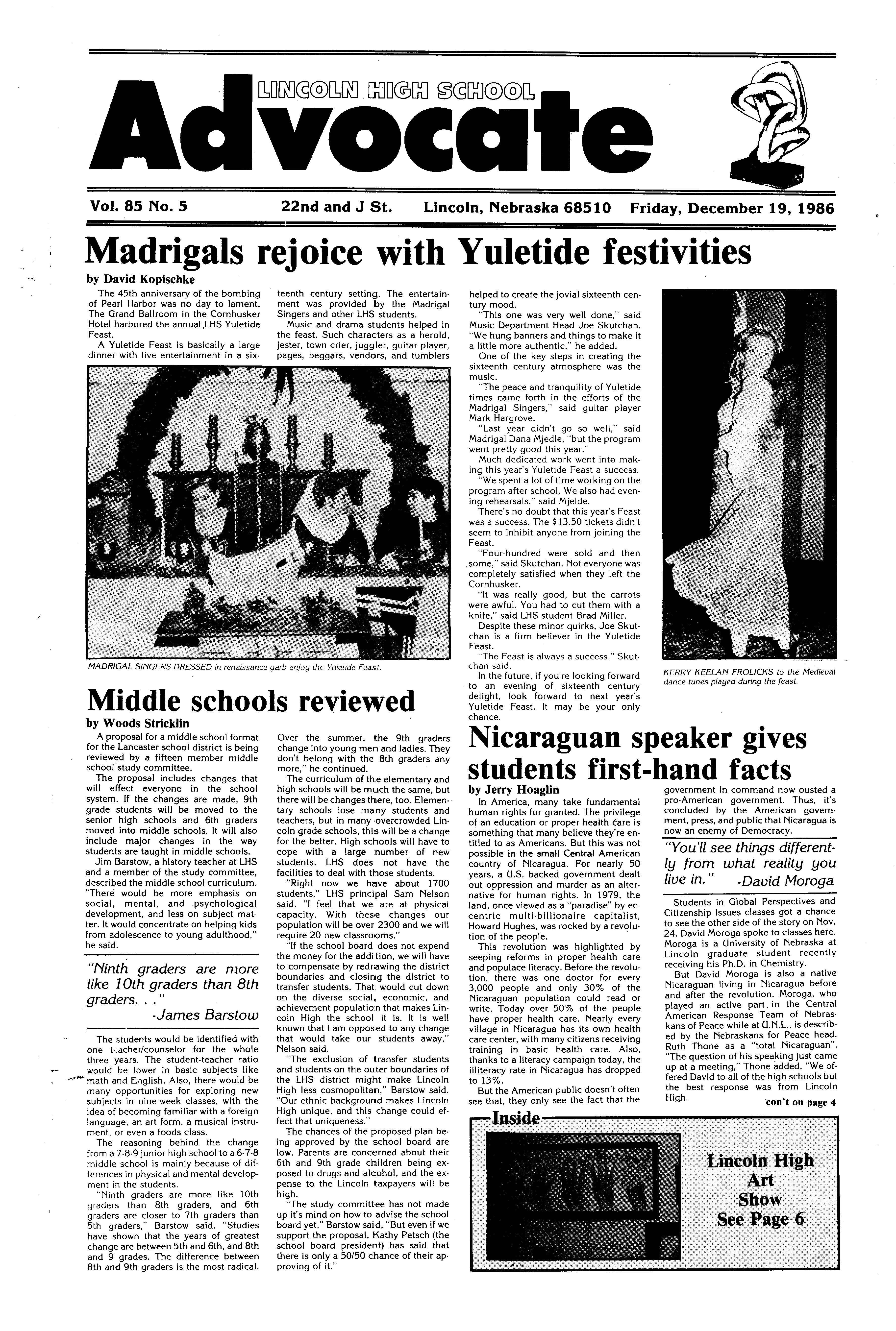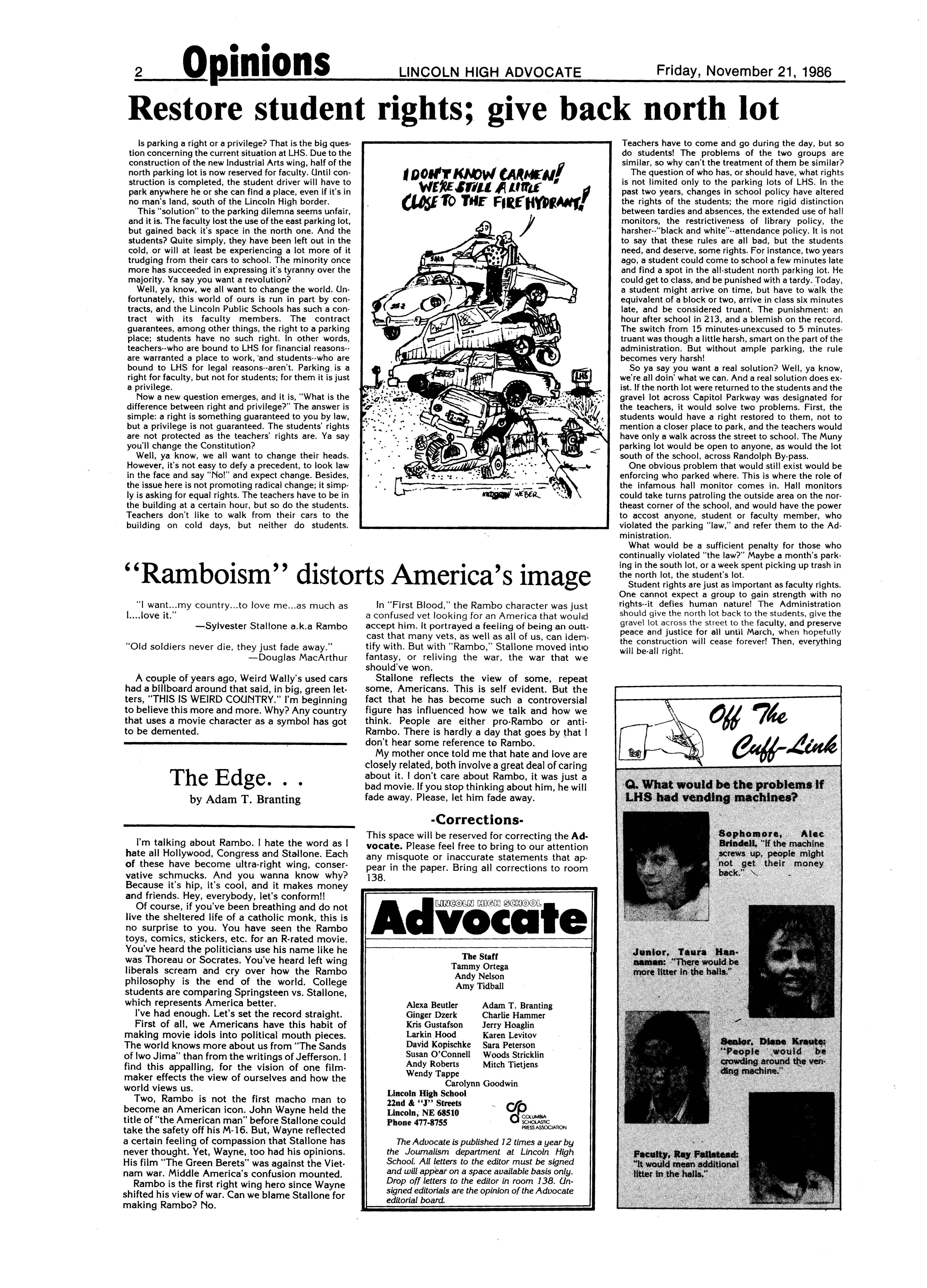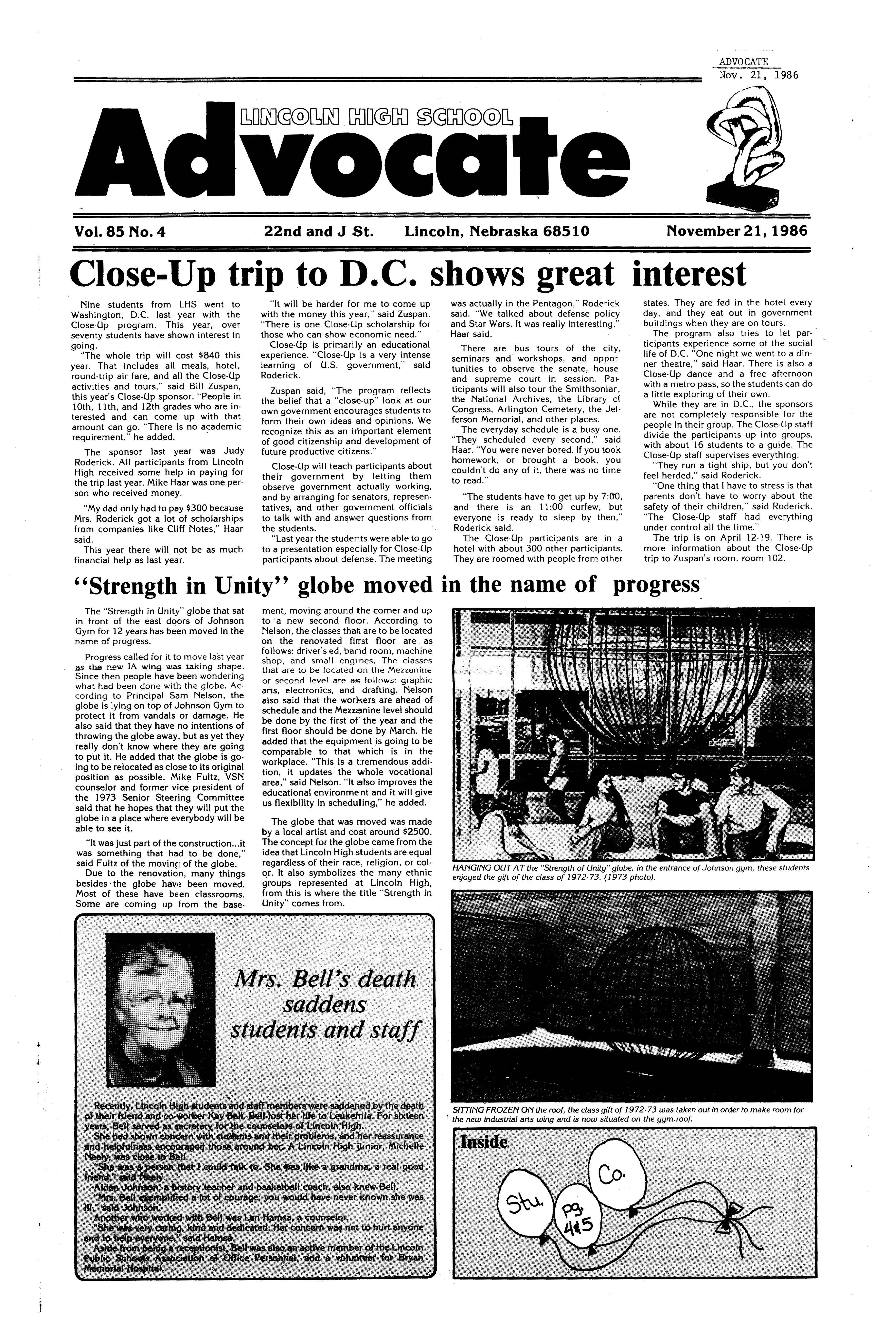 On behalf of the '86-'87 Advocate staff I would like to welcome you to a new year at Lincoln High. This year promises to be full of many fascinating events, and as usual we at the Advocate will be there to cover thenn as they happen. ·
