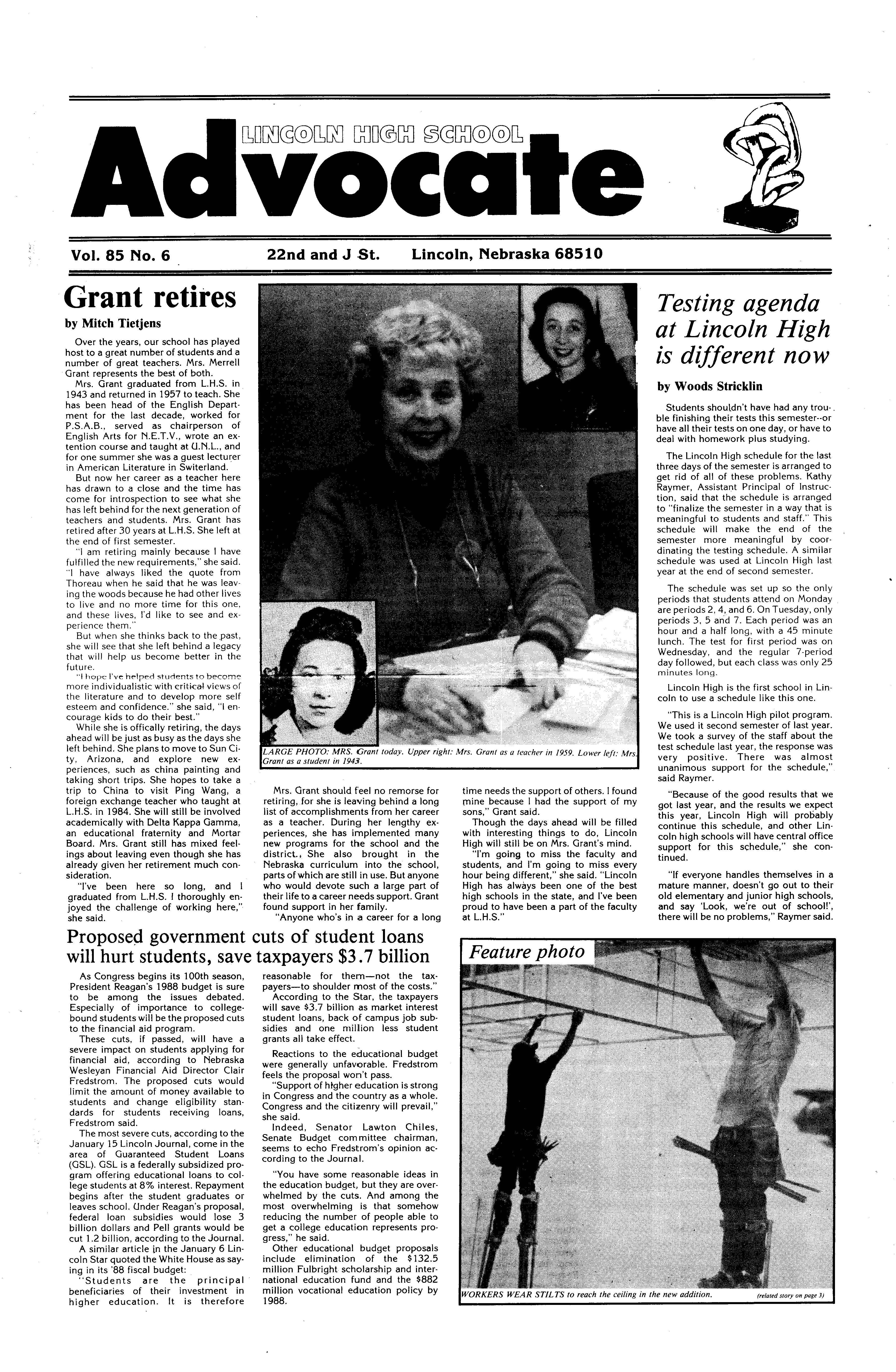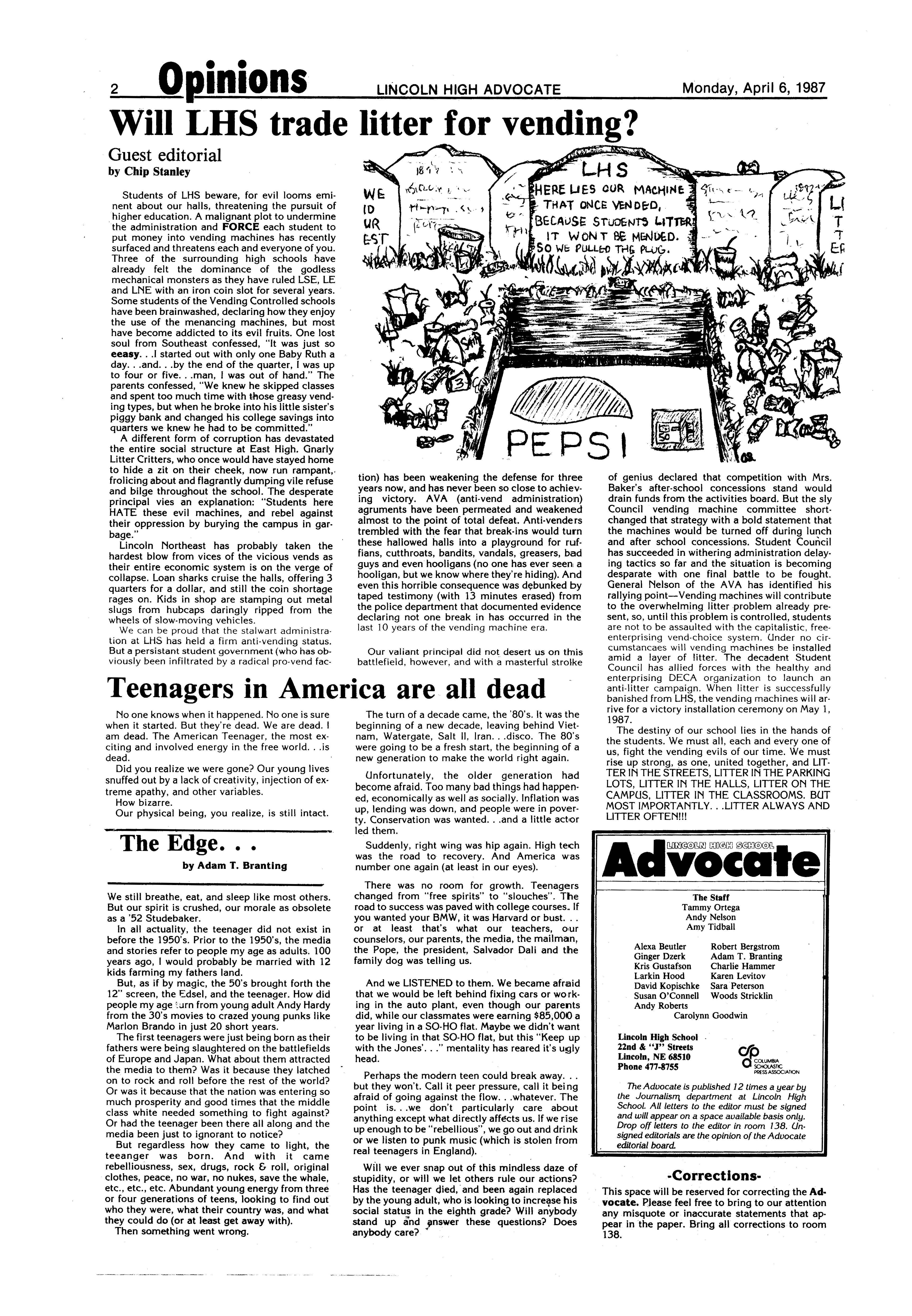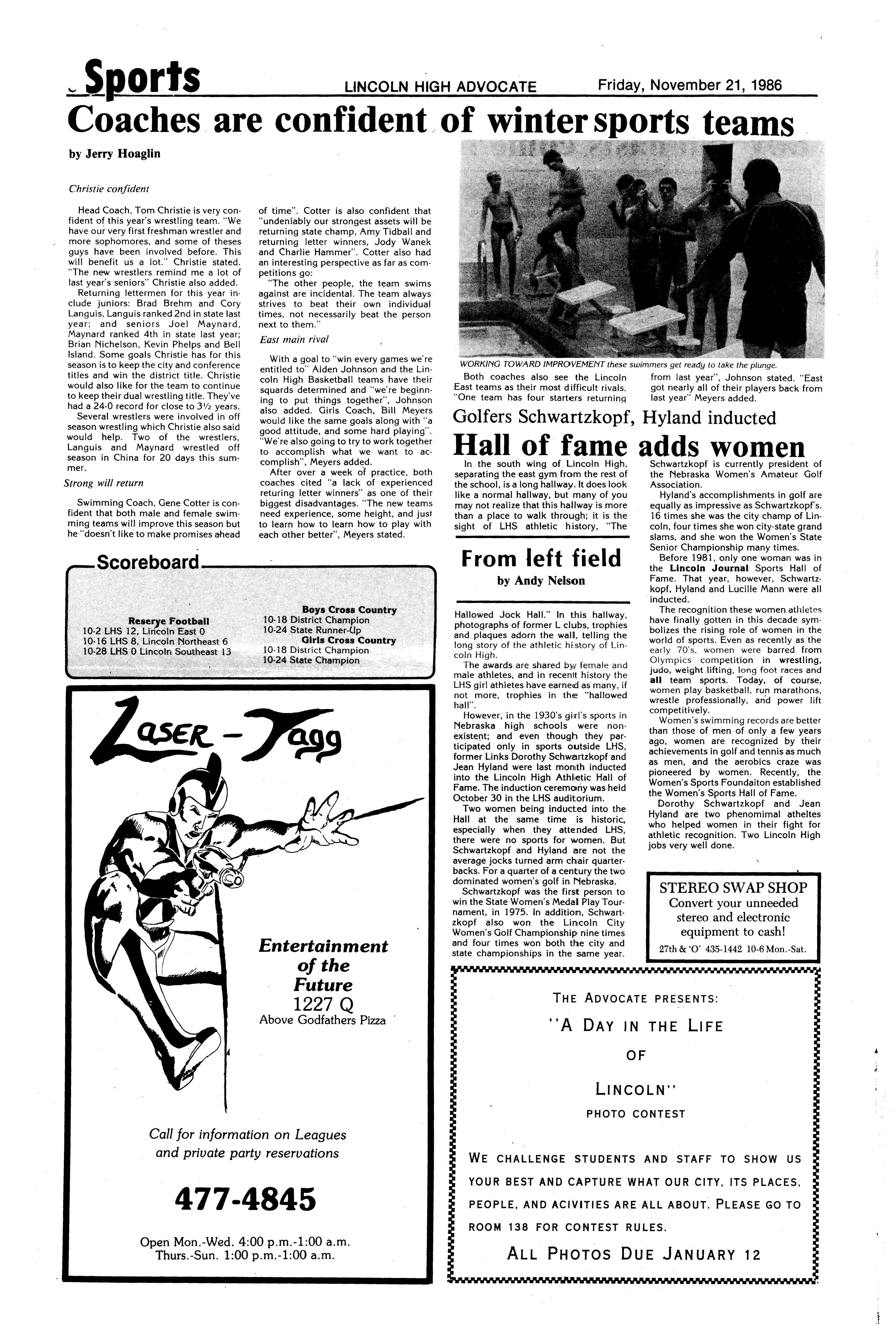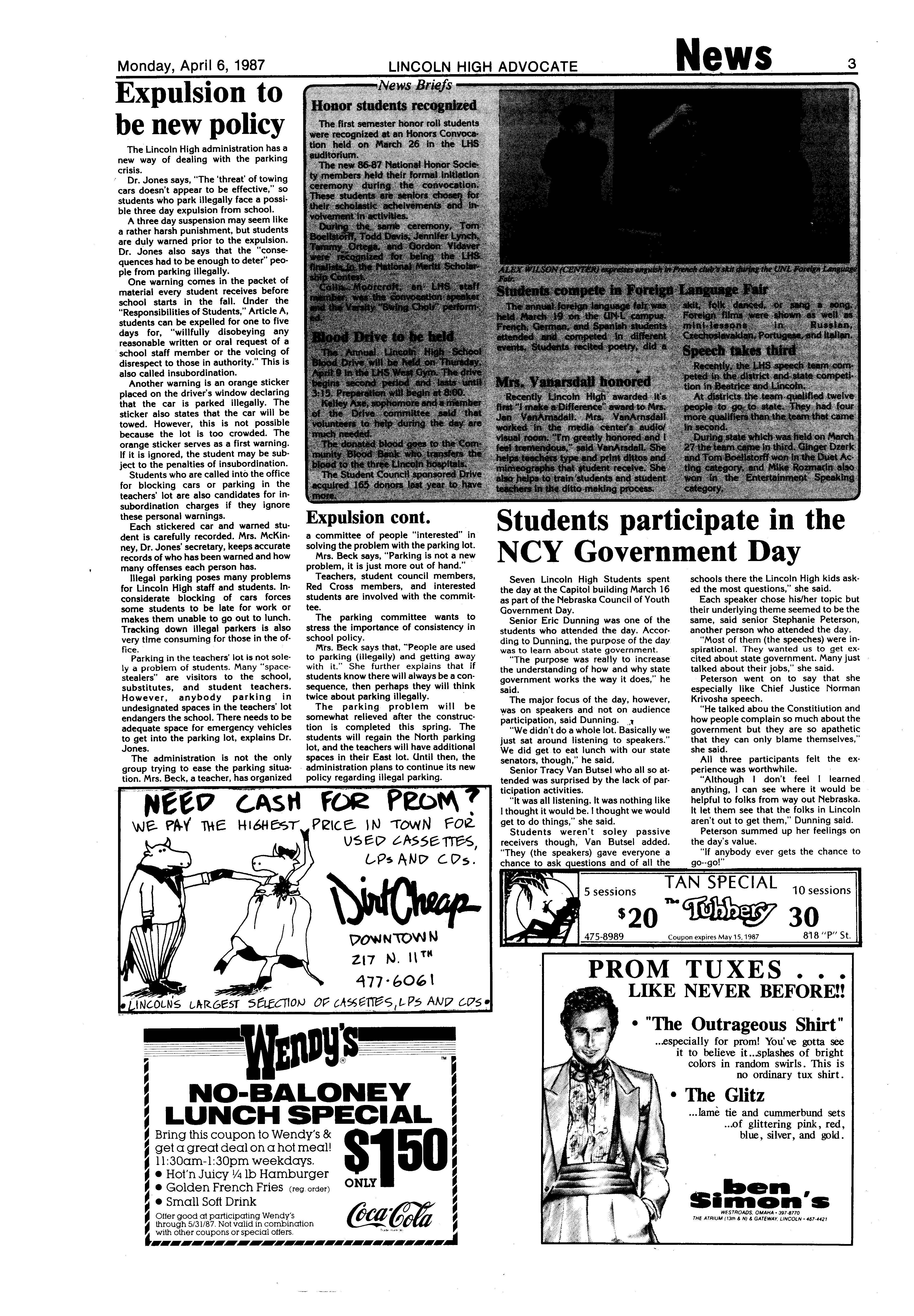 On behalf of the '86-'87 Advocate staff I would like to welcome you to a new year at Lincoln High. This year promises to be full of many fascinating events, and as usual we at the Advocate will be there to cover thenn as they happen. ·
