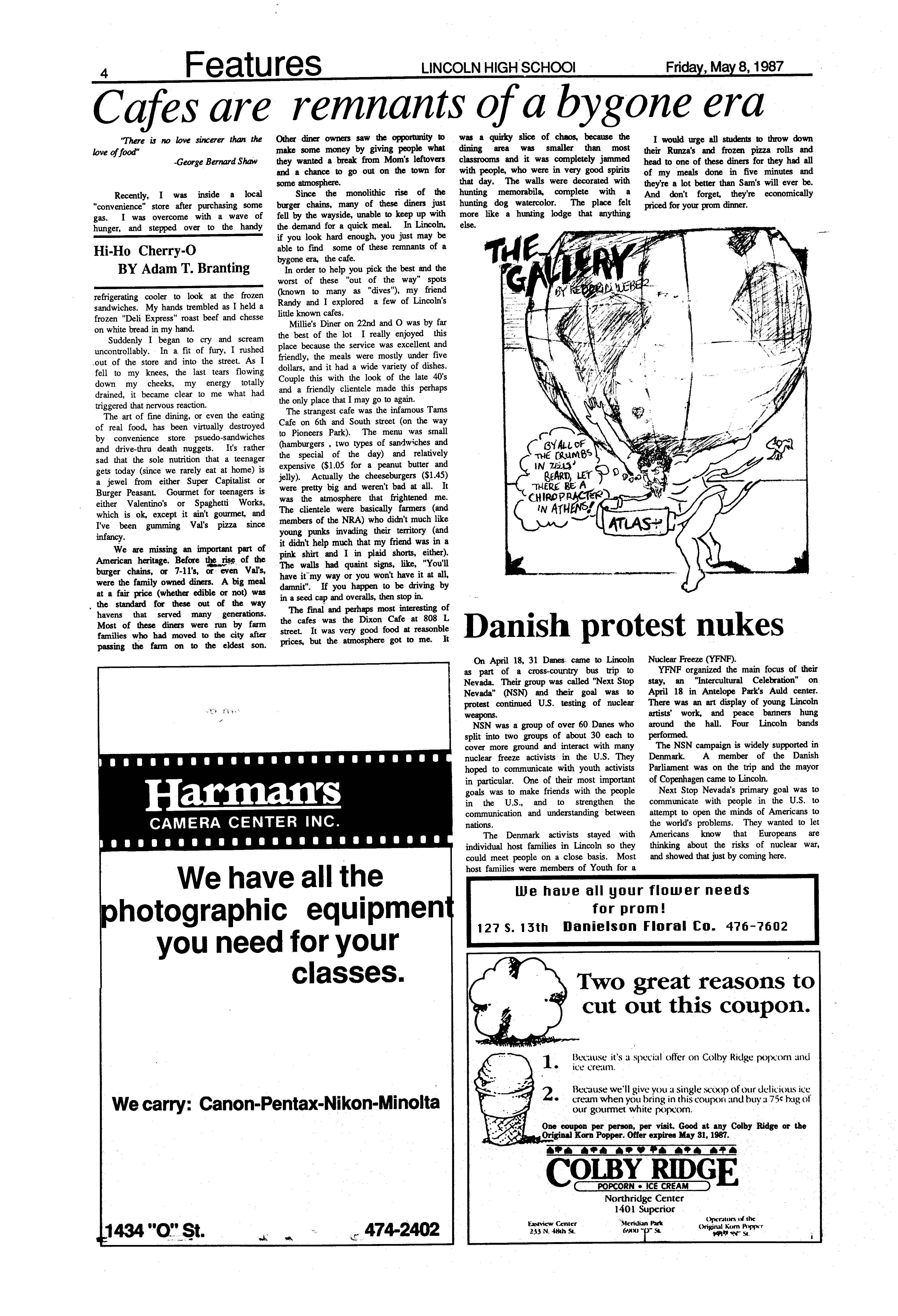 Other diner owners saw thE: opportunity to make some money by giving people what they wanted a break from Mom's leftovers and a chance to .go out on the town for someatmosphere. Since the monolithic rise of the burger chains, many of these diners just fell by the wayside, unable to keep up with the demand for a quick meal. In Lincoln, if you look hard enough, you just may be able to fmd some of these remnants of a bygone era, the cafe.