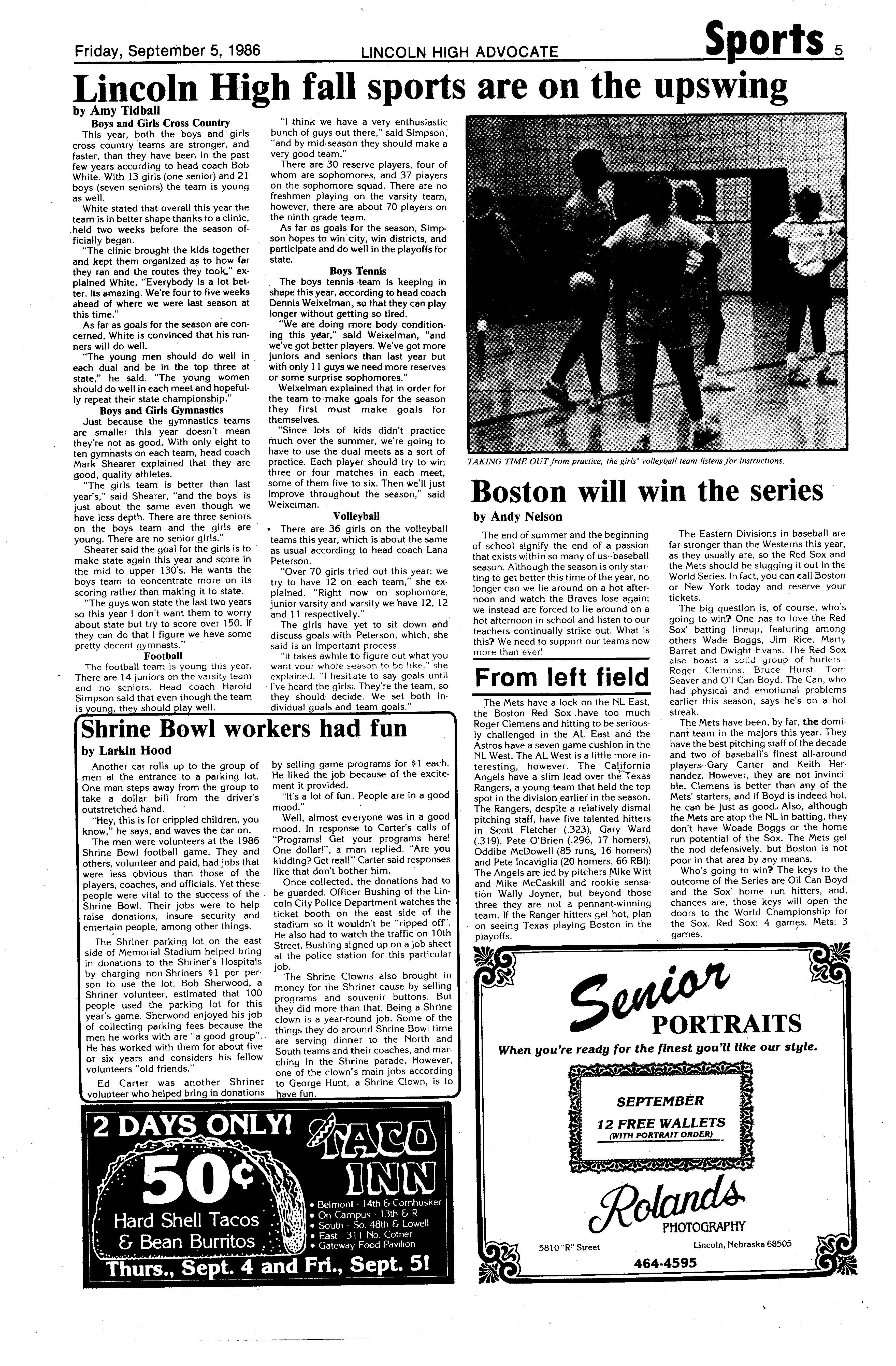 Lincoln High School Seniors Paige Duncan and Tom Boellstorff headed for the Rocky's this summer for some and special music training. Duncan ' Boellstorff attended Rocky Ridge Music Camp near Estes Park, Colorado. Rocky Ridge is a seven week program of rigorous musical study. Nearly seventy students of all musical instruments attended the camp this summP From June 23 to August 11, Duncan and Boellstorff, among all other participants, were involved in such activities as personal lessons, playing classes, performances, and chpir-all students were required to be in the choir. On Mondays, students were free to do as they pleased. Beth Miller Harrod founded Rocky Ridge nearly forty years ago. As a piano student, Harrod studied under Joseph and Rhofina Lhevinne at the Juilliard School of Music. She also took piano lessons from Nedia Boulanger who is considered to be one of the great teachers of our time. Harrod currently has a teaching practice in Lincoln and is a professor at Nebraska Wesleyan University. She is also the director of Rocky Ridge. At the camp Boellstorff studied piano; Duncan studied cello. · "Seven weeks is a long time. It's