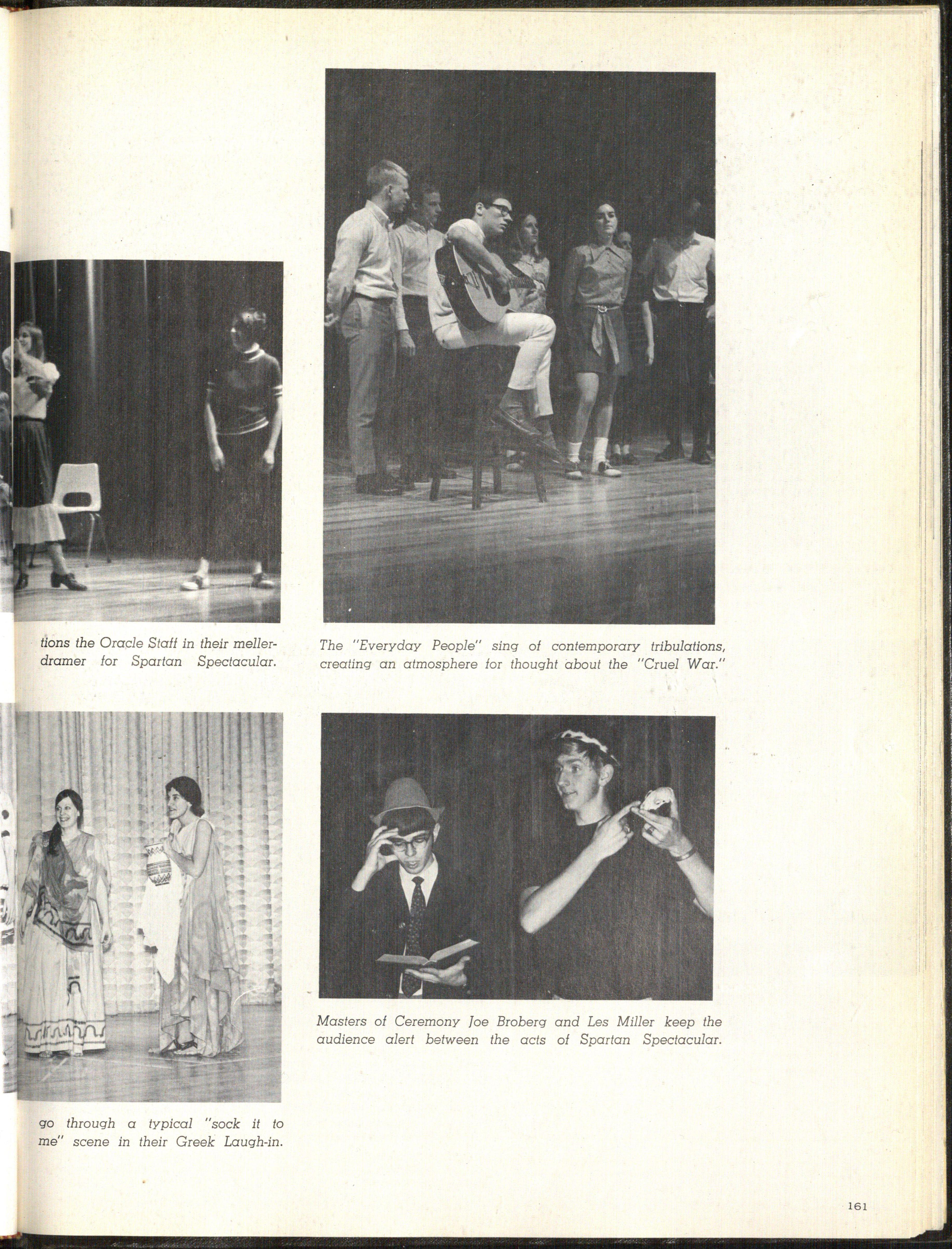 Spartan athletes take pride in their winning records and several near-top positions i n state competition. A cademy appointments, schola r ship awards and na tional recogn ition are besto w ed upon individuals for their in telle c tual advancement. A ctiv i ties are more unique th i s y e ar, as the influence of ancie n t Greece becomes predominent.