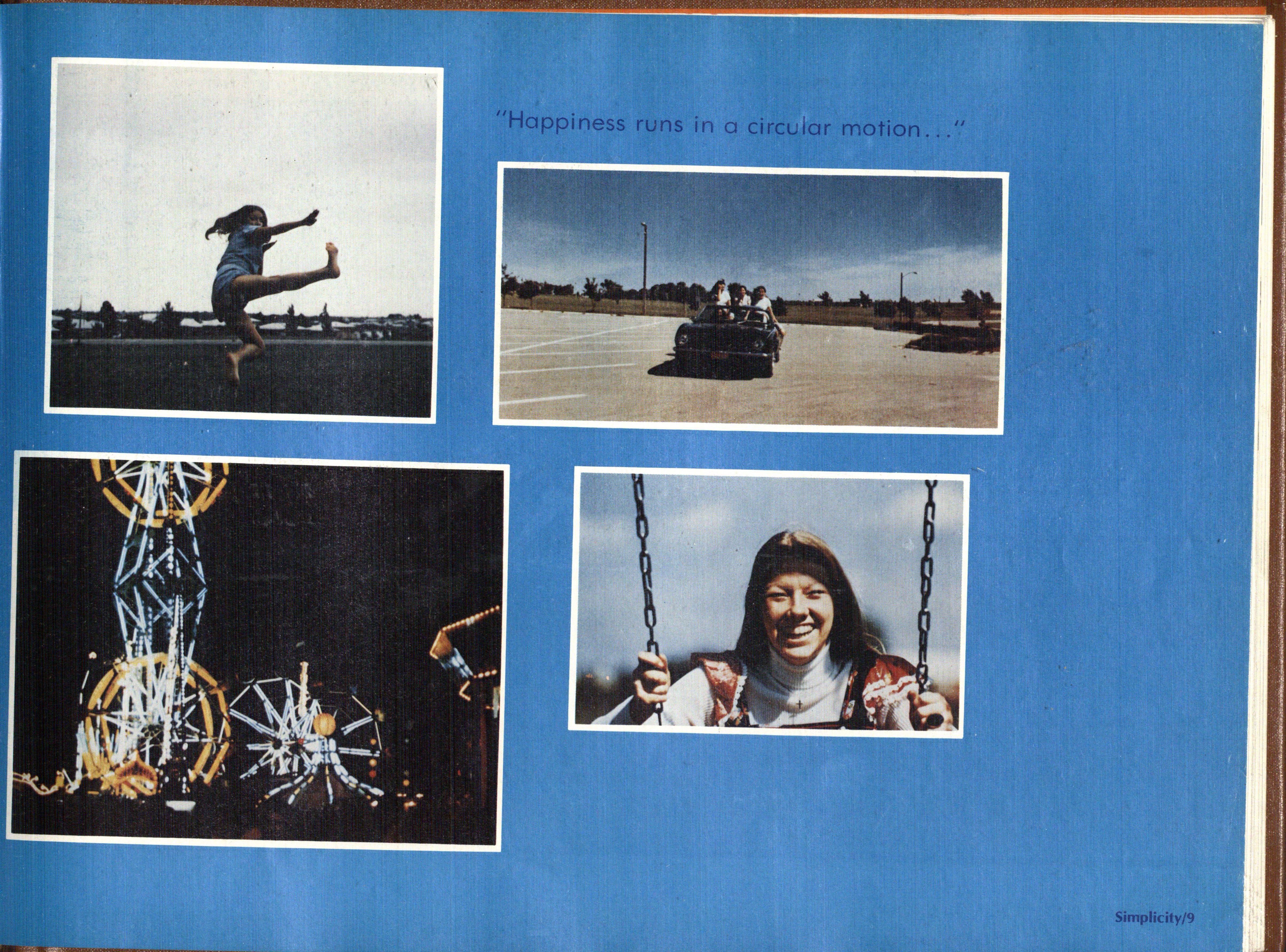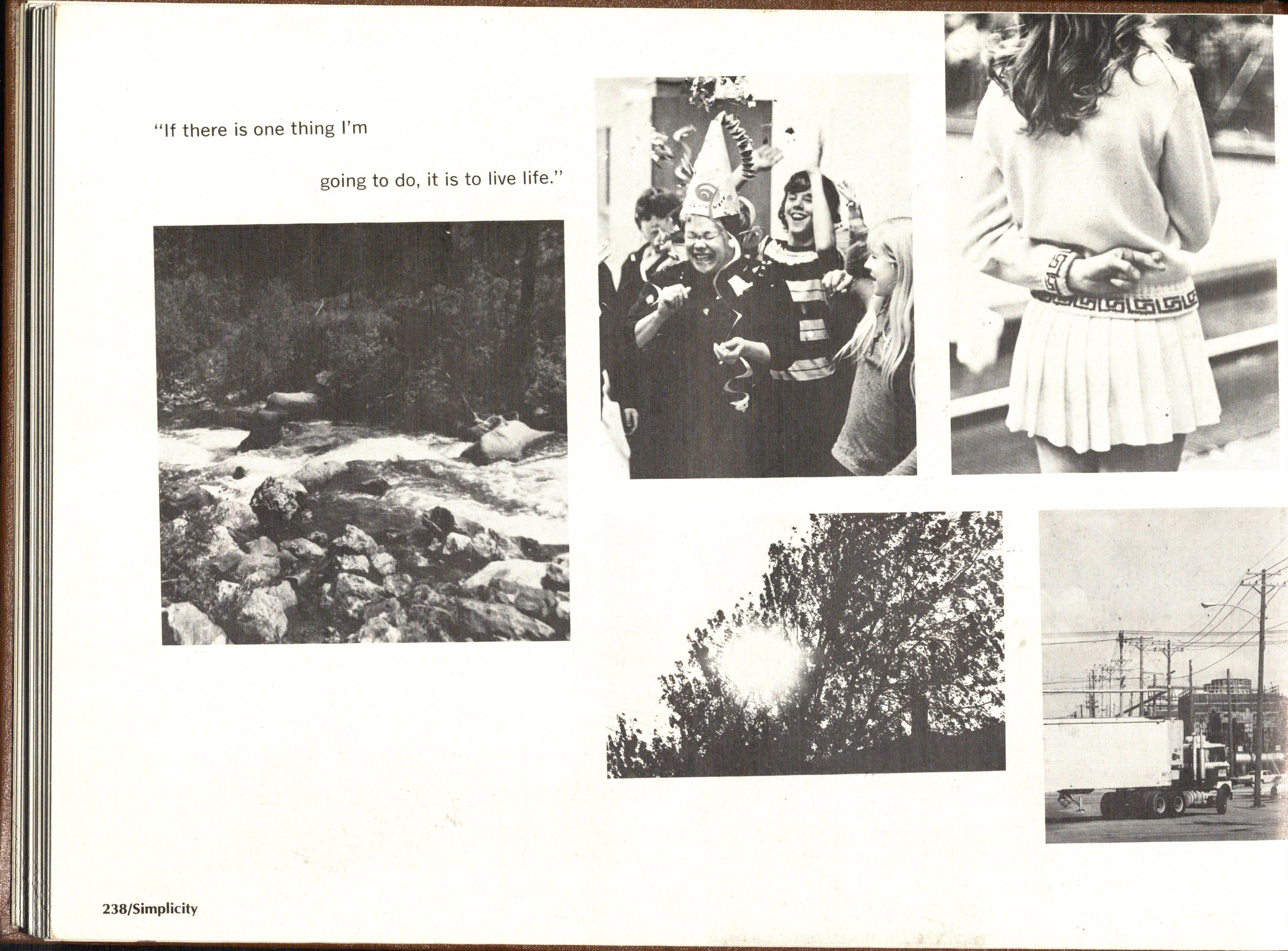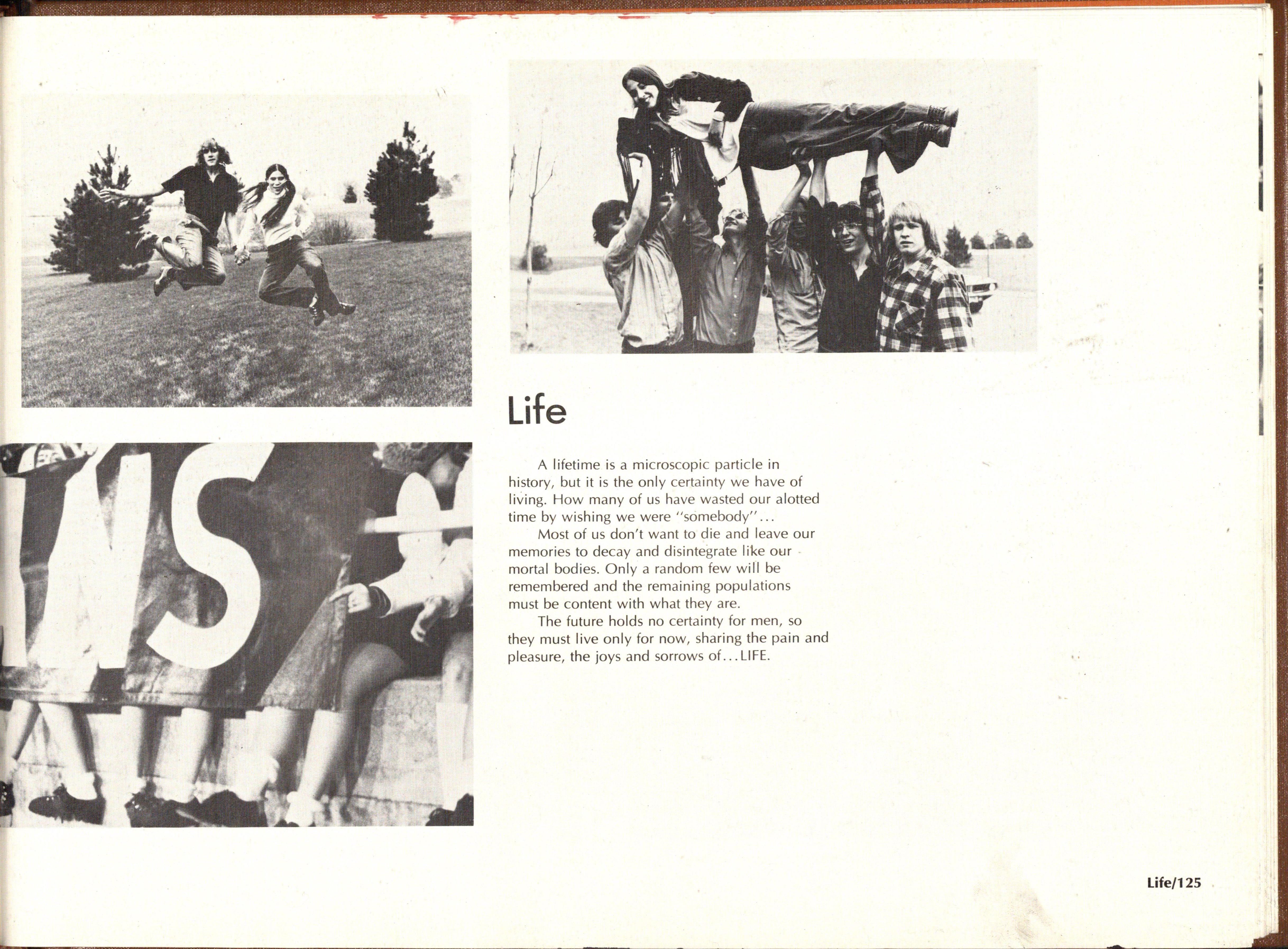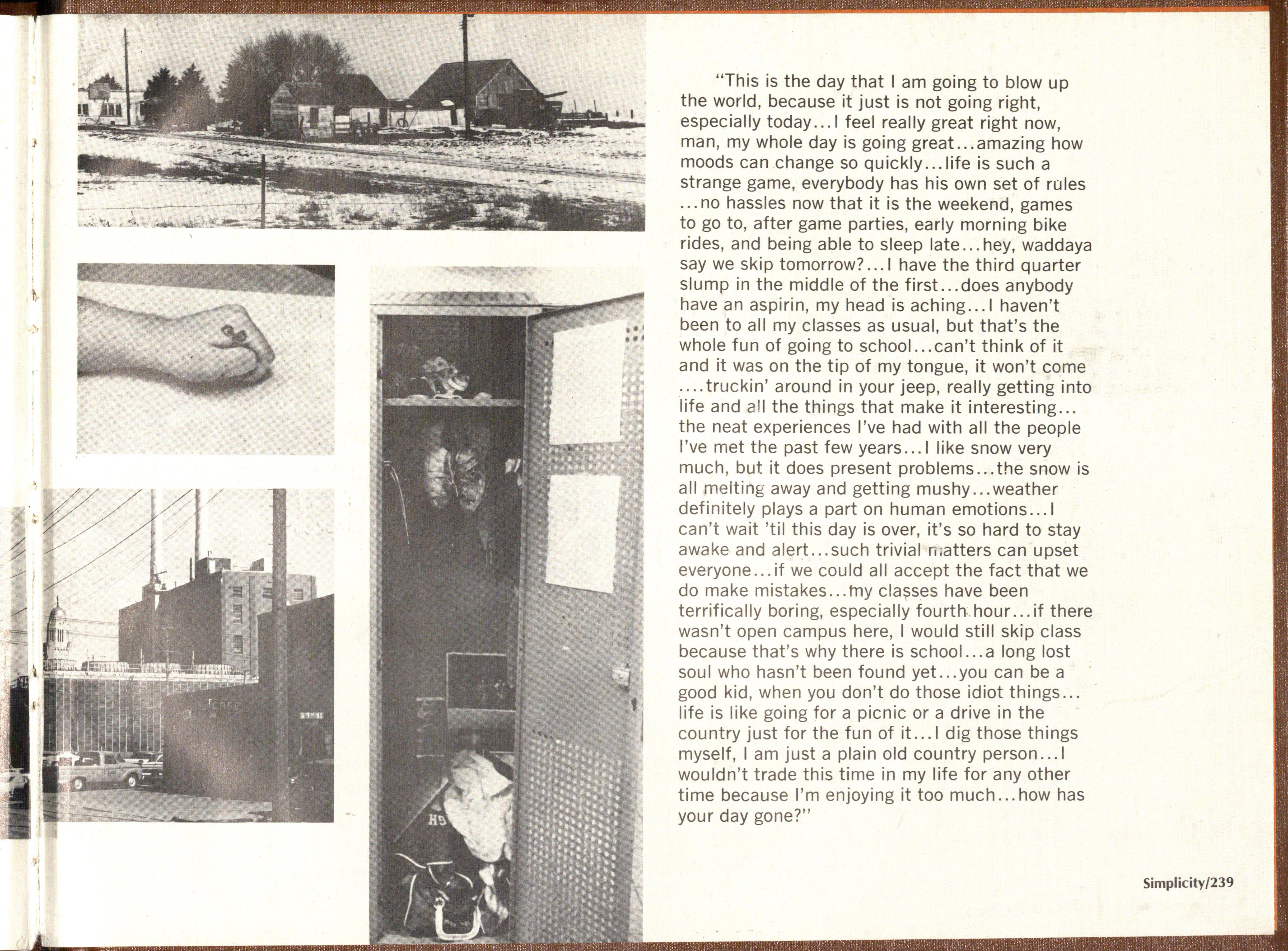 "This is the day that I am going to blow up the world, because it just is not going right, especially today ... I feel really great right now, man, my whole day is going great ... amazing how moods can change so quickly ... life is such a strange game, everybody has his own set of roles ... no hassles now that it is the weekend, games to go to, after game parties, early morning bike rides, and being able to sleep late ... hey, waddaya say we skip tomorrow? ... I have the third quarter slump in the middle of the first. .. does anybody have an aspirin, my head is aching ... I haven't been to all my classes as usual, but that's the whole fun of going to school. .. can't think of it and it was on the tip of my tongue, it won't come truckin' around in your jeep, really getting into ·life and all the things that make it interesting ... the neat experiences I've had with all the people I've met the past few years I like snow very much, but it does present problems ... the snow is all melting away and getting mushy ... weather definitely plays a part on human emotions ... I can't wait 'til this day is over, it's so hard to stay awake and alert ... such trivial n ;atters can upset everyone ... if we could all accept the fact that we do make mistakes ... tny cla~s~s have been terrifically boring, especially fourth: . hour ... if there wasn't open campus here, I would still skip class because that's why there is school ... a long lost sou I who hasn't been found yet ... you can be a good kid, when you don't do those idiot things life is like going for a picnic or a drive in the • country just for the fun of it ... I dig those things myself, I am just a plain old country person ... I wouldn't trade this time in my life for any other time because I'm enjoying it too much ... how has your day gone?"