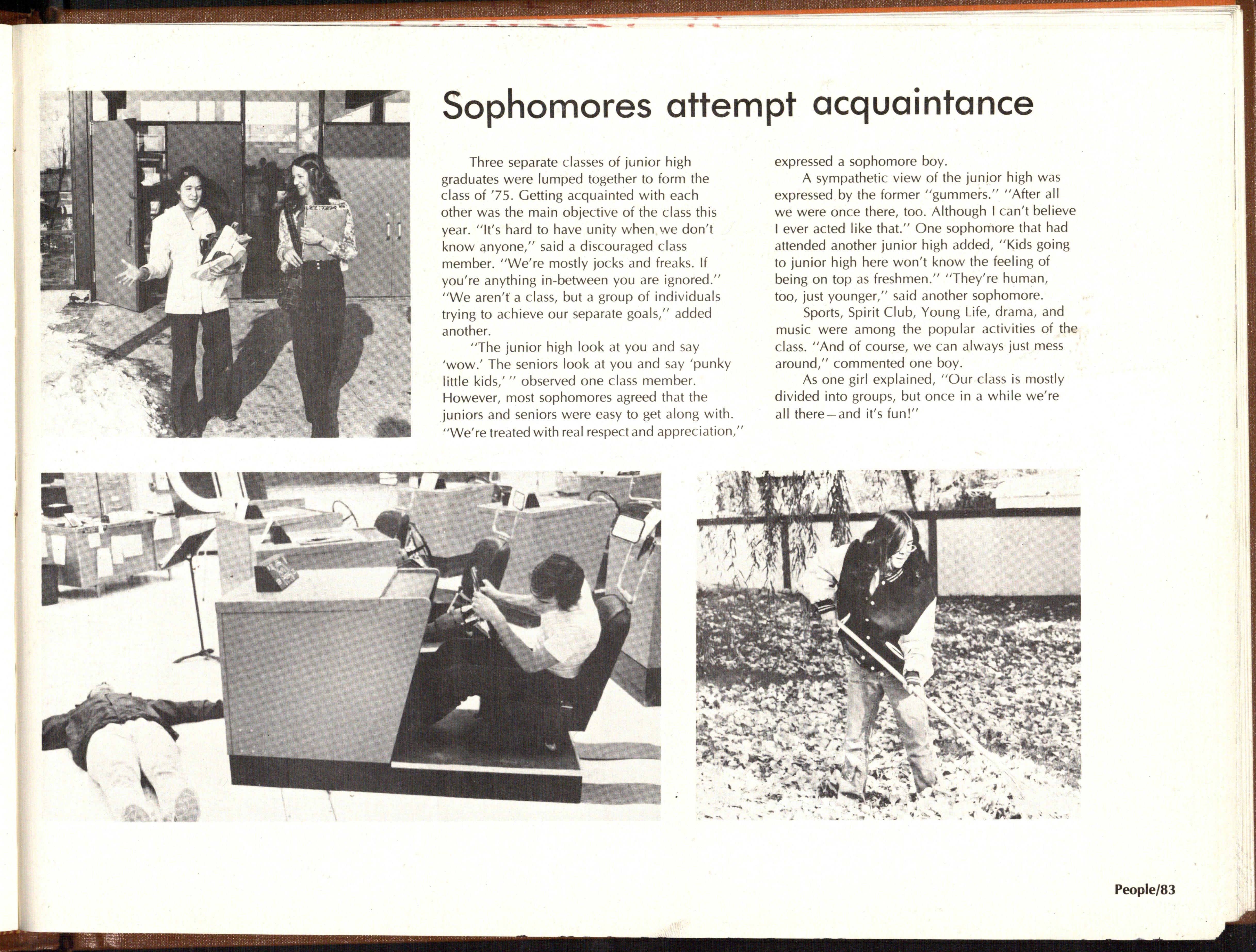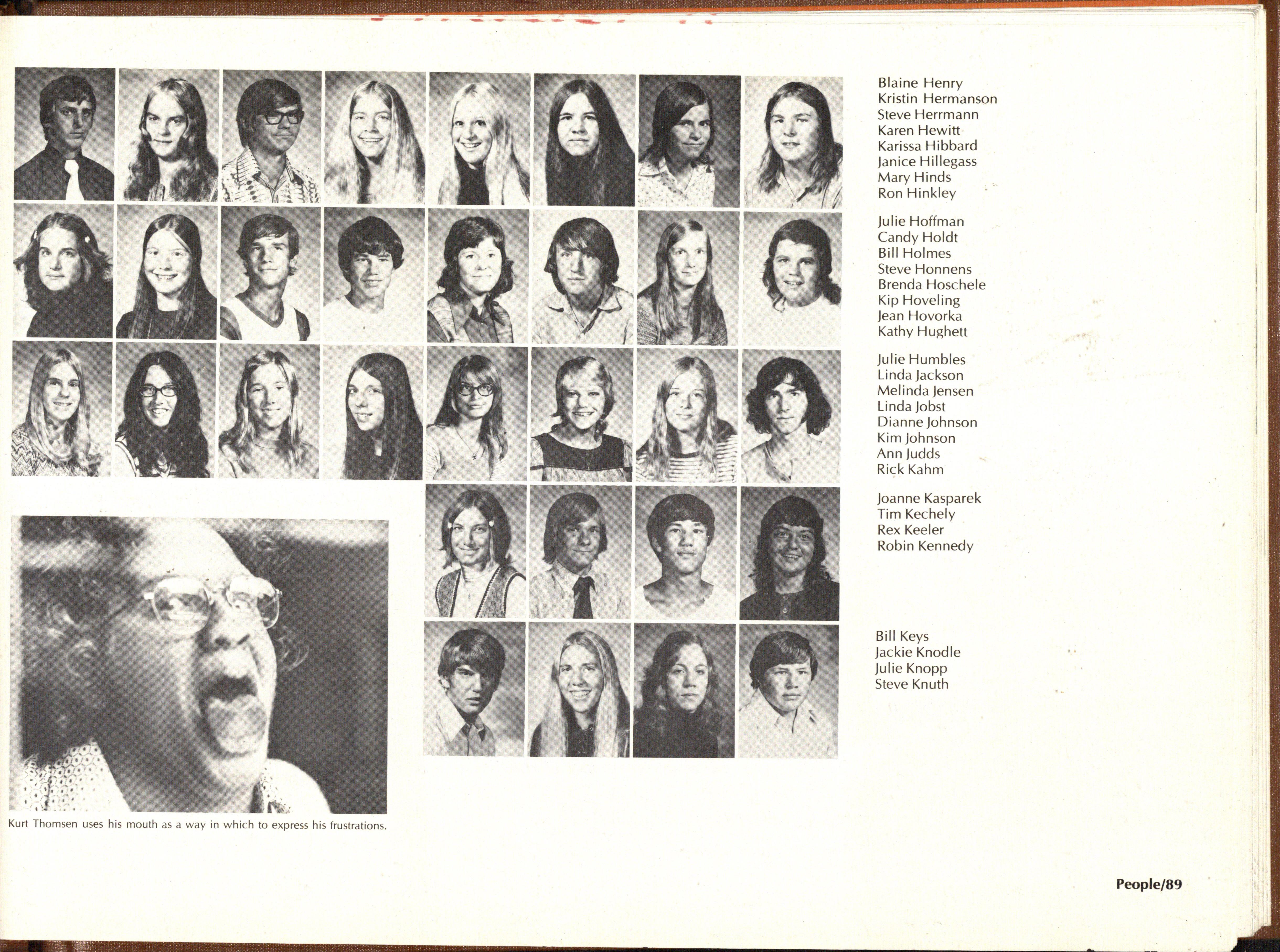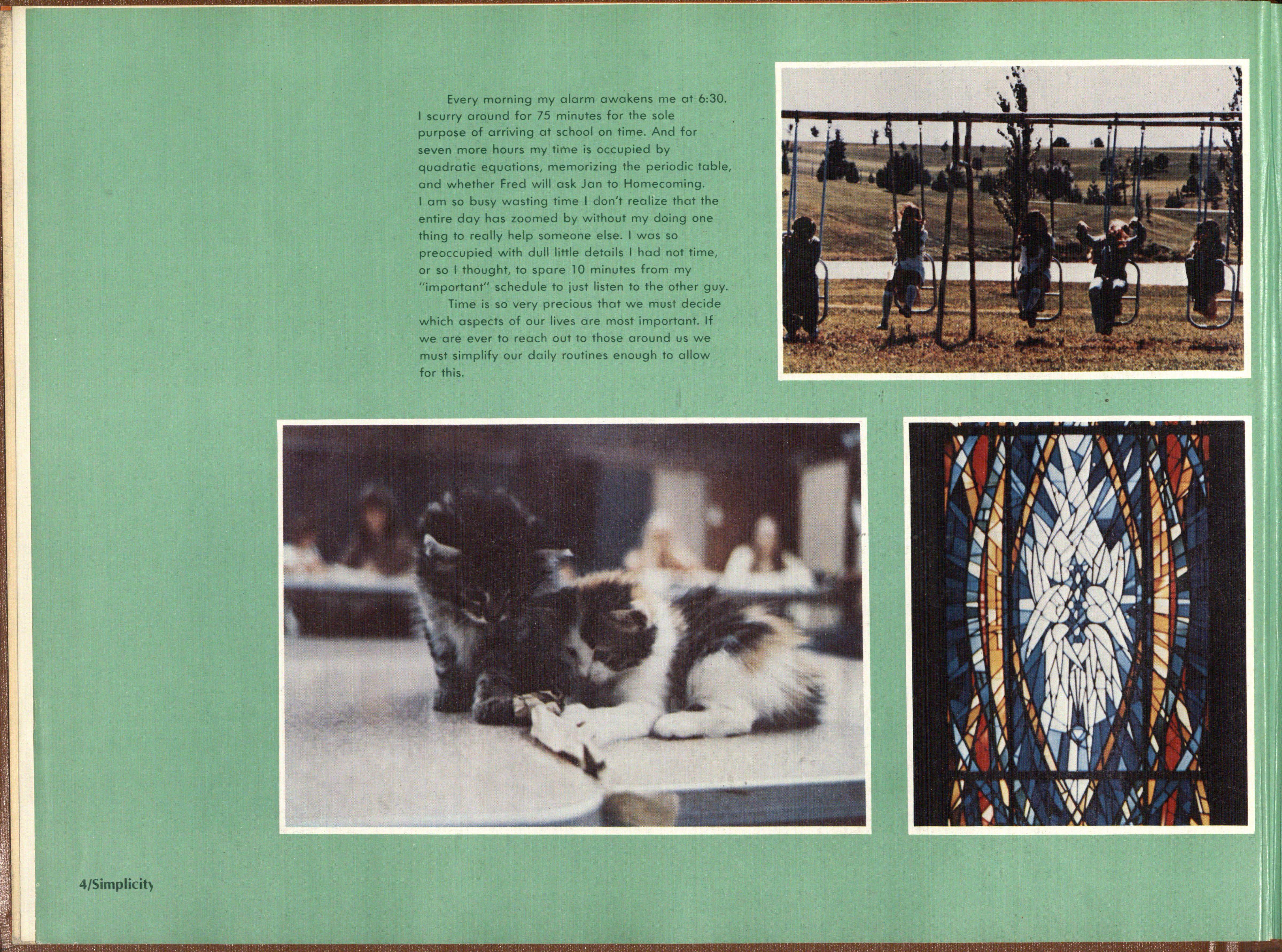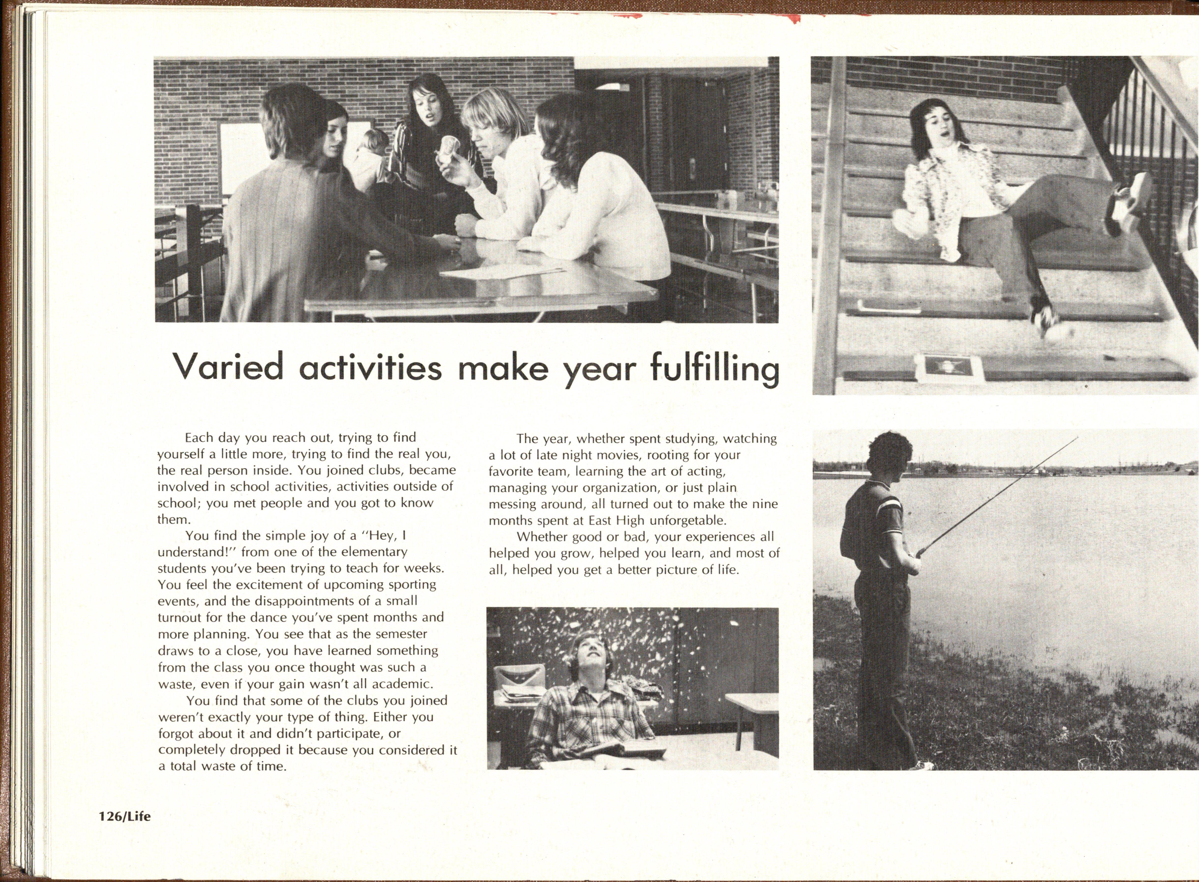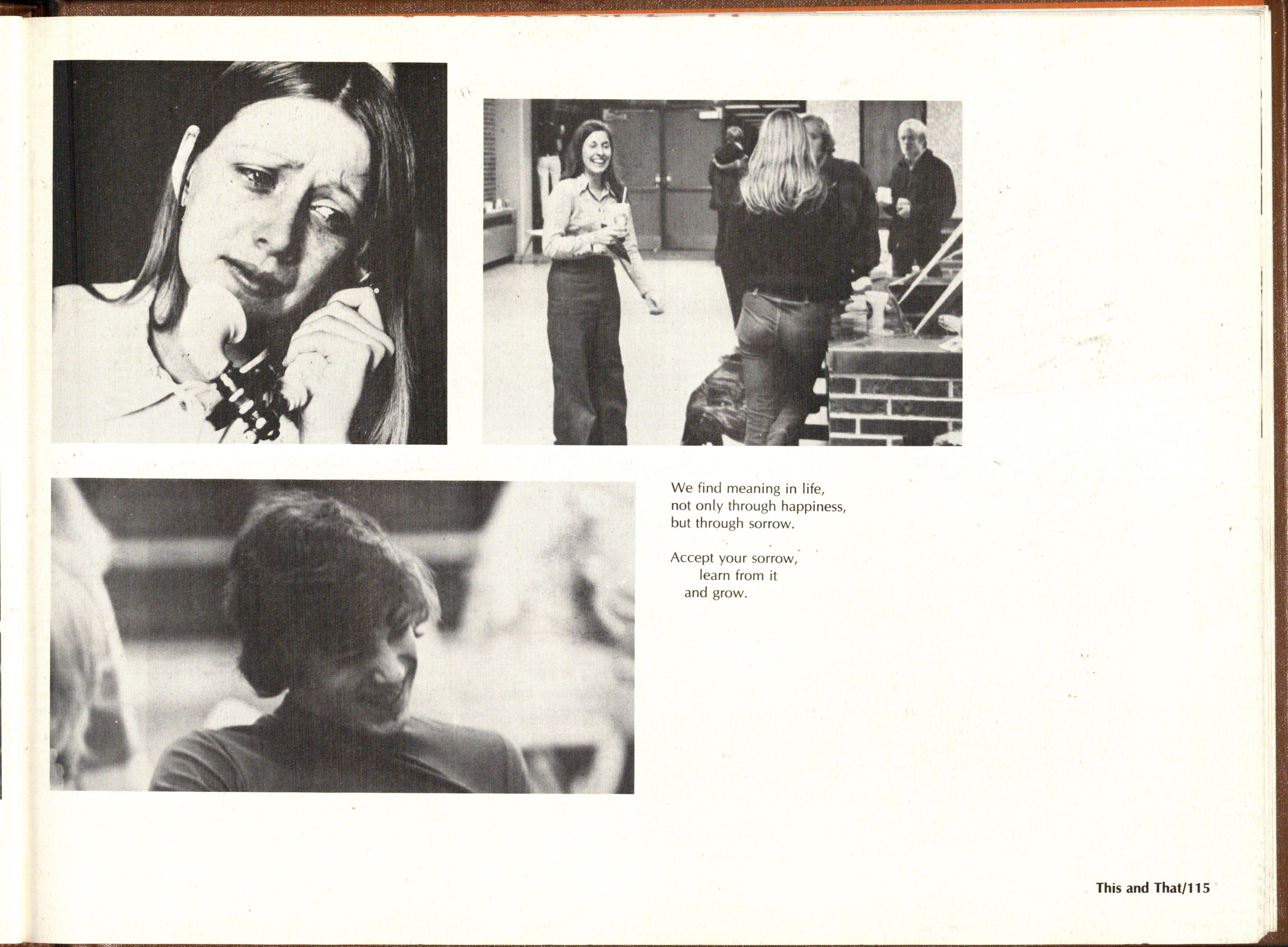 "This is the day that I am going to blow up the world, because it just is not going right, especially today ... I feel really great right now, man, my whole day is going great ... amazing how moods can change so quickly ... life is such a strange game, everybody has his own set of roles ... no hassles now that it is the weekend, games to go to, after game parties, early morning bike rides, and being able to sleep late ... hey, waddaya say we skip tomorrow? ... I have the third quarter slump in the middle of the first. .. does anybody have an aspirin, my head is aching ... I haven't been to all my classes as usual, but that's the whole fun of going to school. .. can't think of it and it was on the tip of my tongue, it won't come truckin' around in your jeep, really getting into ·life and all the things that make it interesting ... the neat experiences I've had with all the people I've met the past few years I like snow very much, but it does present problems ... the snow is all melting away and getting mushy ... weather definitely plays a part on human emotions ... I can't wait 'til this day is over, it's so hard to stay awake and alert ... such trivial n ;atters can upset everyone ... if we could all accept the fact that we do make mistakes ... tny cla~s~s have been terrifically boring, especially fourth: . hour ... if there wasn't open campus here, I would still skip class because that's why there is school ... a long lost sou I who hasn't been found yet ... you can be a good kid, when you don't do those idiot things life is like going for a picnic or a drive in the • country just for the fun of it ... I dig those things myself, I am just a plain old country person ... I wouldn't trade this time in my life for any other time because I'm enjoying it too much ... how has your day gone?"