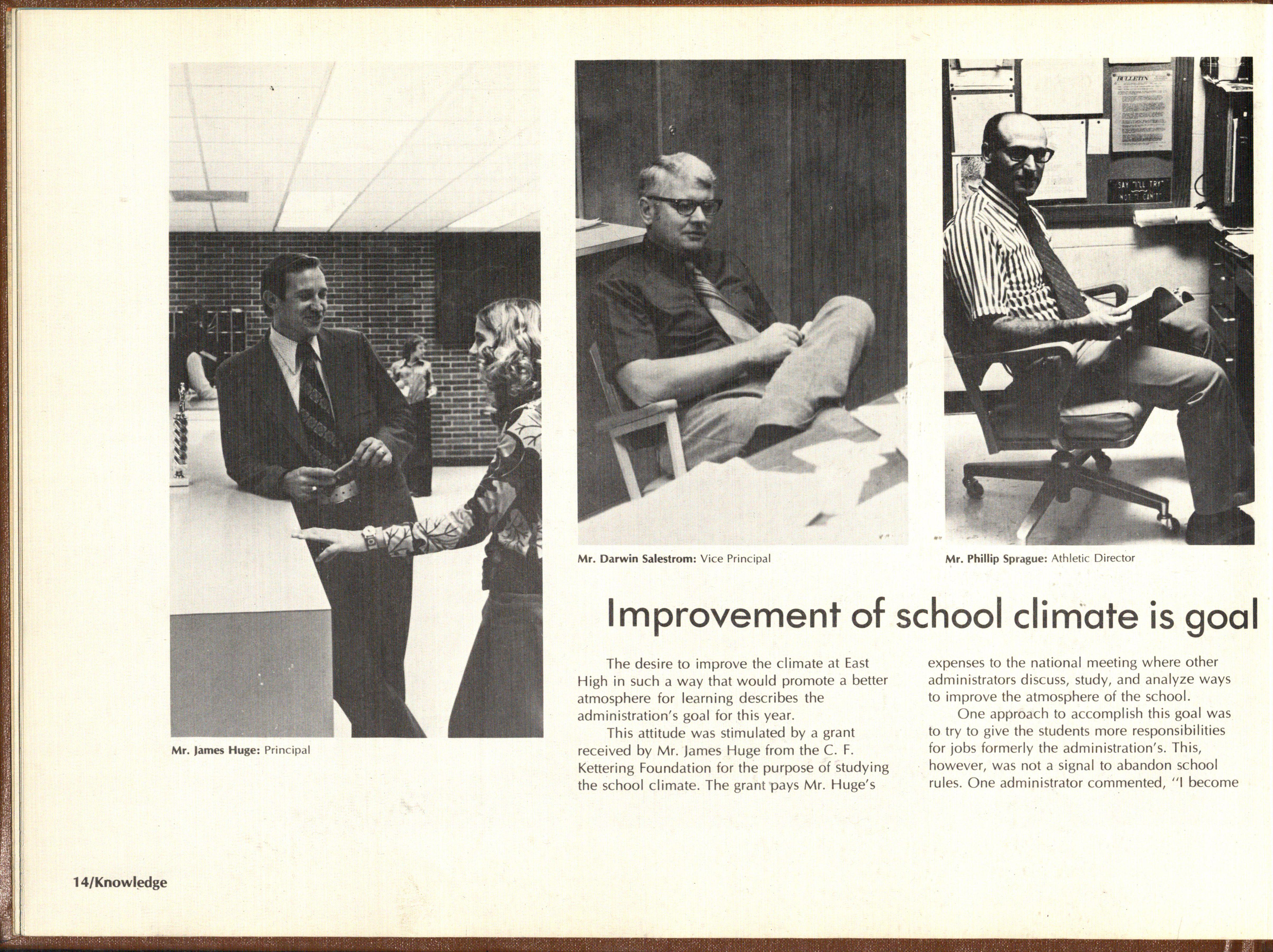 This attitude was stimulated by a grant received by Mr. James Huge from the C. F. Kettering Foundation for the purpose of studying the school climate. The grant pays Mr. Huge's