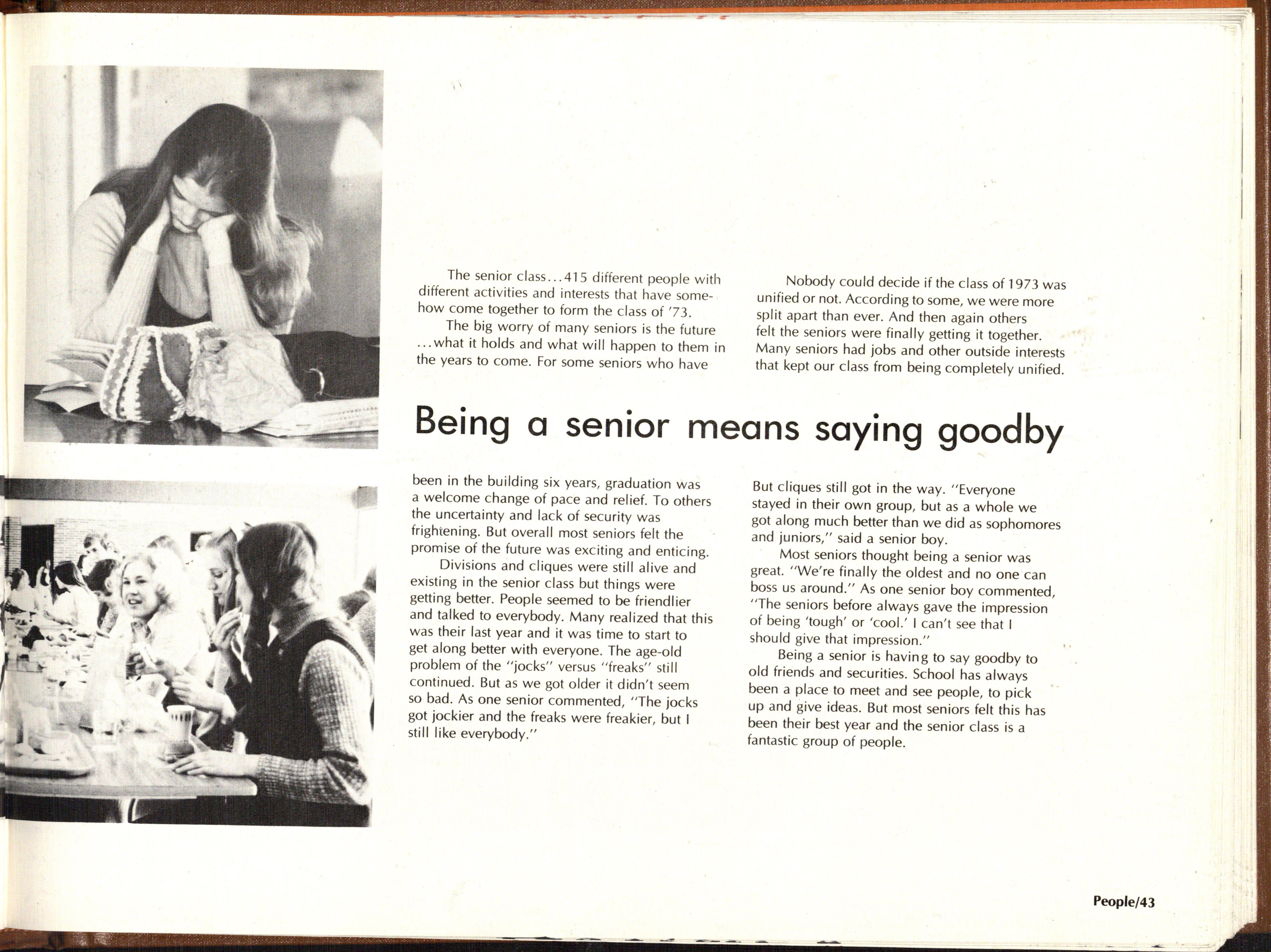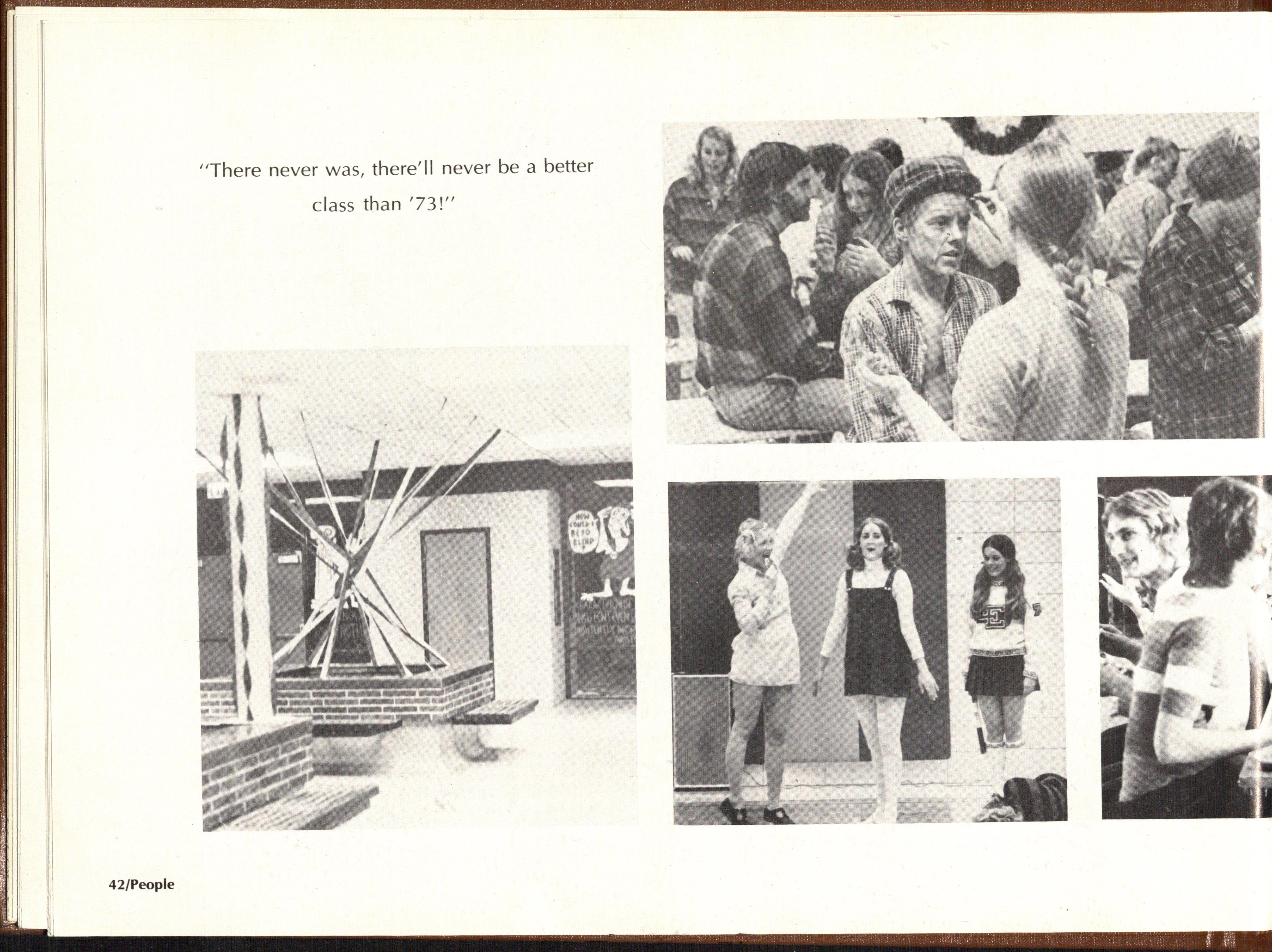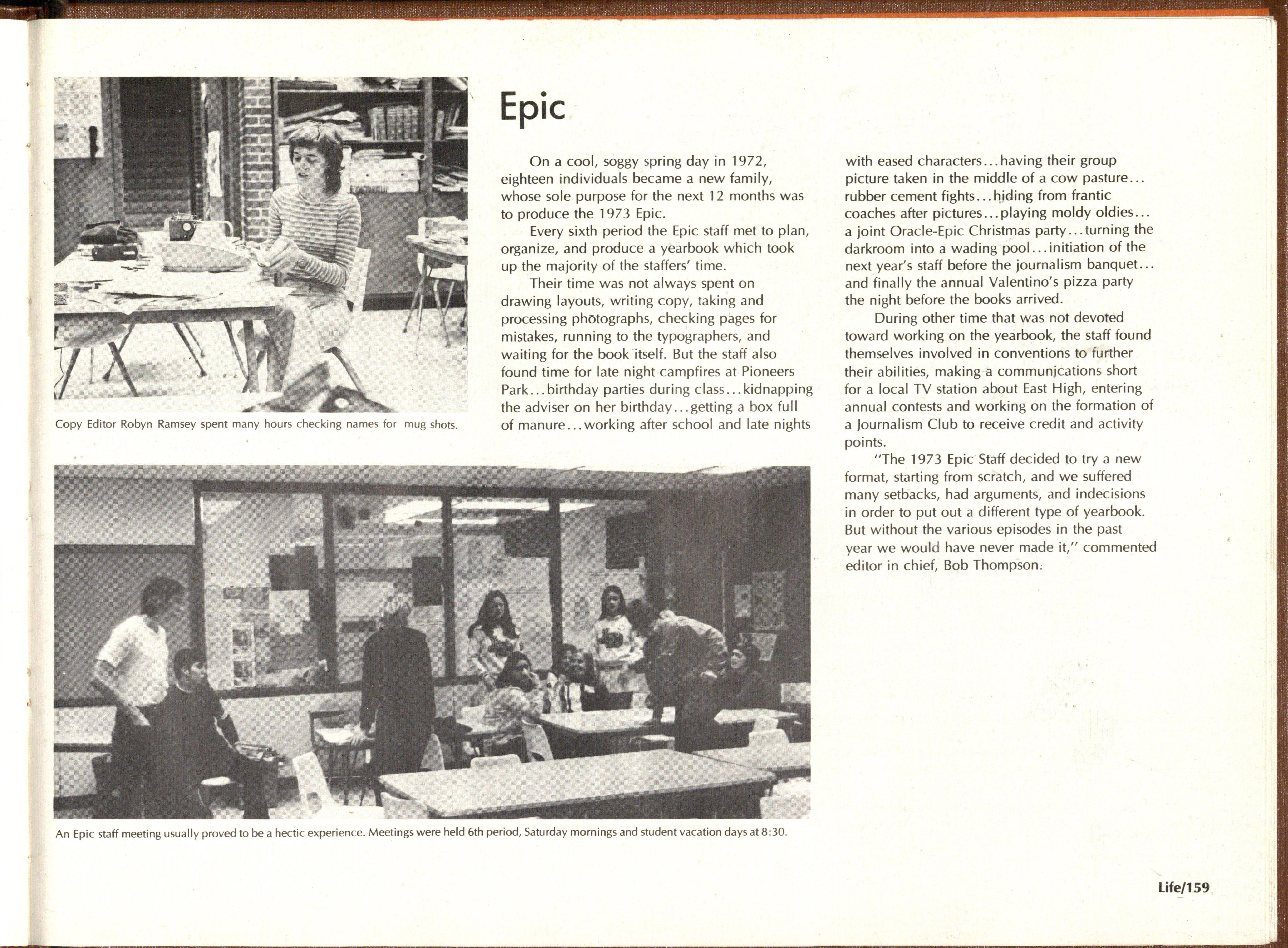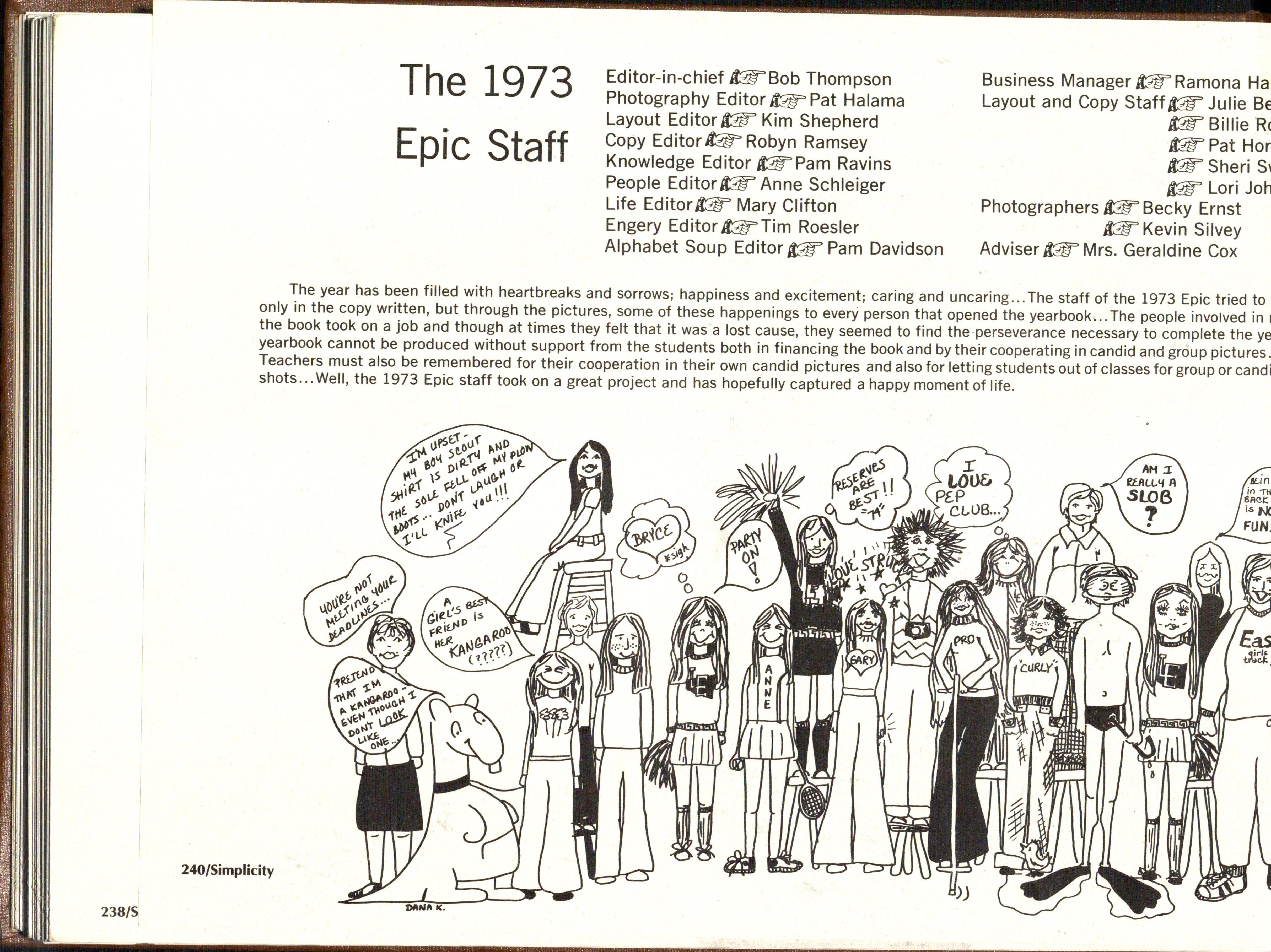 The year has been filled with heartbreaks and sorrows ; happiness and excitement; caring and uncaring . . . The staff of the 1973 Epic tried to only in the copy written, but through the pictures, some of these happenings to every person that opened the yearbook ... The people involved in 1 the book took on a job and though at times they felt that it was a lost cause, they seemed to find the -perseverance necessary to complete the ye yearbook cannot be produced without support from the students both in financing the book and by their cooperating in candid and group pictures. Teachers must also be remembered for their cooperation in their own candid pictures and also for letting students out of classes for group or cand i shots ... Well, the 1973 Epic staff took on a great project and has hopefully captured a happy moment of l ife