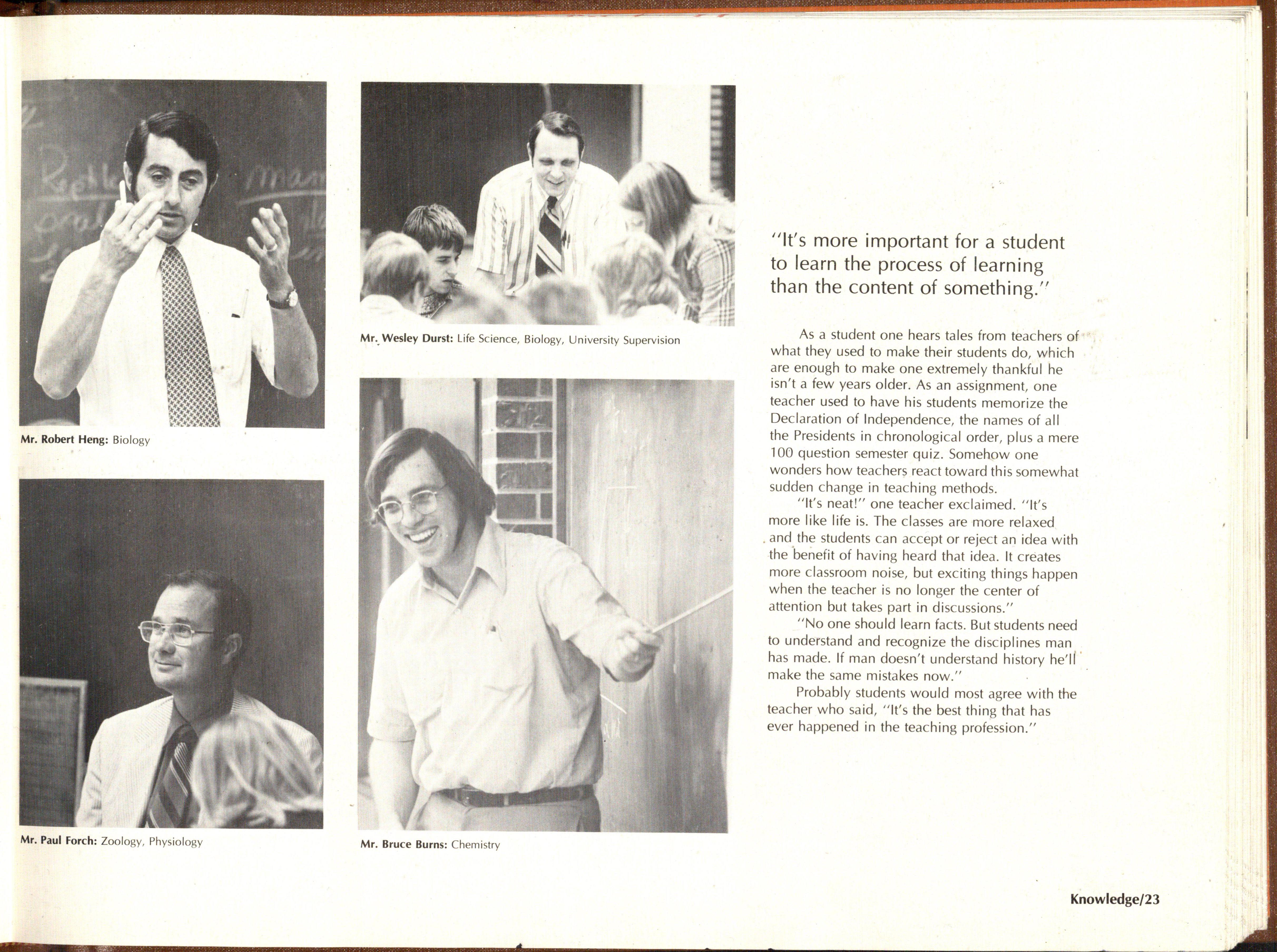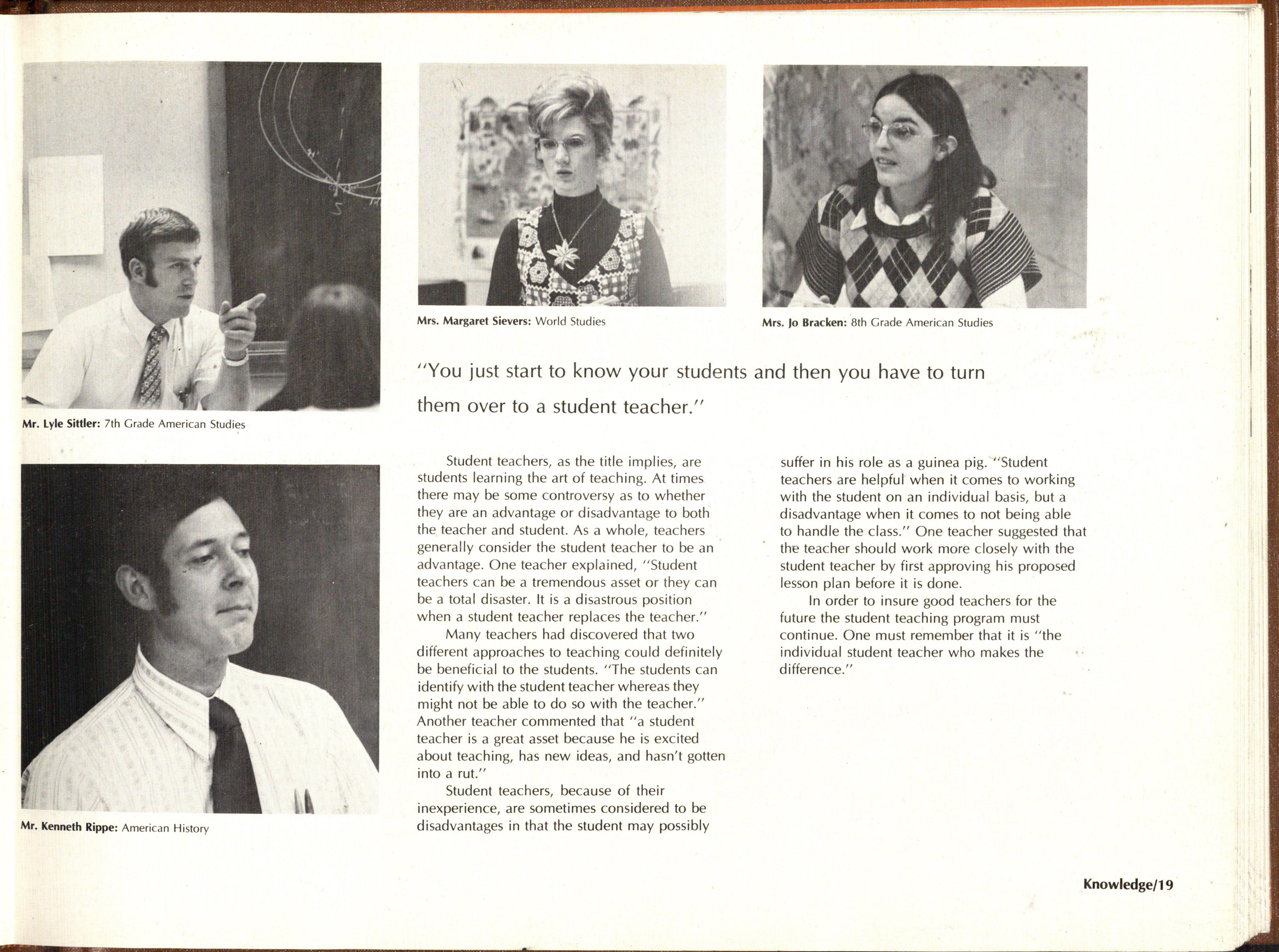 Many teachers had discovered that two different approaches to teaching could definitely be beneficial to the students. "The students can identify with the student teacher whereas they might not be able to do so with the teacher." Another teacher commented that "a student teacher is a great asset because he is excited about teaching, has new ideas, and hasn't gotten into a rut."