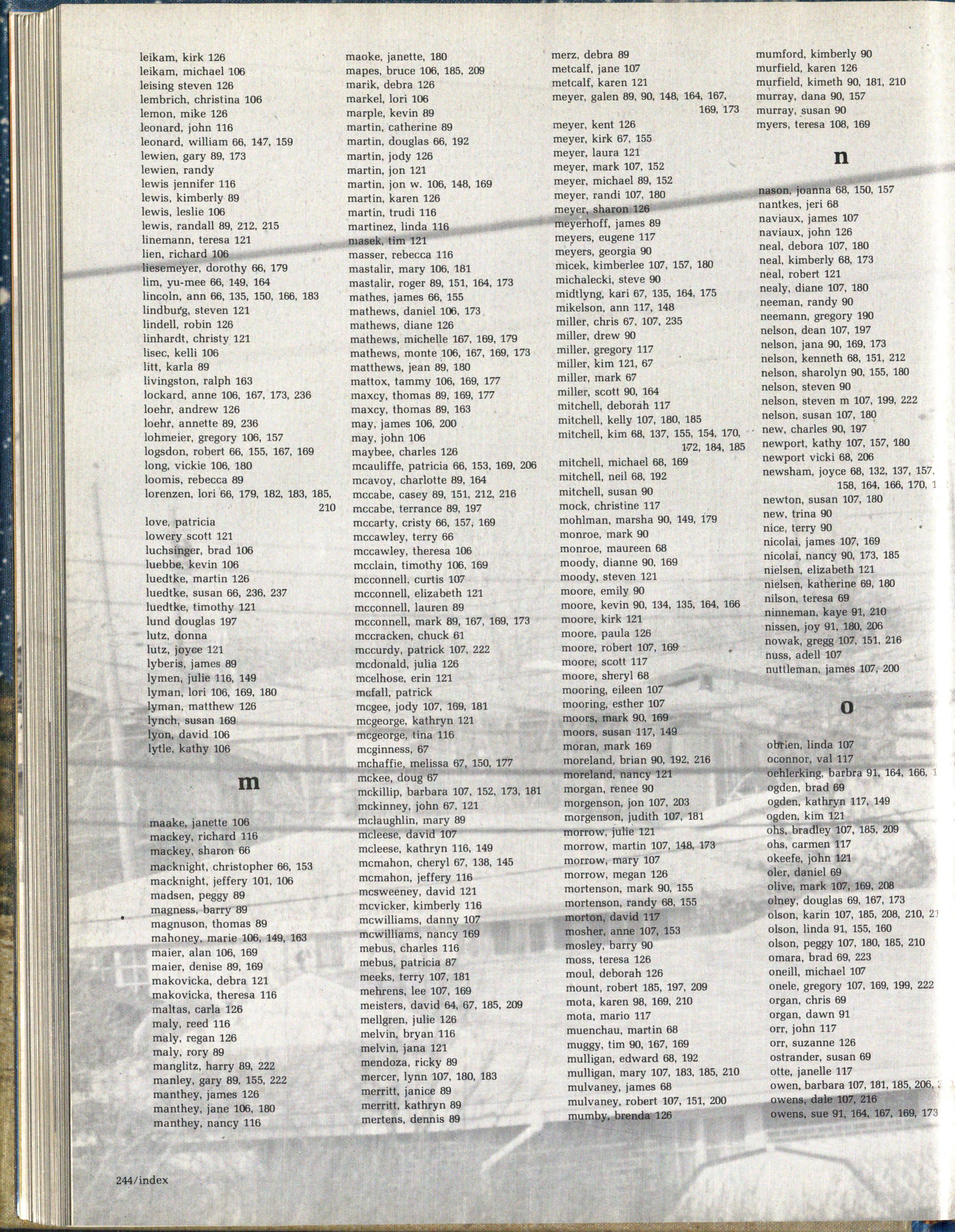 lembrich, christina 106 lemon, mike 126 leonard, john 116 leonard, william 66, 147, 159 lewien, gary 89, 173 lewien, randy lewis jennifer 116 lewis, kimberly 89 lewis, leslie 106 lewis, randall 89, 212, 215 linemann, teresa 121 lien, richard 106 liesemeyer, dorothy 66, 179 lim, yu-mee 66, 149, 164 lincoln, ann 66, 135, 150, 166, 183 lindburg, steven 121 lindell, robin 126 linhardt, christy 121 lisec, kelli 106 litt, karla 89 livingston, ralph 163 lockard, anne 106, 167, 173, 236 loehr, andrew 126 loehr, annette 89, 236 lohmeier, gregory 106, 157 logsdon, robert 66, 155, 167, 169 long, vickie 106, 180 loomis, rebecca 89 lorenzen, lori 66, 179, 182, 183, 185, 210 love, patricia lowery scott 121 luchsinger, brad 106 luebbe, kevin 106 luedtke, martin 126 luedtke, susan 66, 236, 237 luedtke, timothy 121 lund douglas 197 lutz, donna lutz, joyce 121 lyberis, james 89 lymen, julie 116, 149 lyman, lori 106, 169, 180 lyman, matthew 126 lynch, susan 169 lyon, david 106 lytle, kathy 106