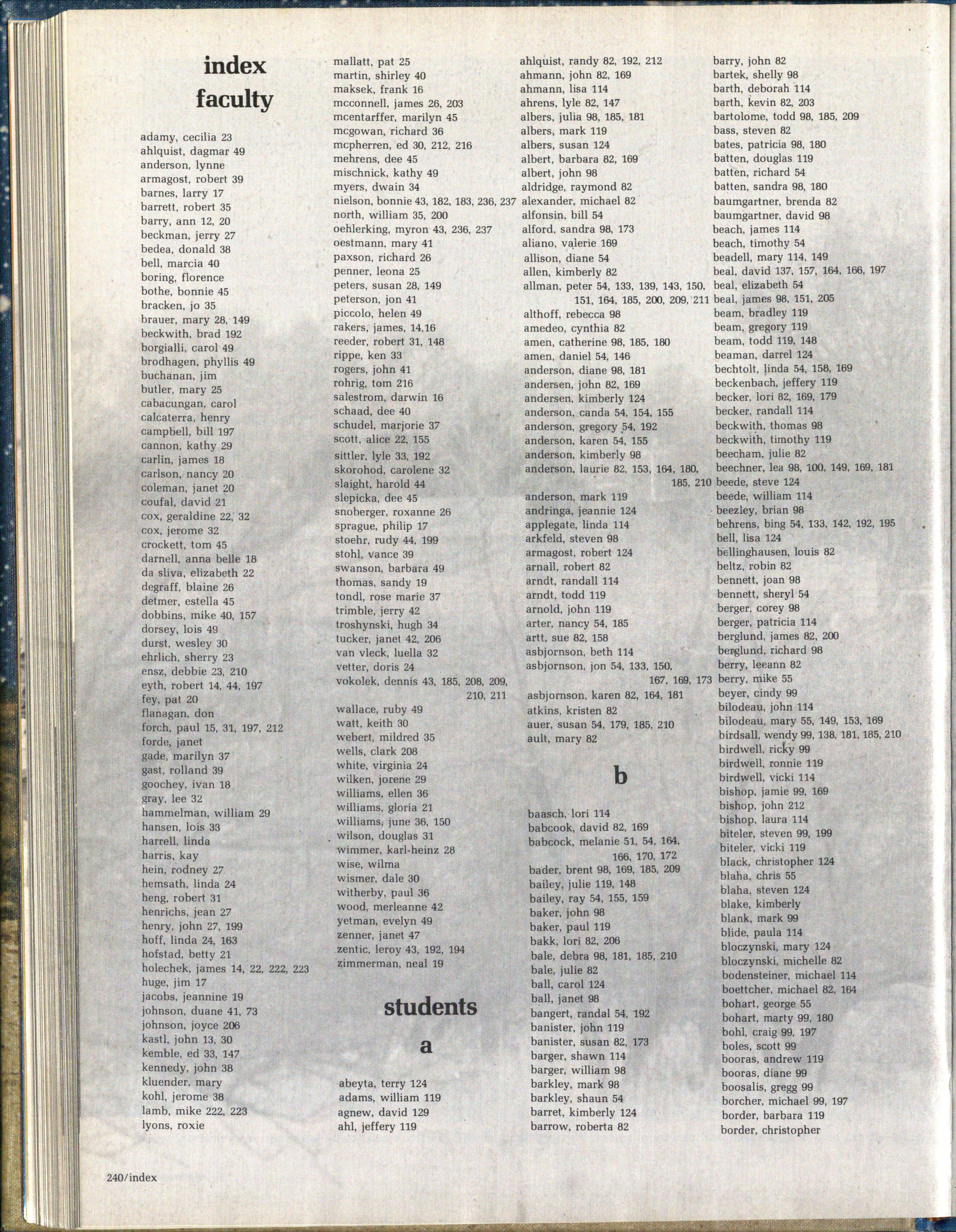 bbaasch,-lori 114 babcook, david 82, 169 babcock, melanie 51, 54, 164, 166, 170, 172 bader. brent 98, 169, 185, 209 bailey, julie 119, 148 bailey, ray 54, 155, 159 baker, john 98 baker, paul 119 bakk, lori 82, 206 bale, debra 98, 181, 185, 210 bale, julie 82 ball, carol 124 b~ll. janet 98 bangert, randal 54, 192 banister, john 119 banister, susan 82, 173 barger, shawn 114 barger, william 98 barkley, mark 98 barkley, shaun 54 barret, kimberly 124 barrow, roberta 82