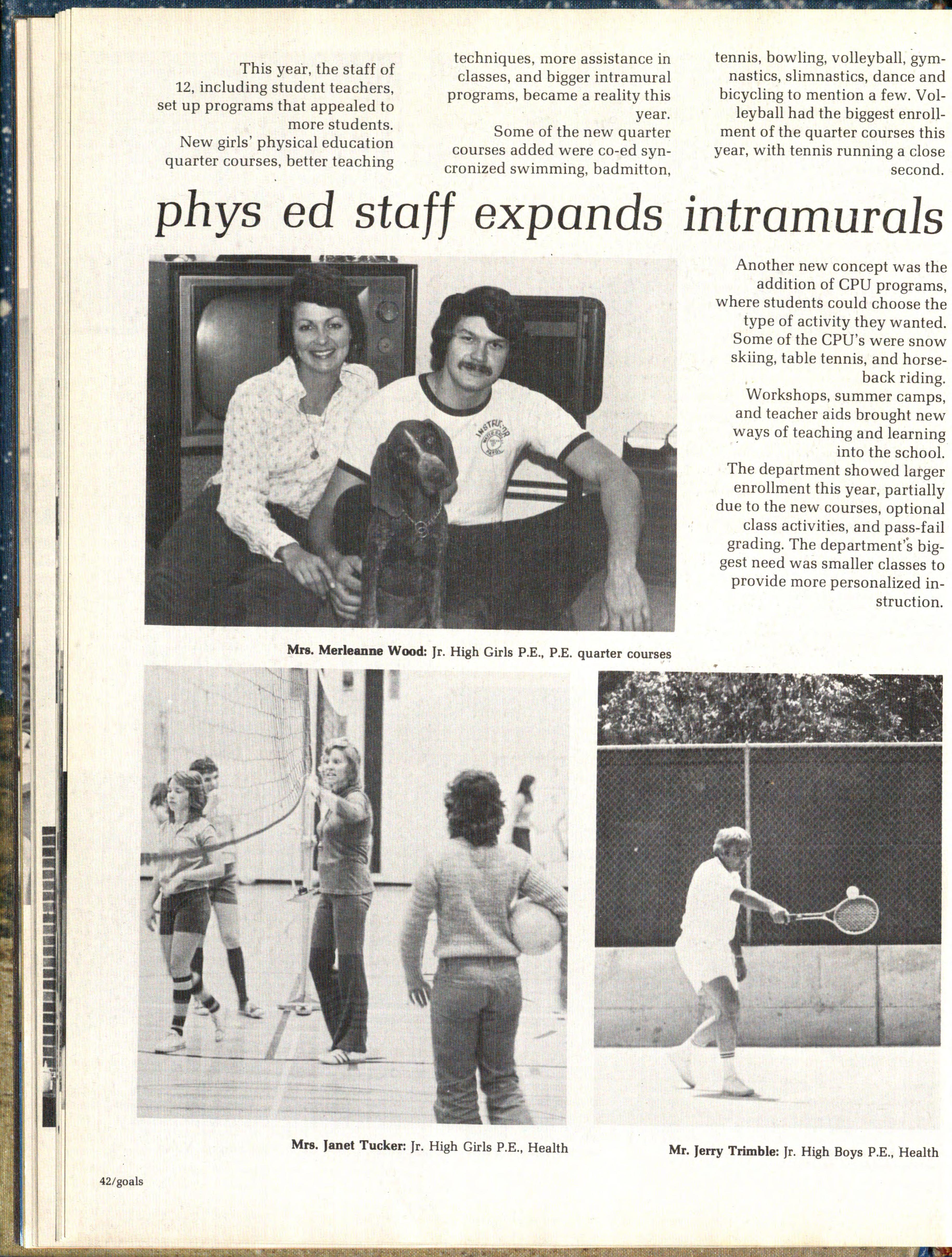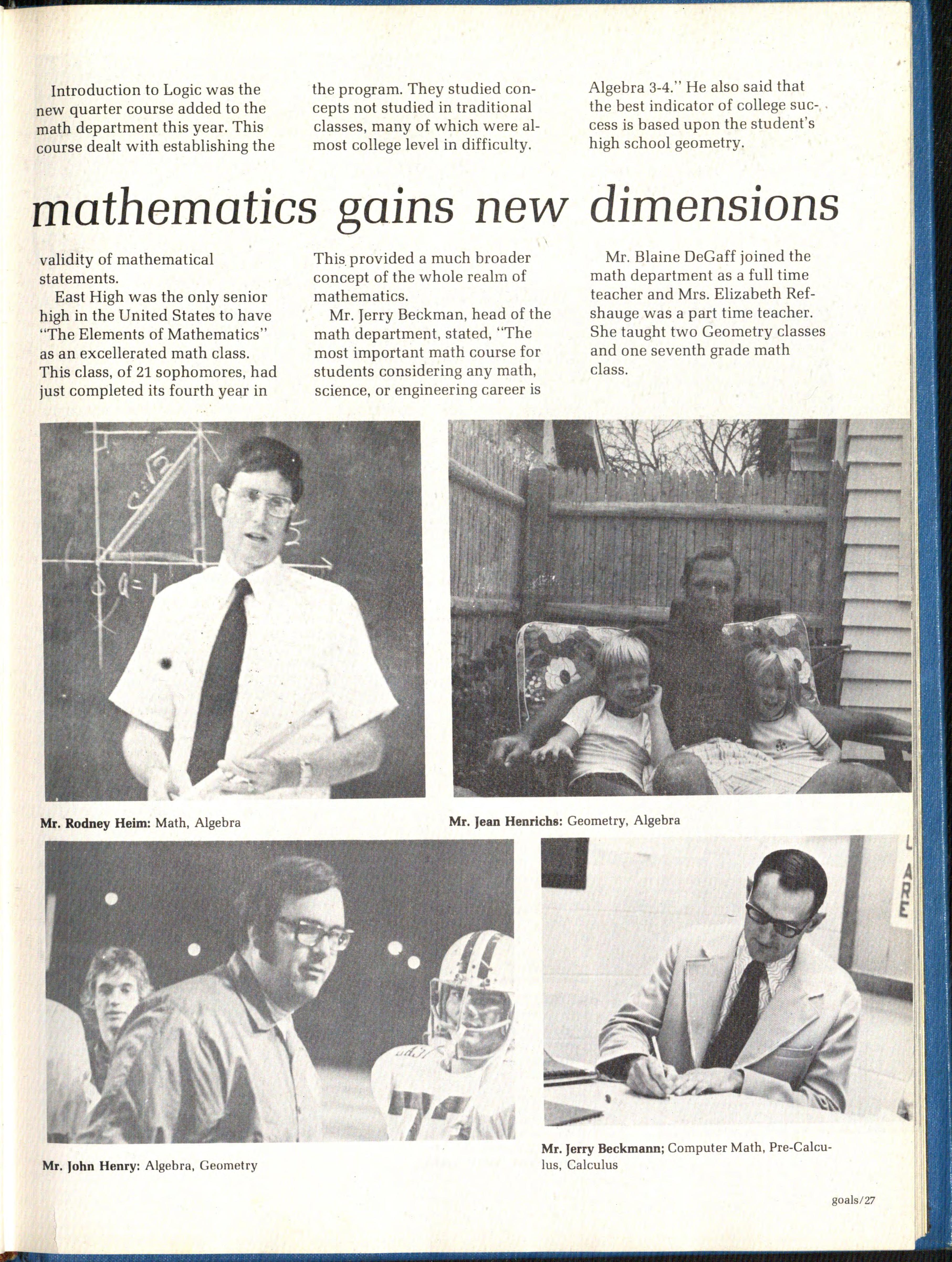 Mr. Blaine DeGaff joined the math department as a full time teacher and Mrs. Elizabeth Refshauge was a part time teacher. She taught two Geometry classes and one seventh grade math class.