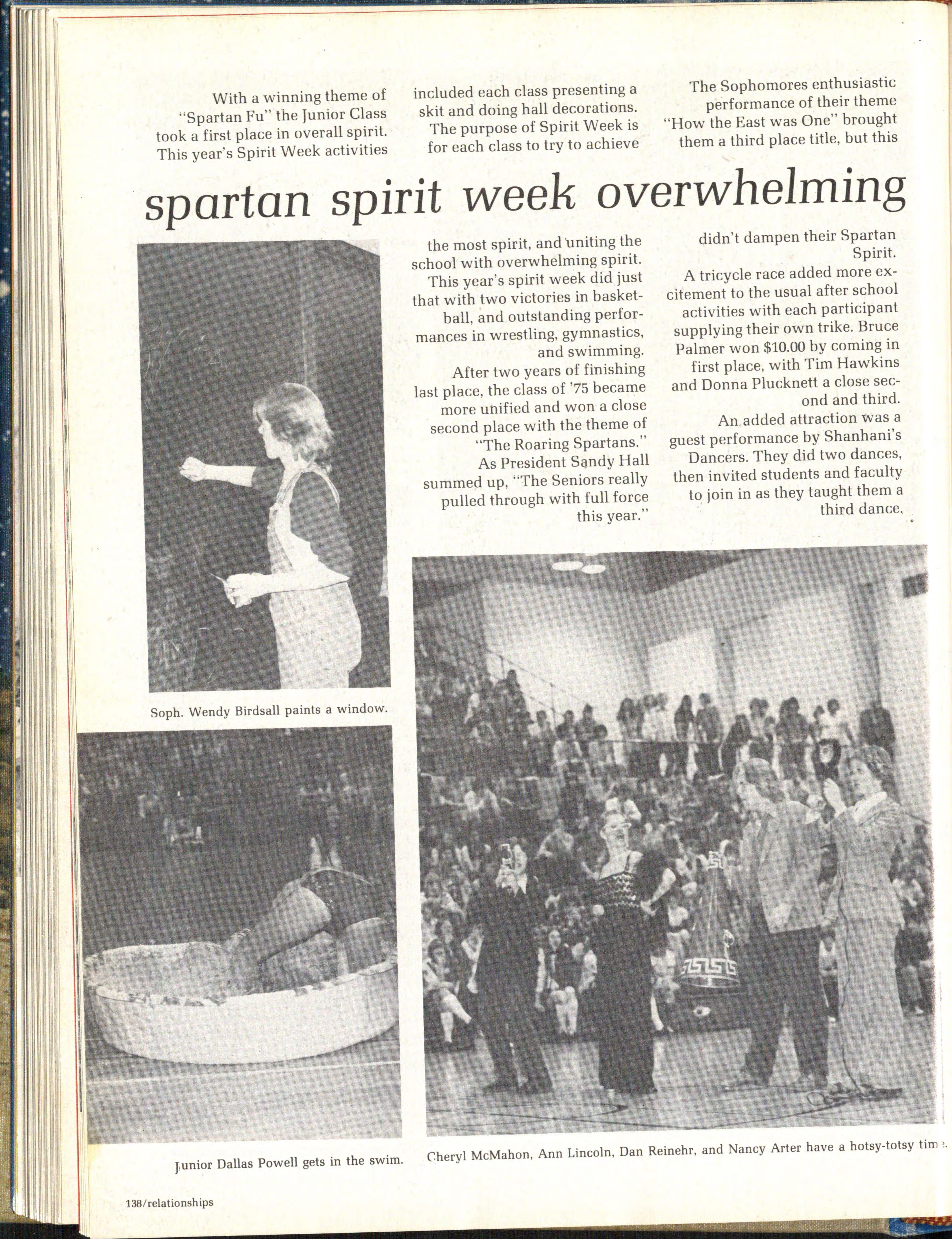Championship, leading to a sta t berth. Lincoln High was Eas t' biggest threat throughout the se ? son, but they never could ups t the Spartans in any of their fo e meetings. East defeated Linea l High in the State Championsh j games, 15-8 and 15-9. East is t h first Lincoln school to bri n home a state titl East was the most experienc e team in-the city with five retu n ing letterman, several former r \ serve players and some go · sophomores. Mr. Myron Oehle r .1 ing coached his third year of v c leyball at East this season. The award winners this y e ; included: Sue Luedtke and Ge o gette Caddy who won All-C i · and All-State Awards, and Kr Hermanson who won the S e toma Awa r