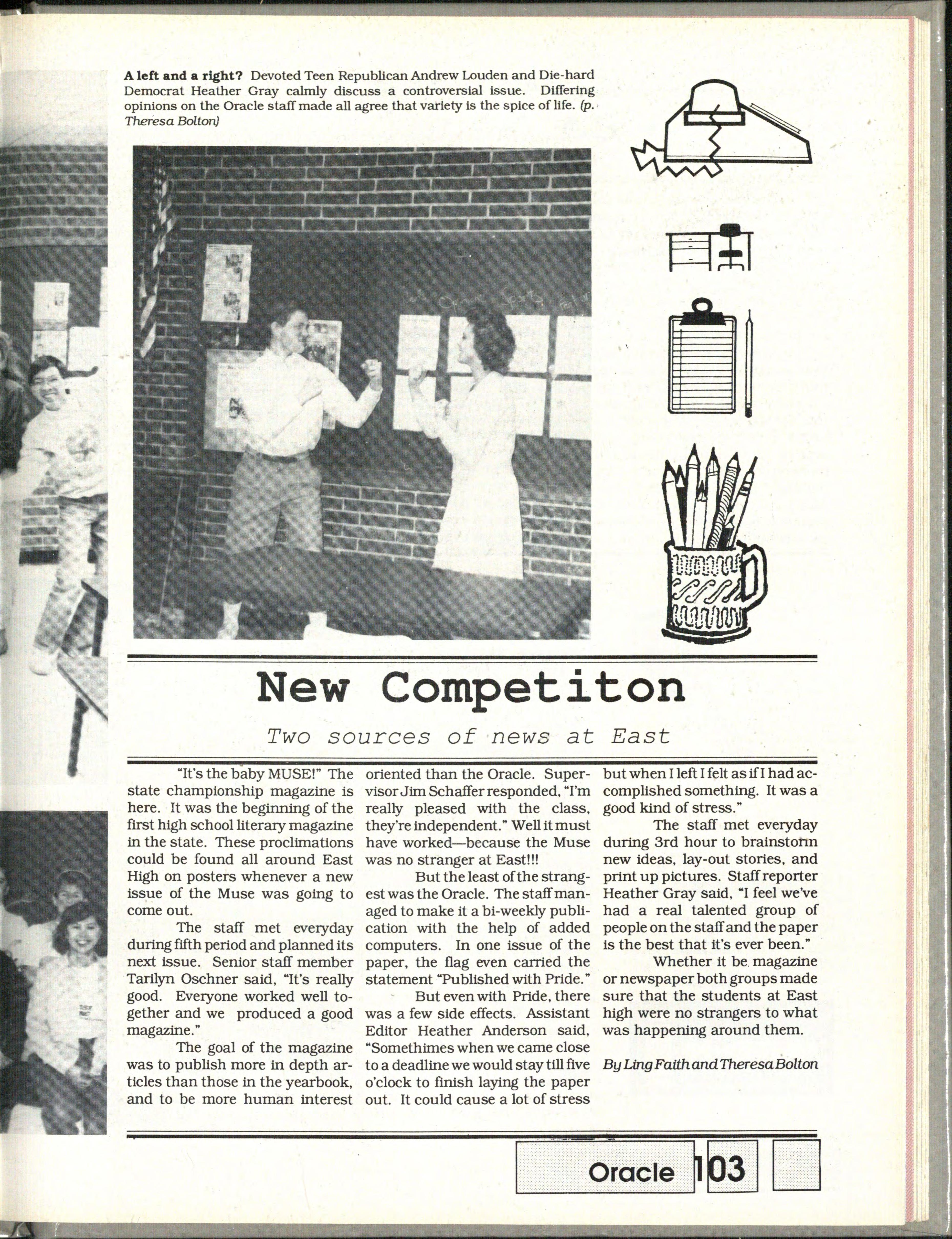 Strolling down the glass hallway was a guy clad in faded Levi's, a rugby, smelling of Polo and wearing scuffed loafers, and a girl in low cut boots, Girbaud pants and an oversized cardigan. Speeding by was a boy with a large binder, several pens with papers trailing behind almost colliding with a young woman decked out in the latest leather outfit complemented with a concert T-shirt. The usual array of sports heroes arid their avid supporters in the blue and white skirts. Stranger than you think? No, these were everyday scenes in the hallways of East.