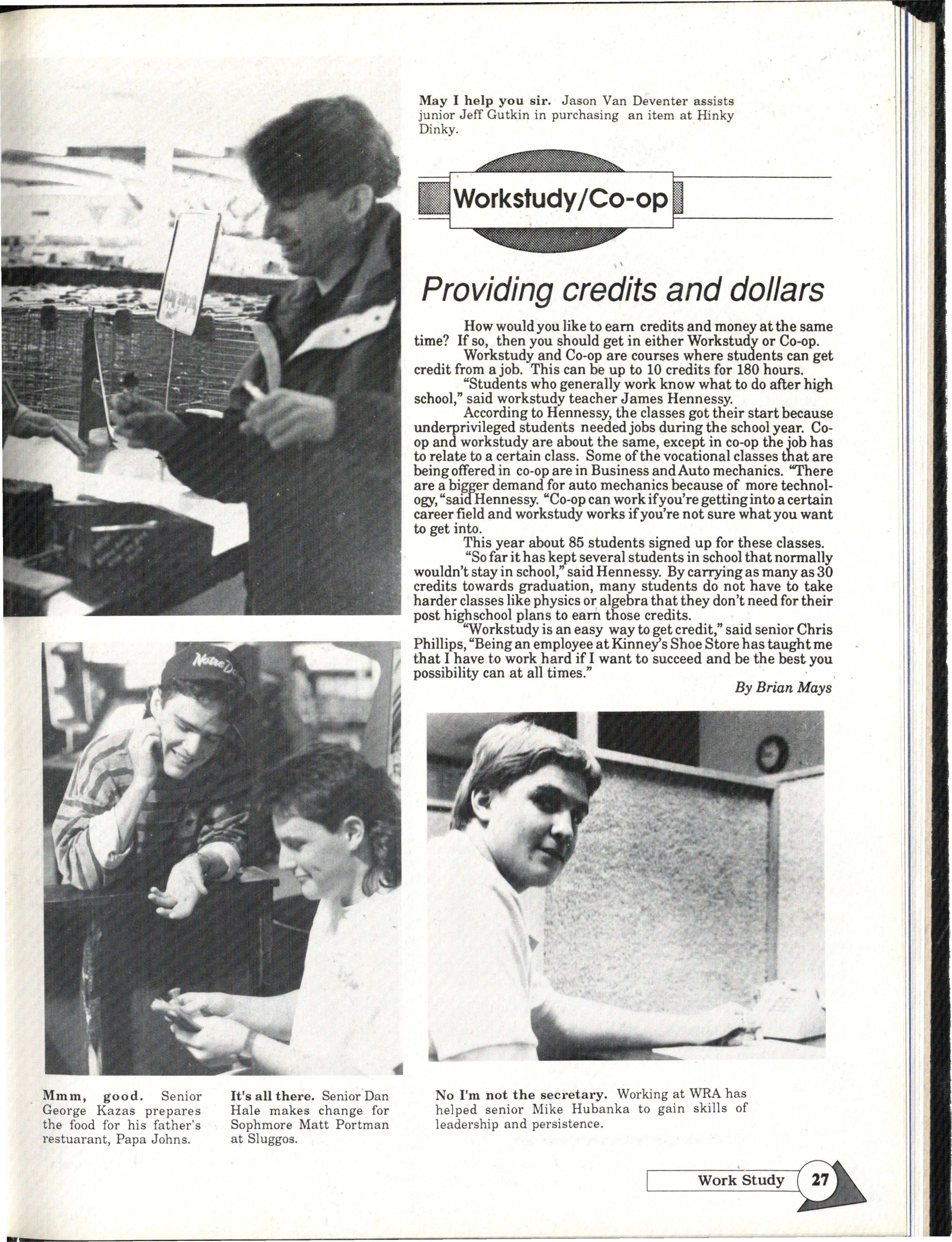According to Hennessy, the classes got their start because underprivileged students needed jobs during the school year. Coop and workstudy are about the same, except in co-op the job has to relate to a certain class. Some of the vocational classes that are being offered in co-op are in Business and Auto mechanics. "There are a bigger demand for auto mechanics because of more technology, "said Hennessy. "Co-op can work ifyou're getting into a certain career field and workstudy works if you're not sure what you want to get into. •