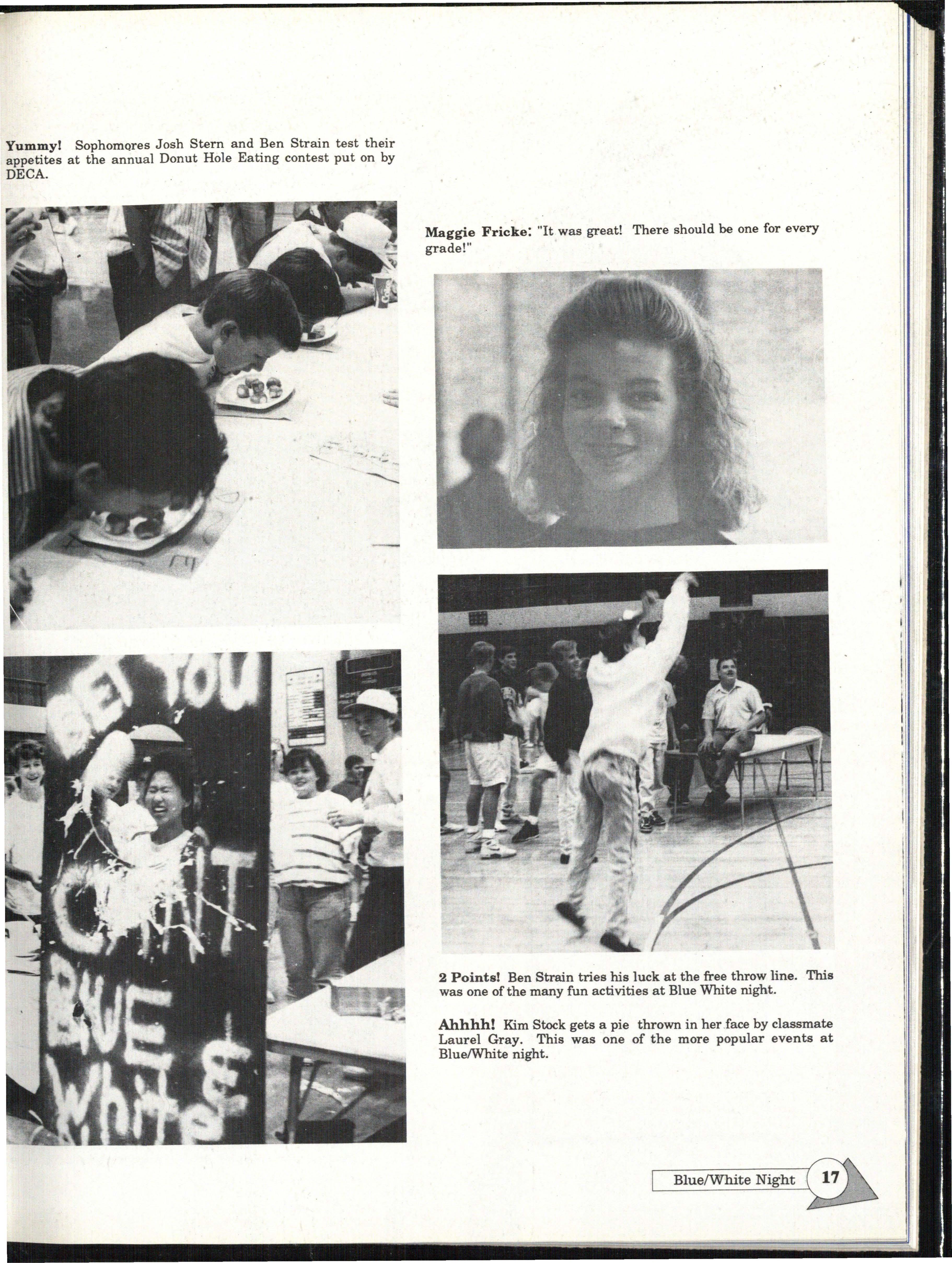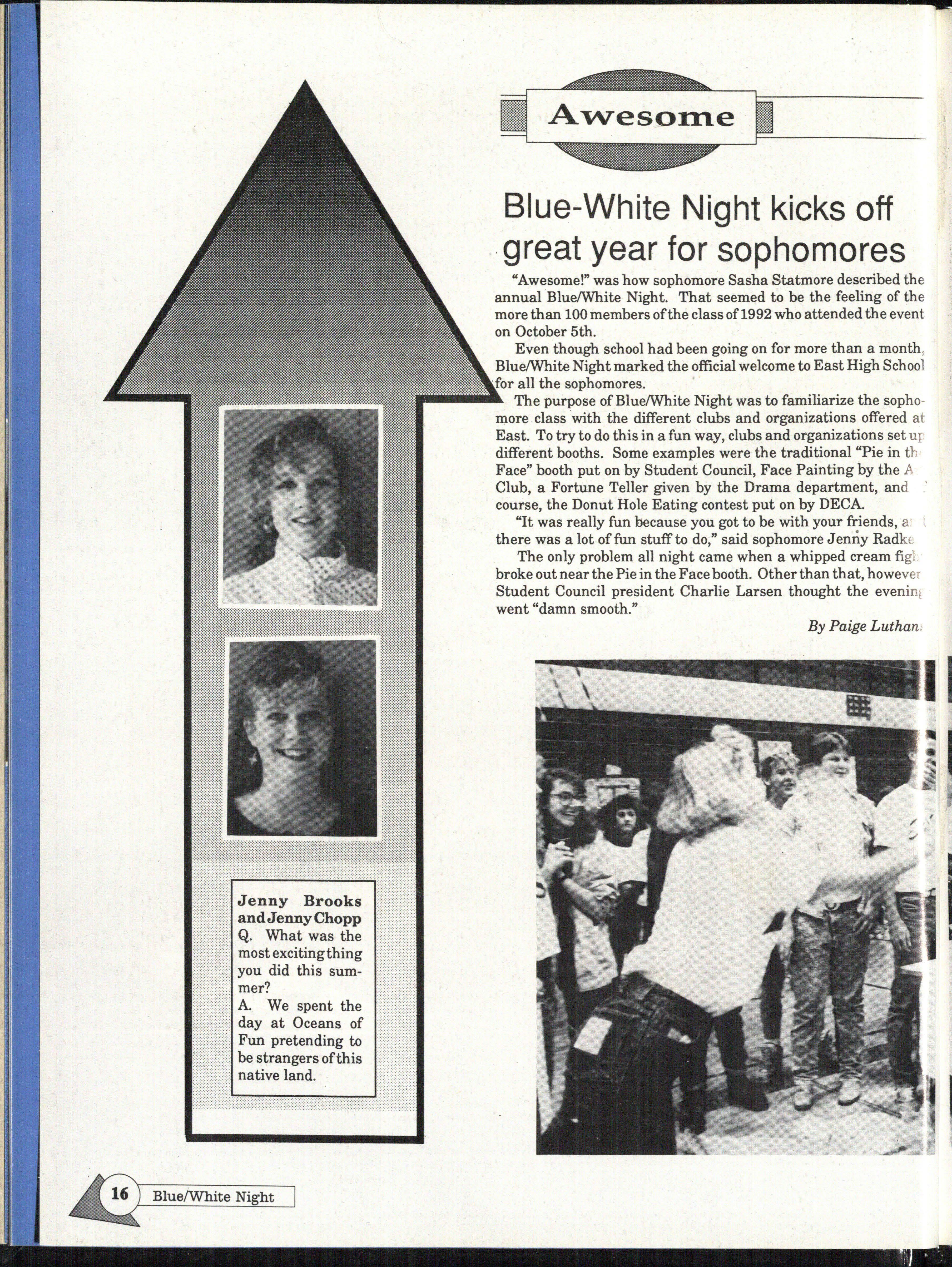 "Awesome!" was how sophomore Sasha Statmore described th e annual Blue/White Night. That seemed to be the feeling of th e more than 100 members of the class of 1992 who attended the event on October 5th.