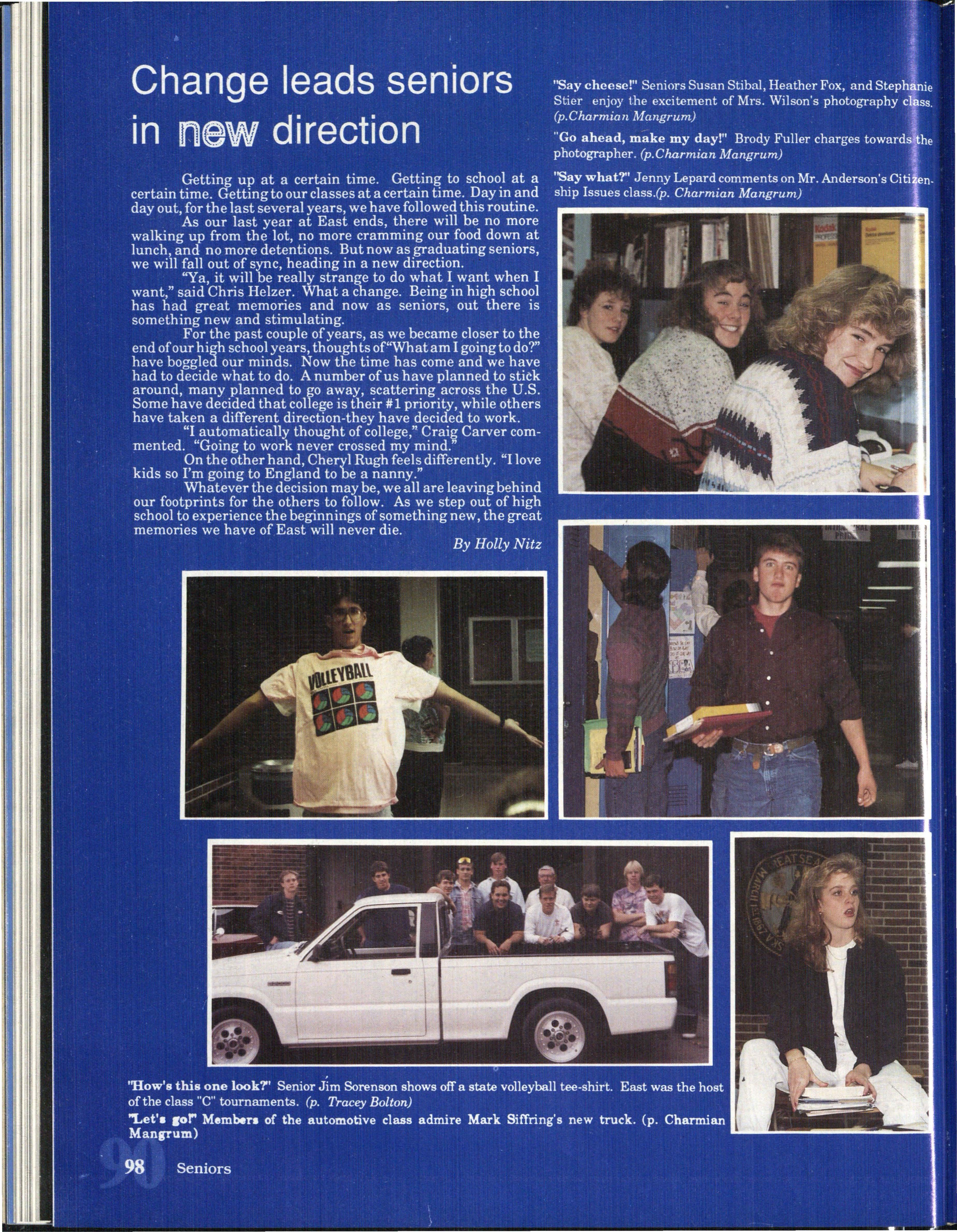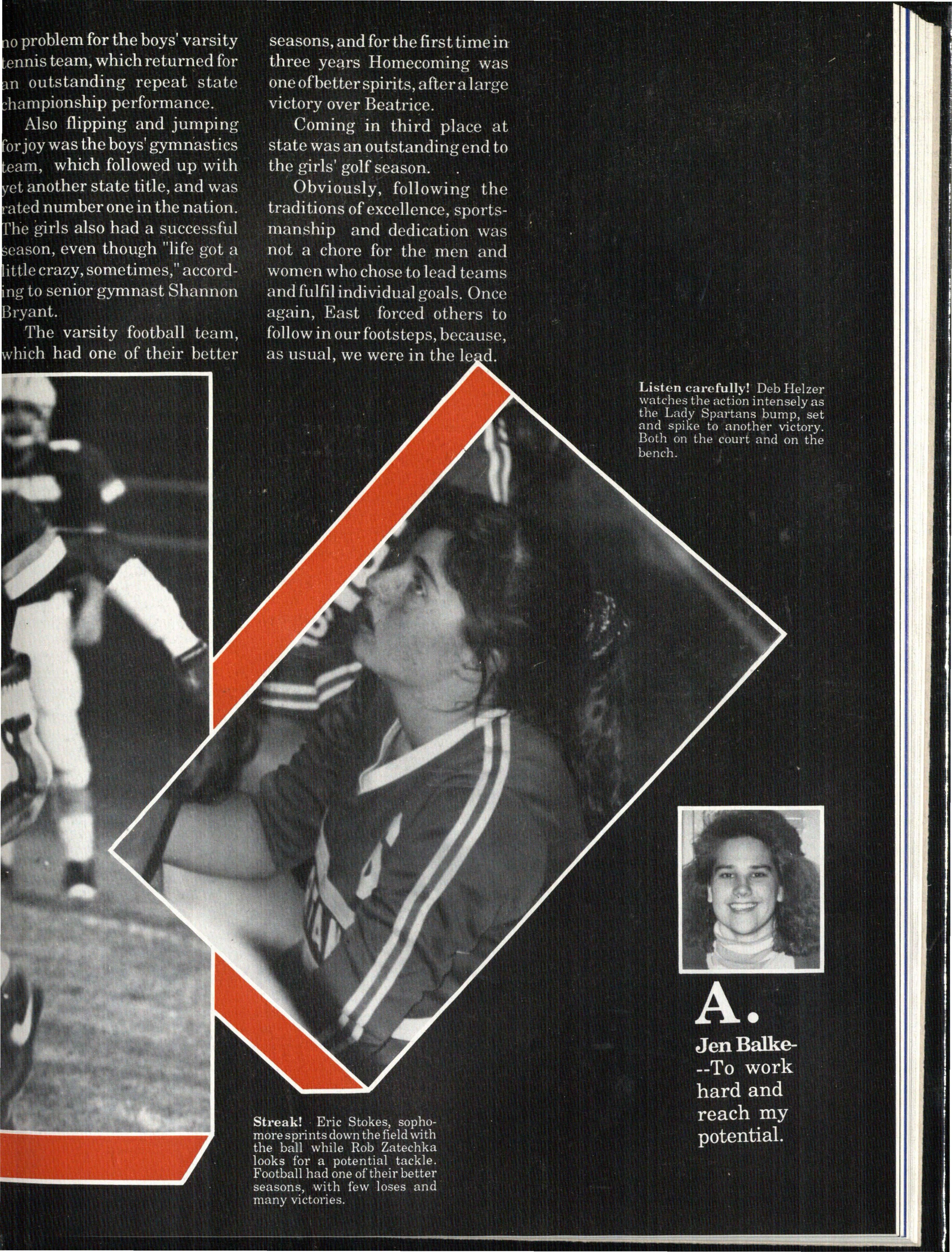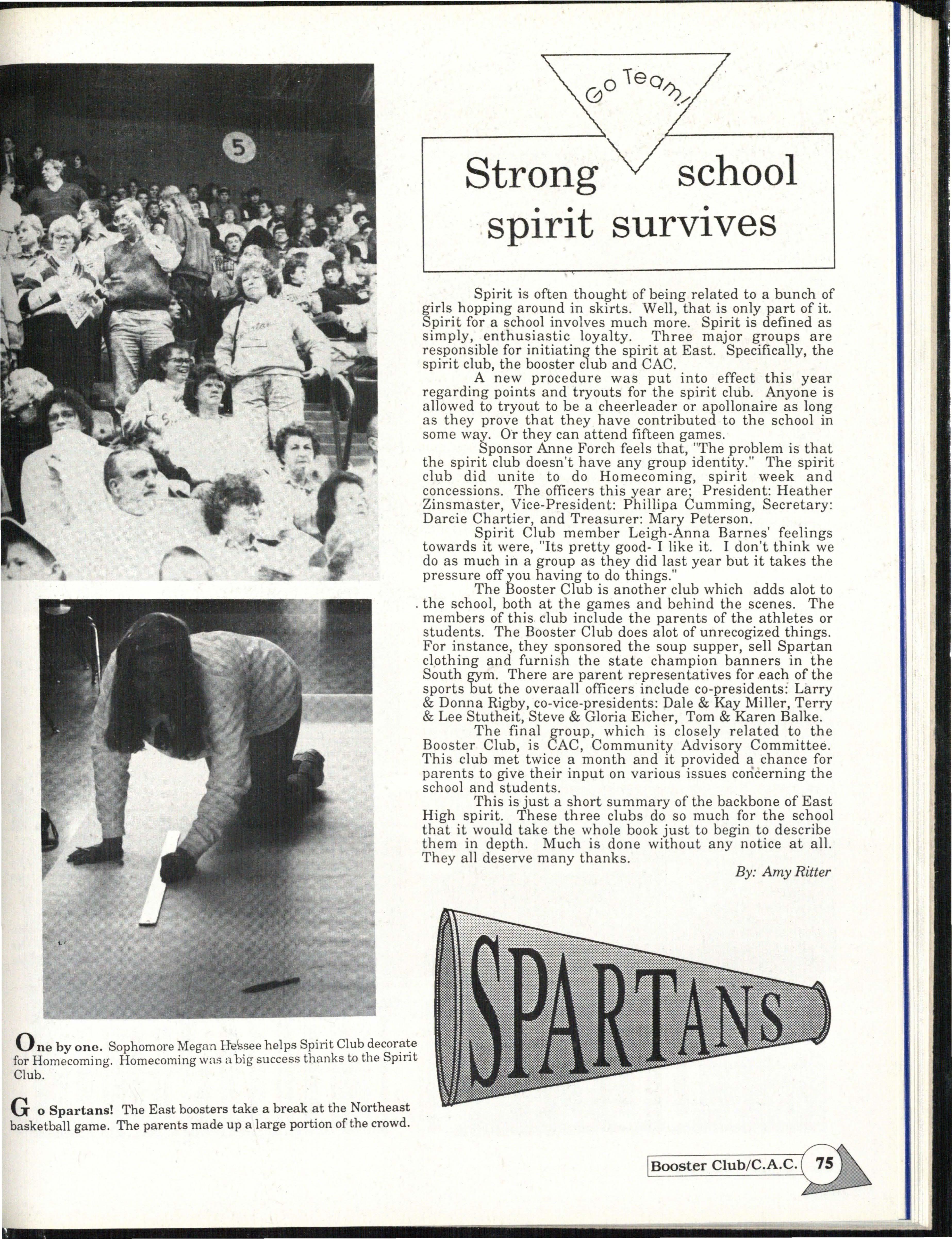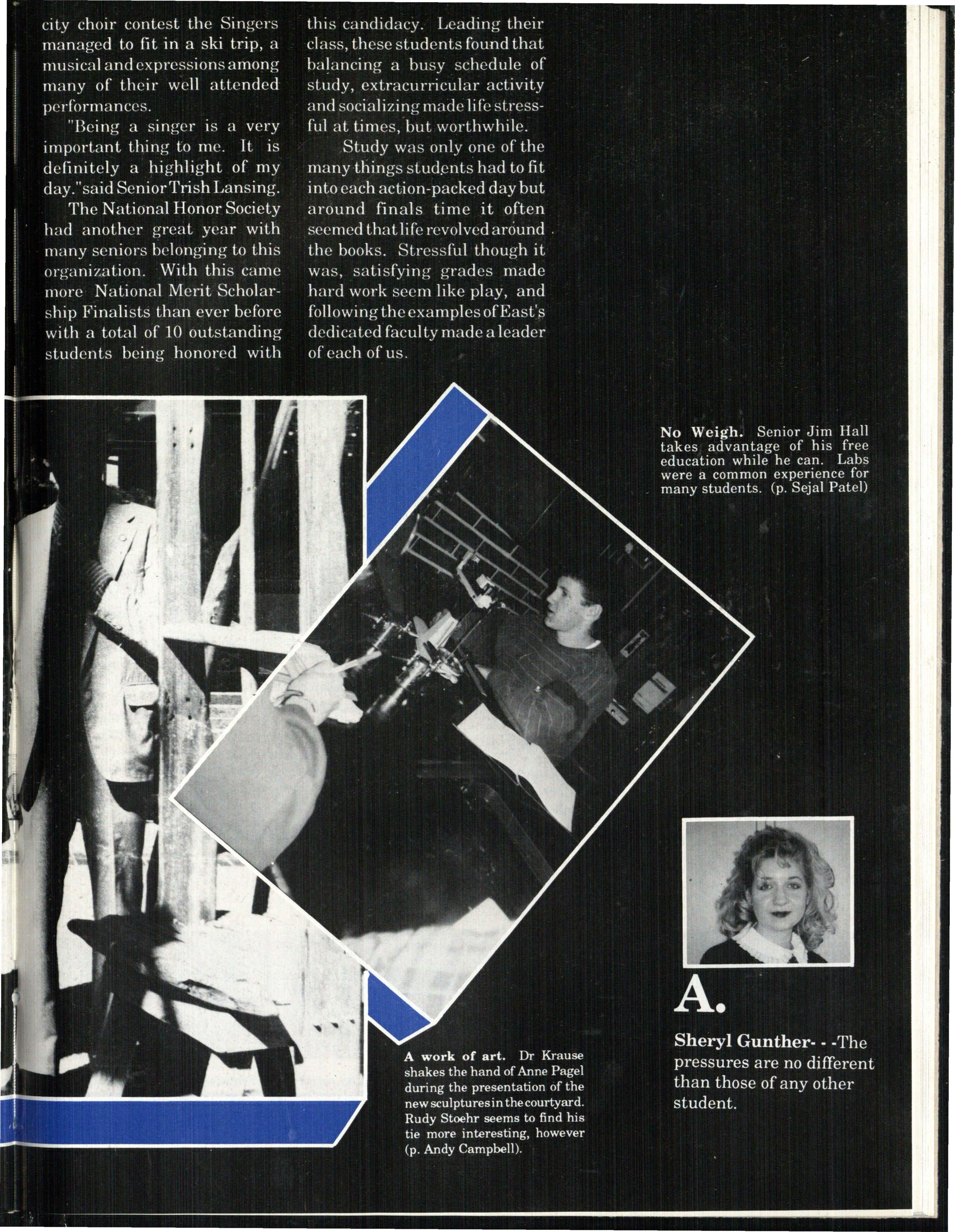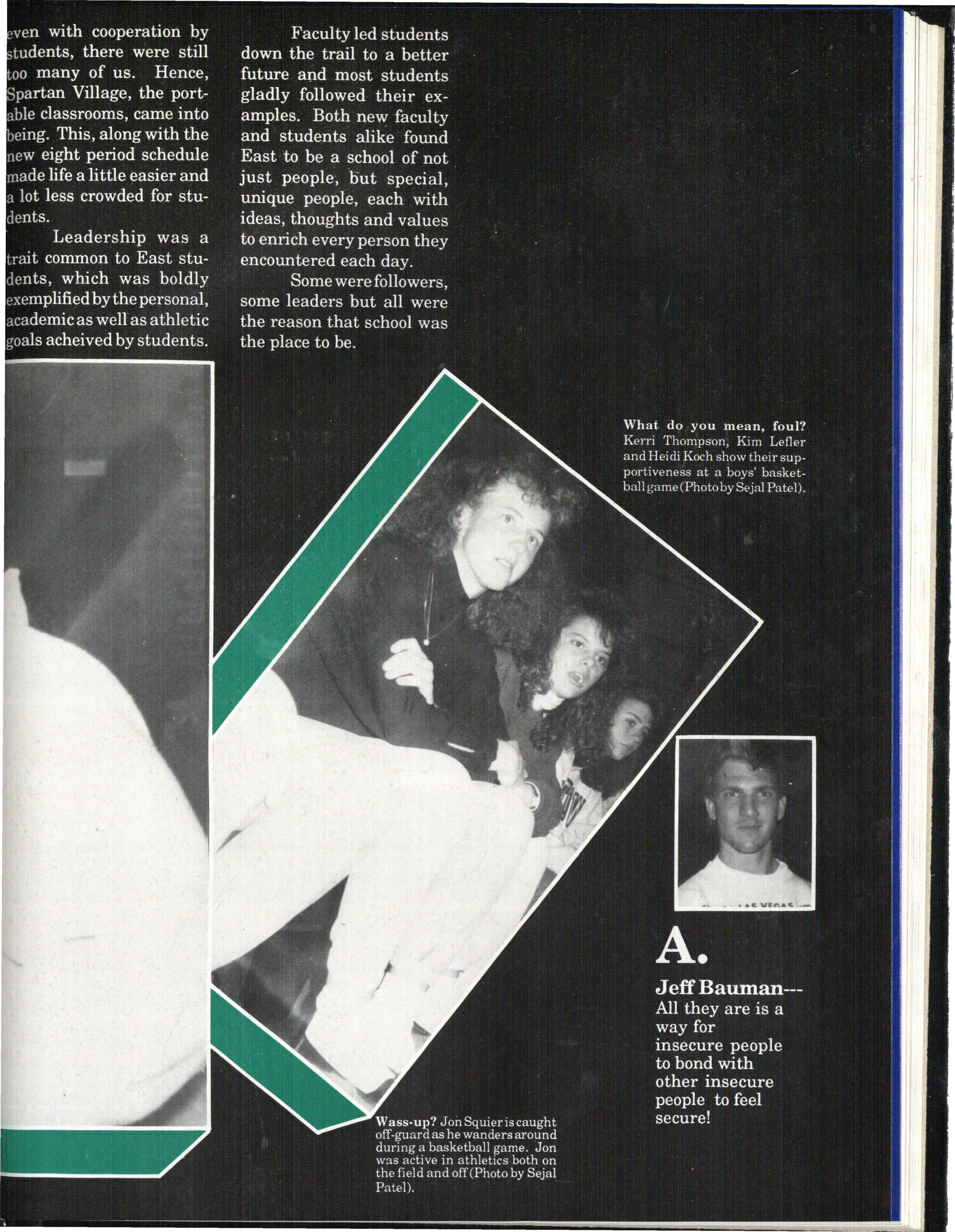 At times, following a few unhappy incidents during the year, it seemed easy to just throw in the towel, to follow a gut feeling of defeat. Thanks to East's strong-willed student body and caring faculty, this attitude was cured by a lot of support and TLC. Said Senior Dan Hale, "I think people dealt with their problems pretty well. Of course, everything takes time .. "