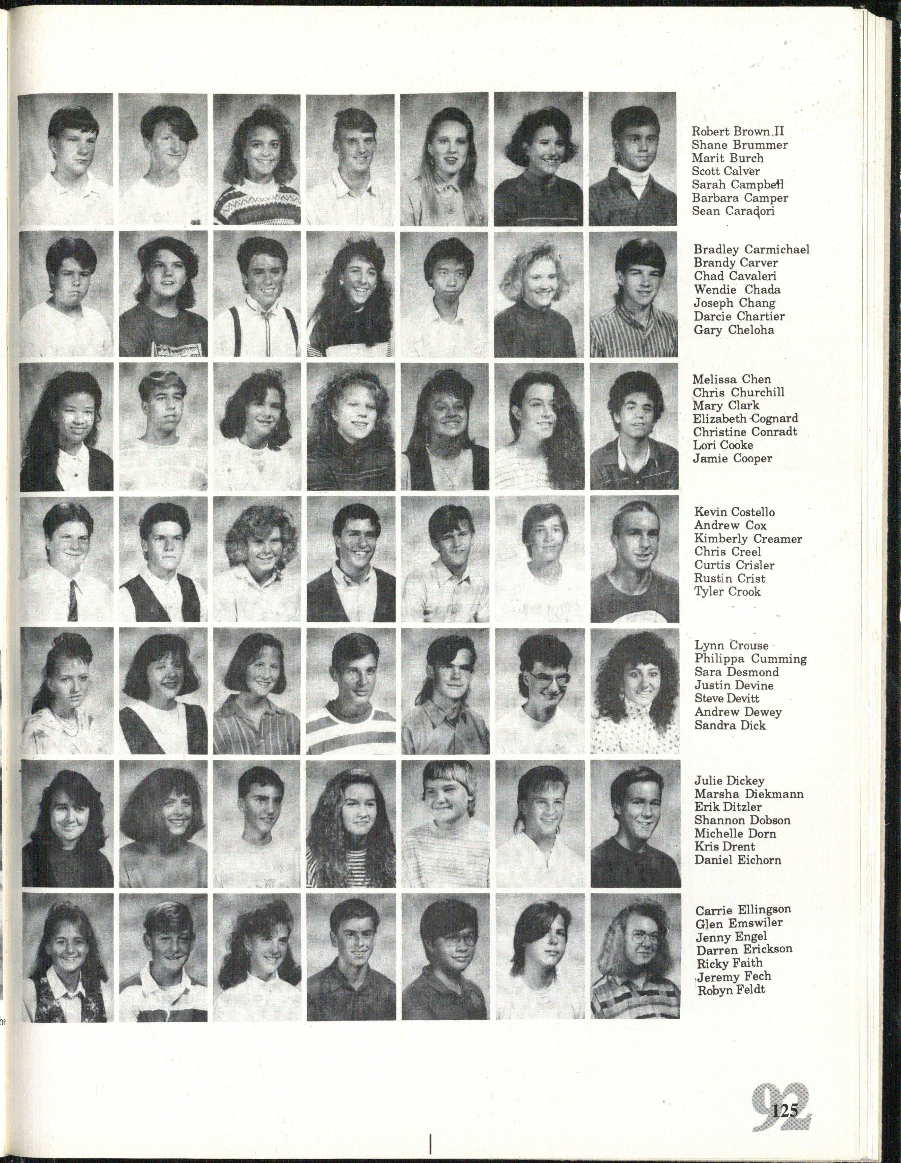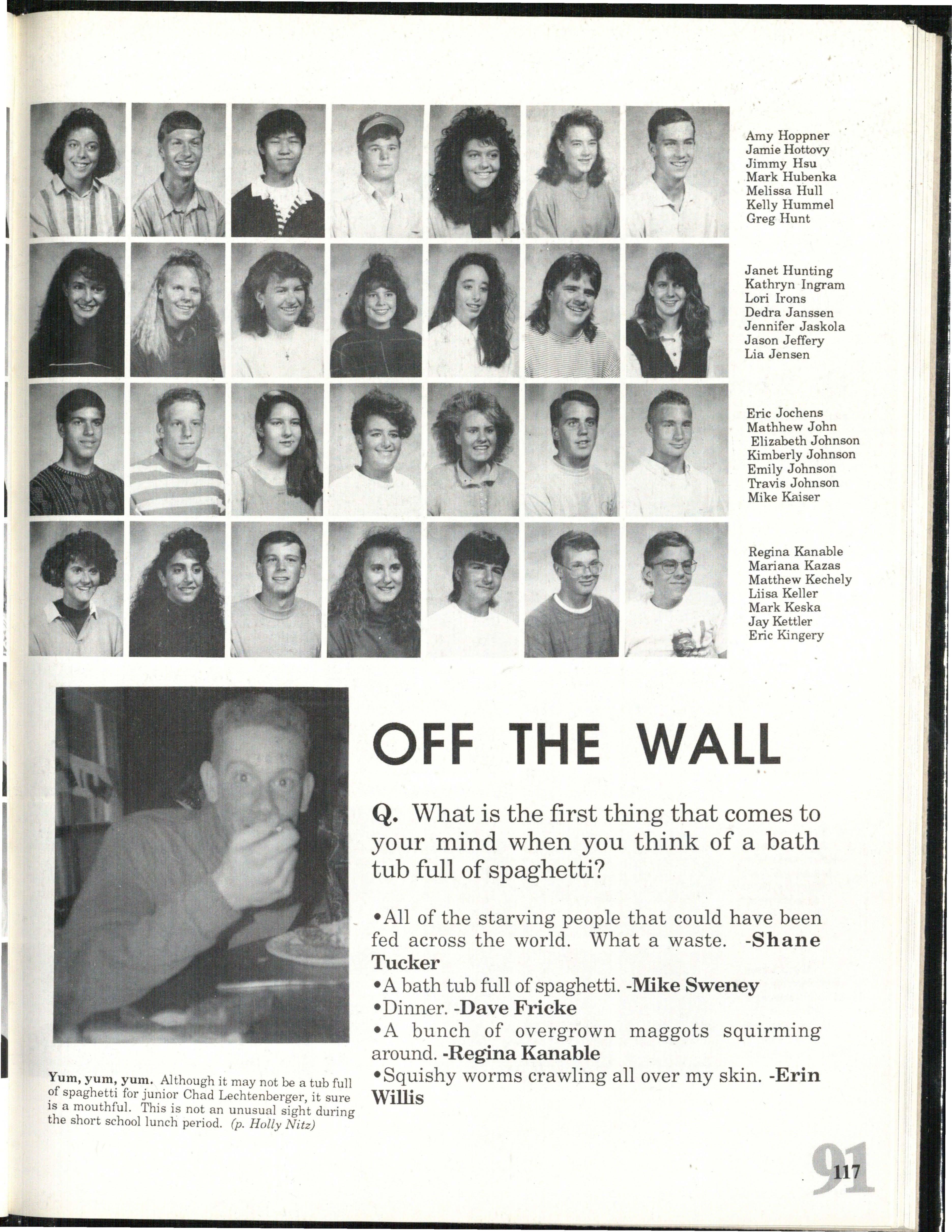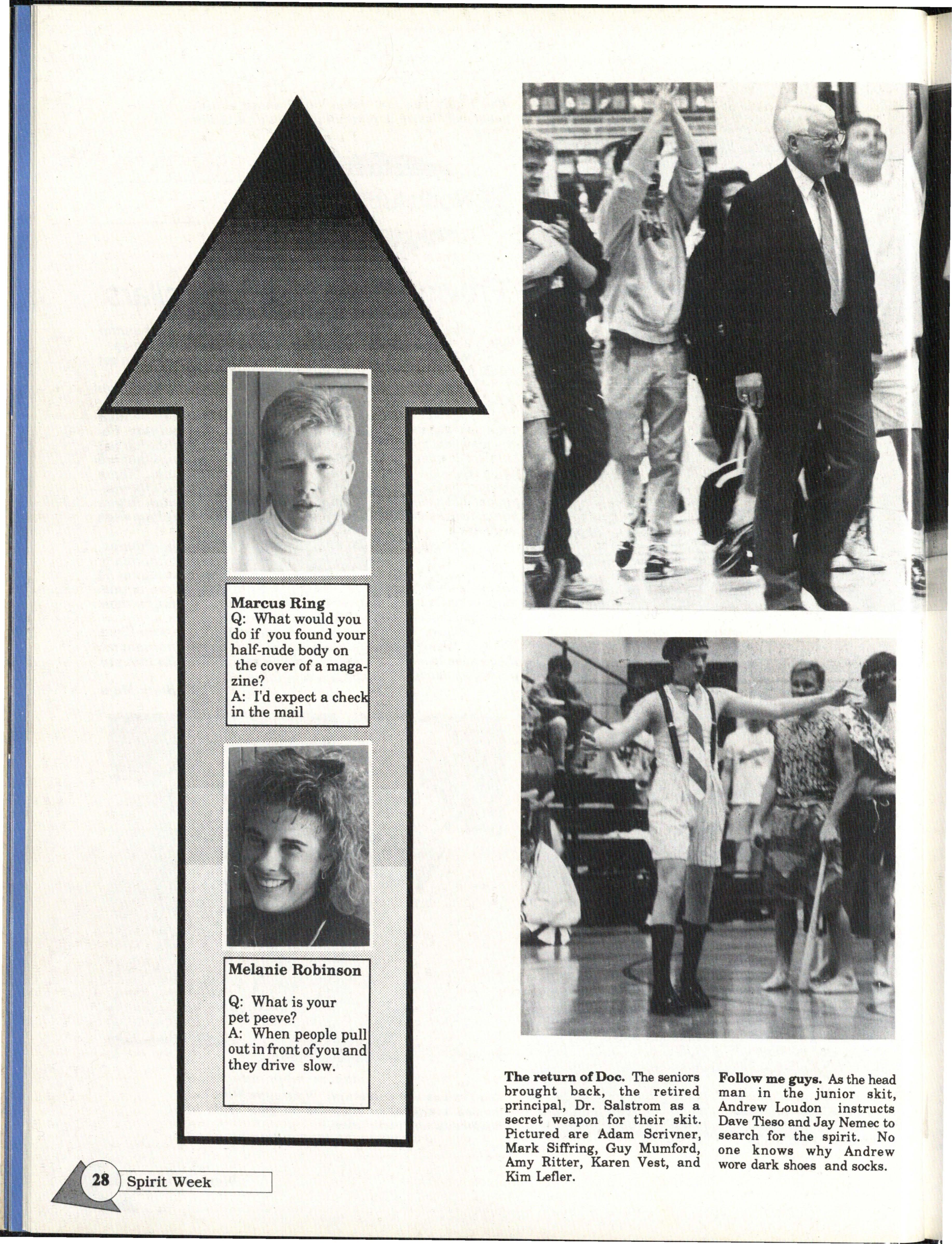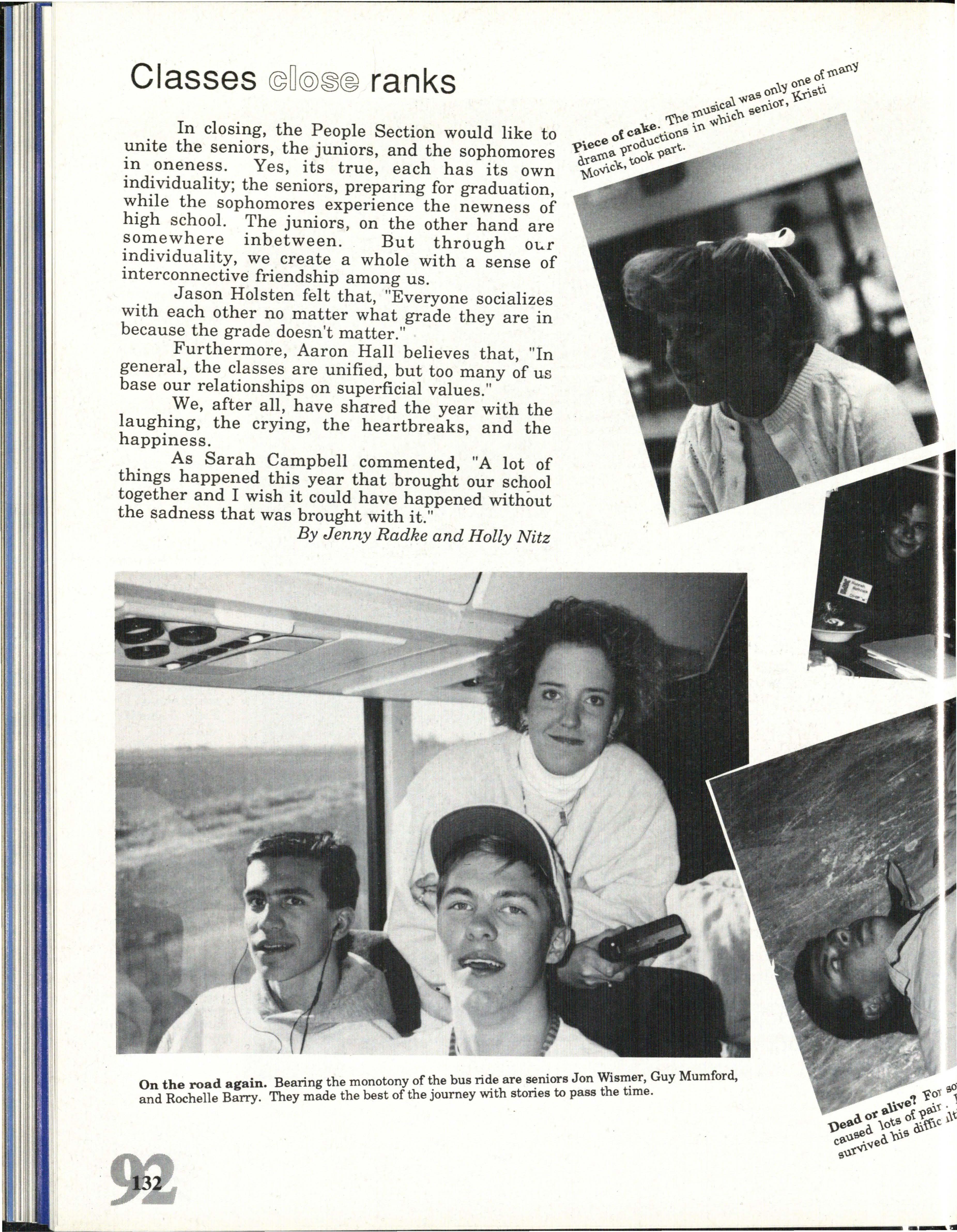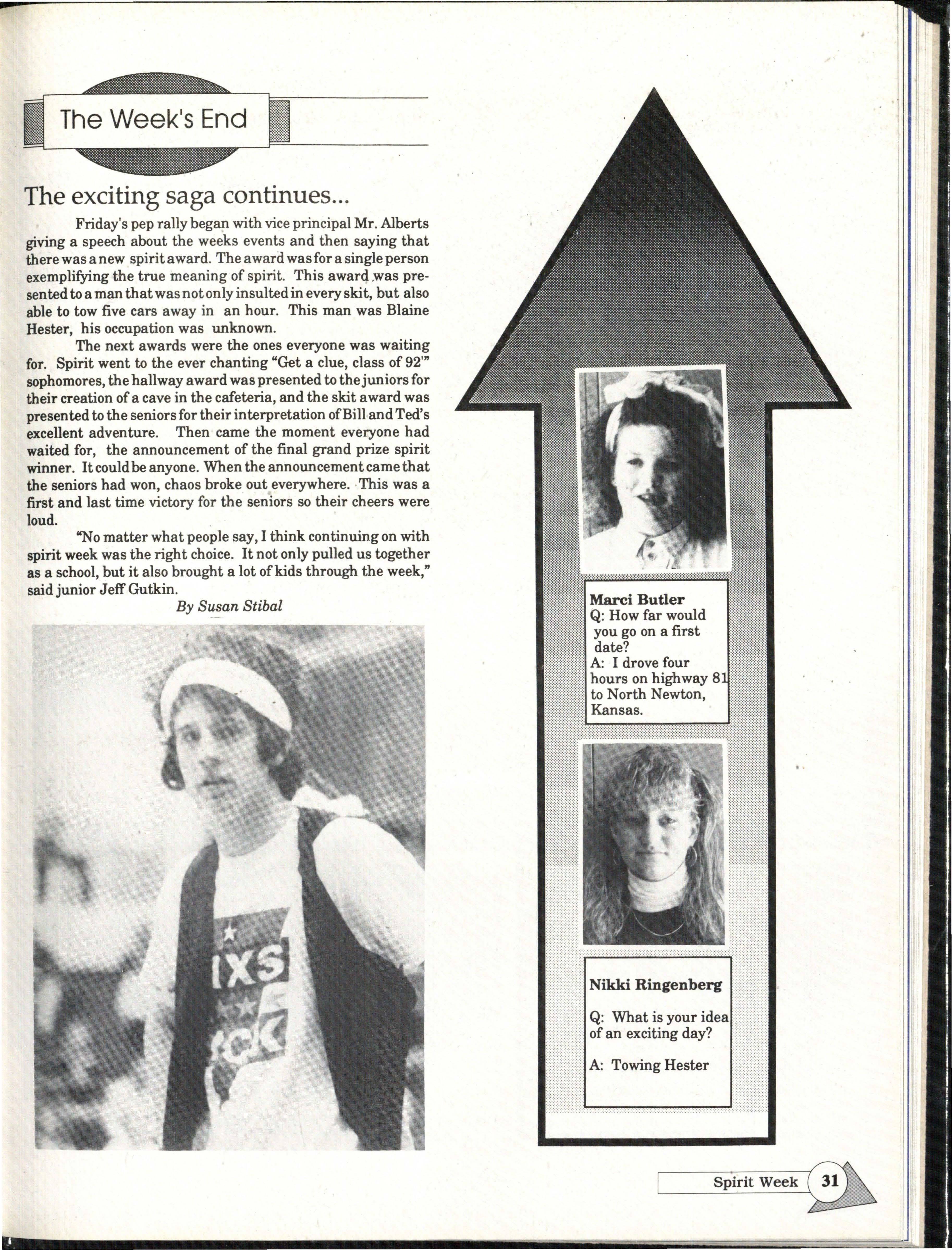 The next awards were the ones everyone was waiting for . Spirit went to the ever chanting "Get a clue, class of 92'" sophomores, the hallway award was presented to the juniors for their creation of a cave in the cafeteria, and the skit award was presented to the seniors for their interpretation of Bill and Ted's excellent adventure. Then came the moment everyone had waited for, the announcement of the final grand prize spirit winner. It could be anyone When the announcement came that the seniors had won, chaos broke out everywhere. This was a first and last time victory for the seniors so their cheers were loud.