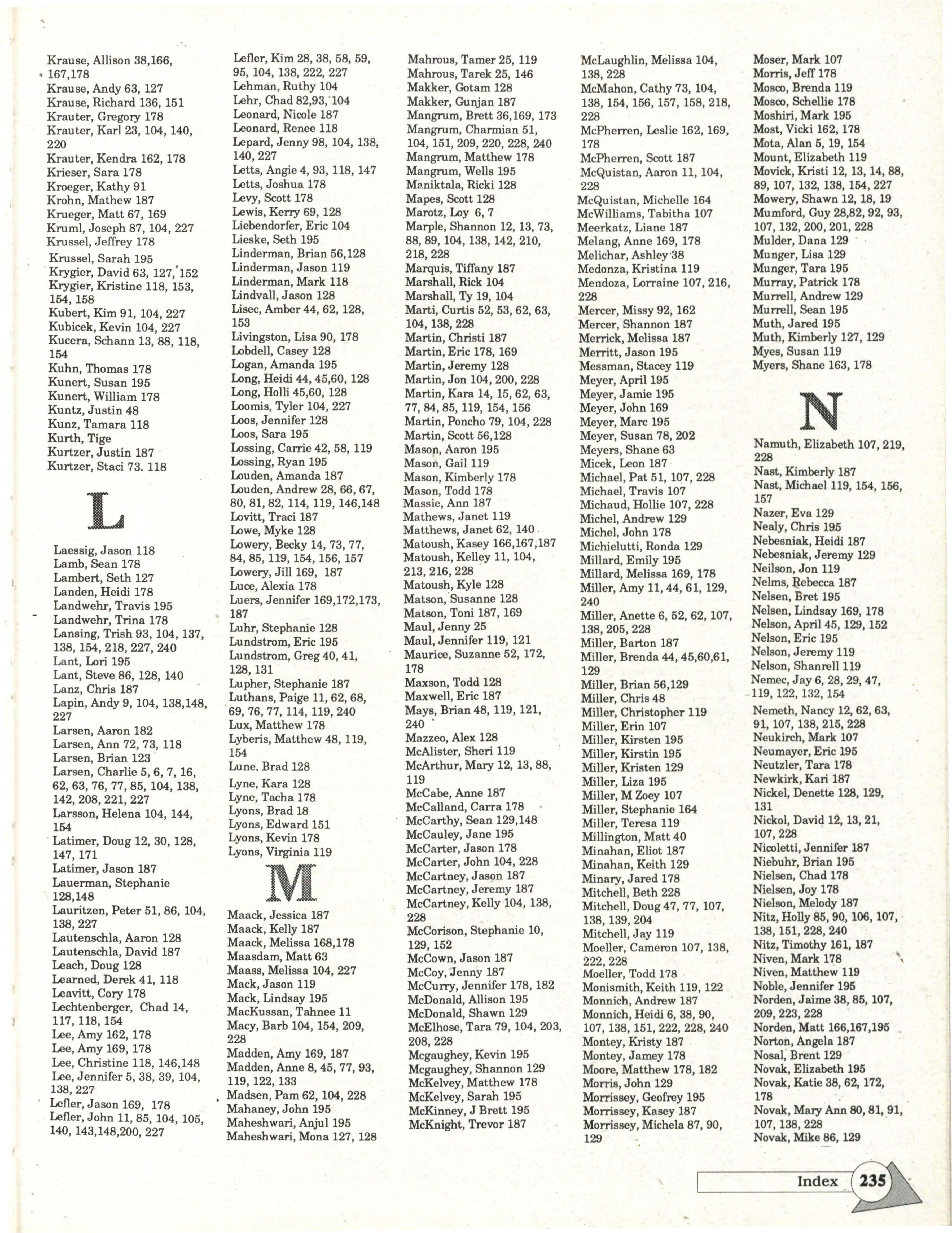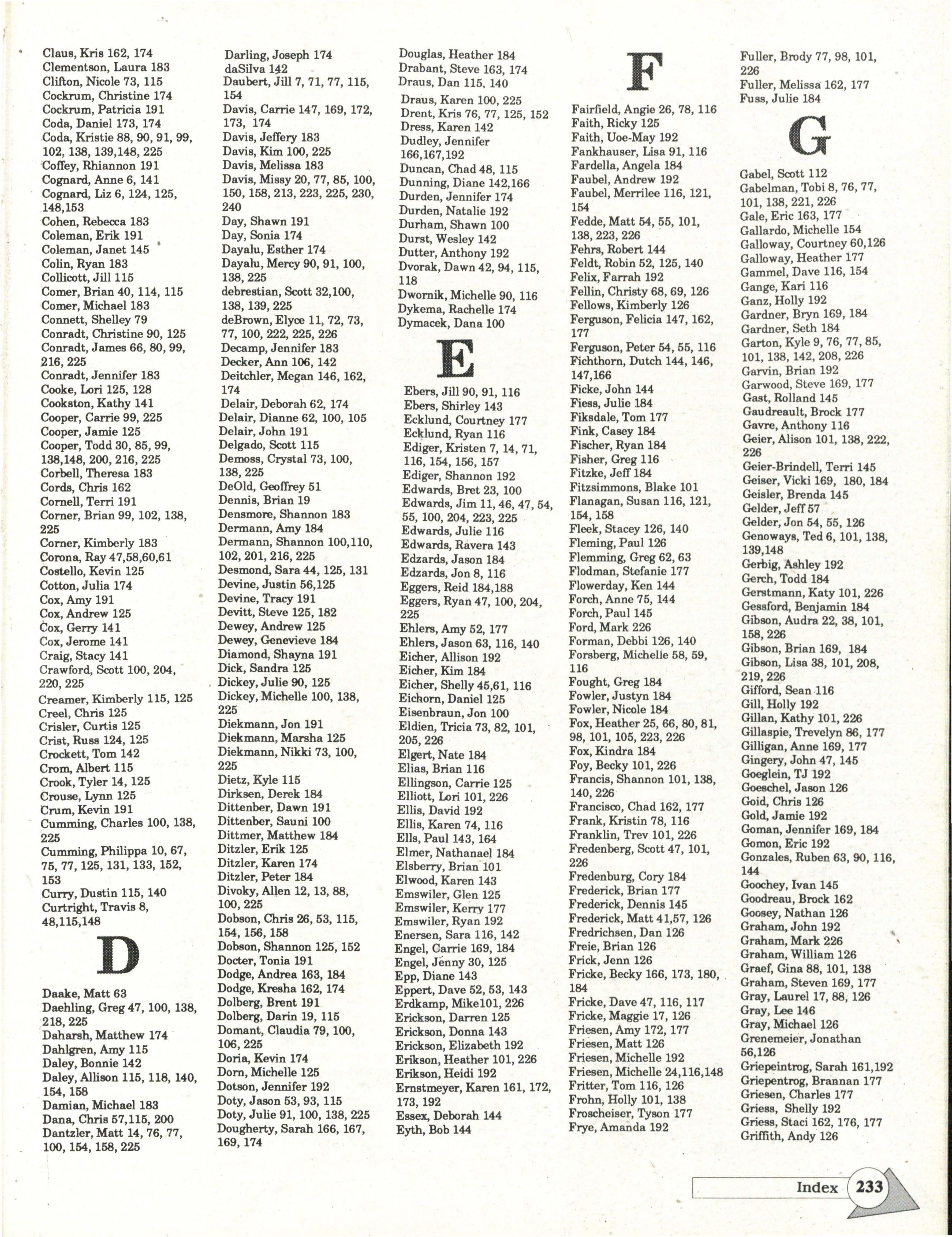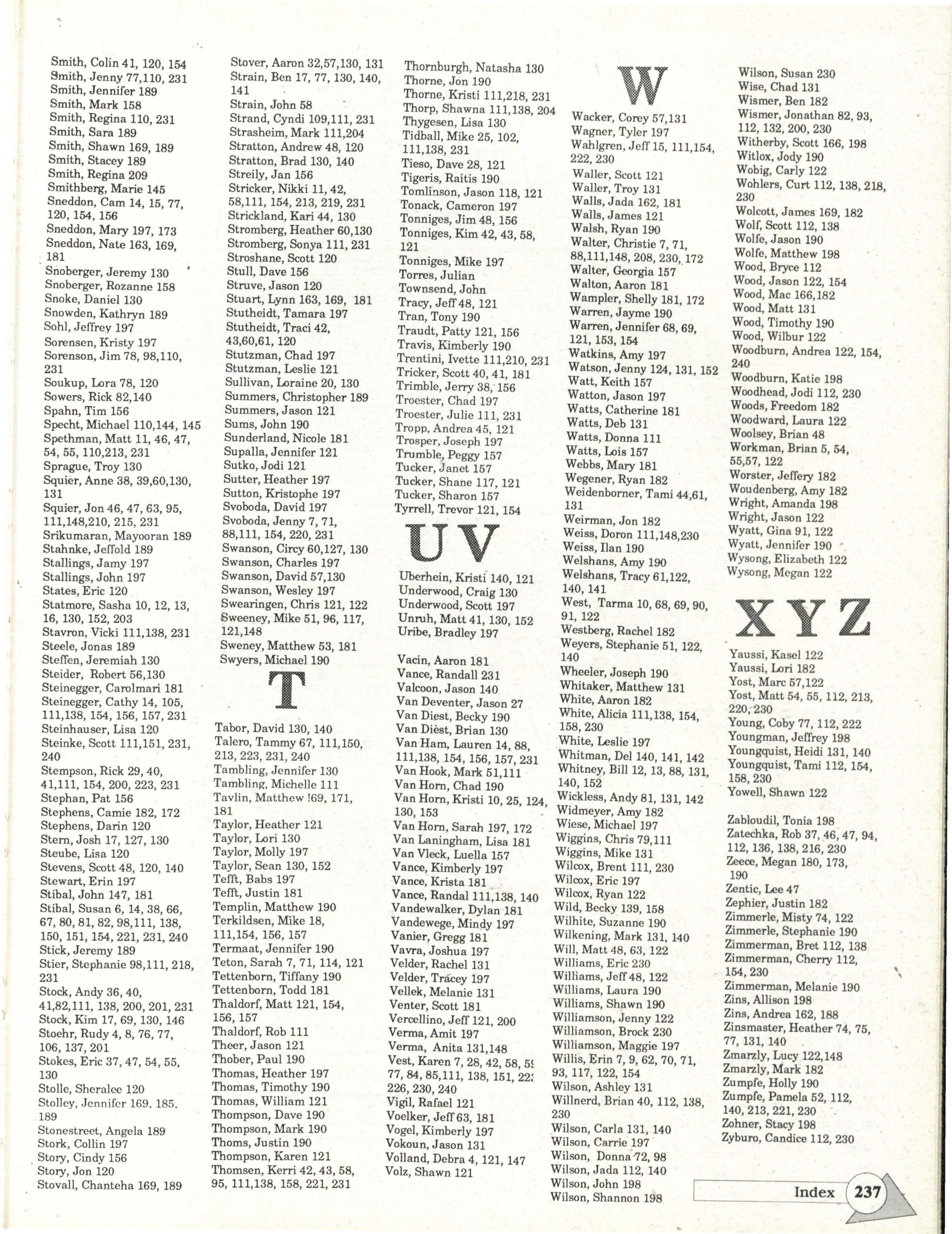 West, Tarma 10, 68, 69 90 91, 122 ' ' Westberg, Rachel 182 Weyers, Stephanie 51 122 140 ' ' Wheeler, Joseph 190 Whitaker, Matthew 131 White, Aaron 182 White, Alicia 111138 154 158,230 ' ' ' White, Leslie 197 Whitman, Del 140, 141, 142 Whitney, Bill 12, 13, 88, 131 140,152 ' Wickless, Andy 81, 131, 142 Widmeyer, Amy 182 Wiese, Michael 197 Wiggins, Chris 79,111 Wiggins, Mike 131 Wilcox, Brent 111,230 Wilcox, Eric 197 Wilcox , Ryan 122 Wild, Becky 139, 158 Wilhite, Suzanne 190 Wilkening, Mark 131, 140 Will, Matt 48, 63, 122 Williams, Eric 230 Willi-ams, Jeff 48, 122 Williams, Laura 190 Williams, Shawn 190 Williamson, Jenny 122 Williamson, Brock 230 Williamson, Maggie 197 Willis, Erin 7, 9, 62, 70, 71, 93,117,122,154 Wilson, Ashley 131 Willnerd, Brian 40, 112, 138, 230