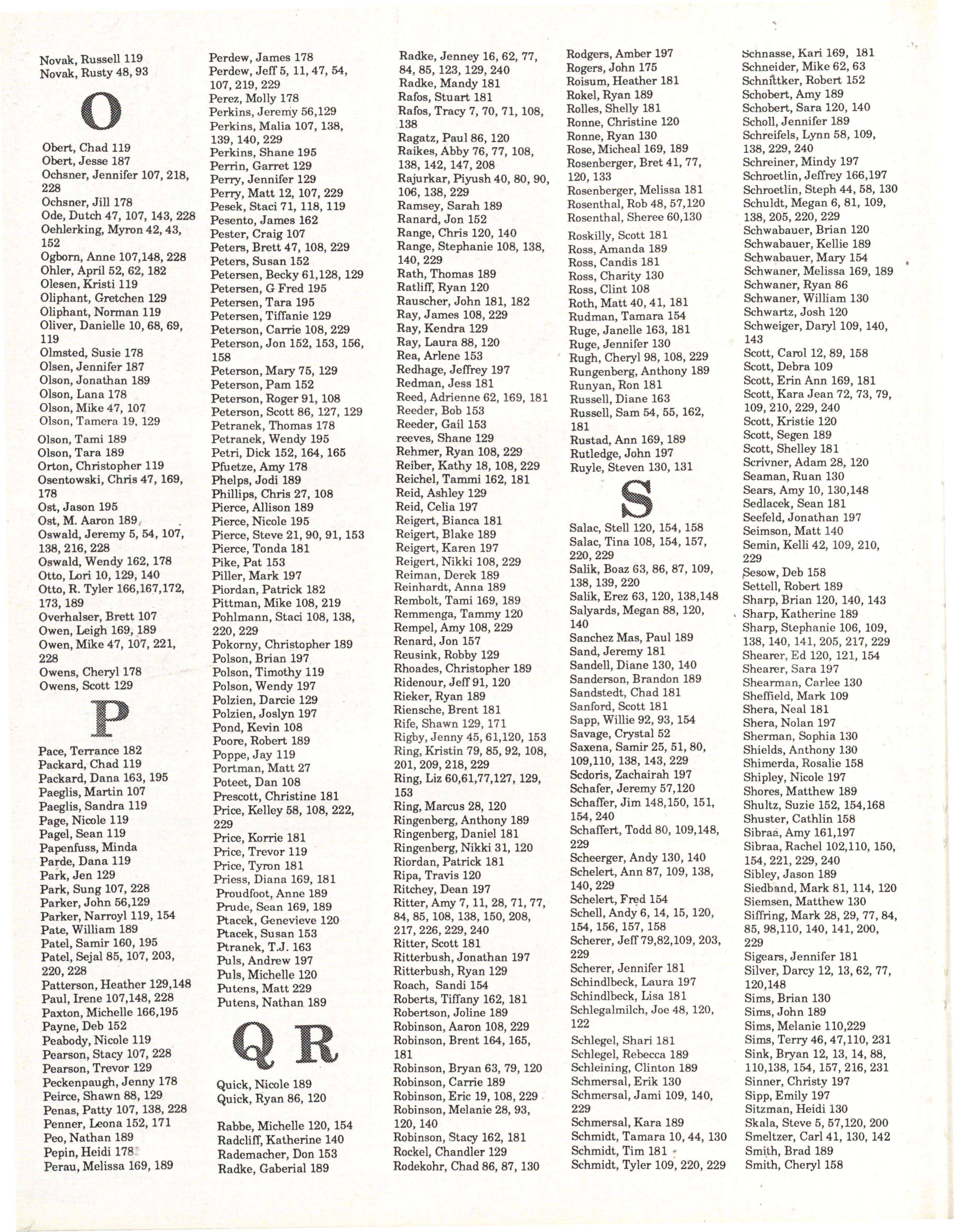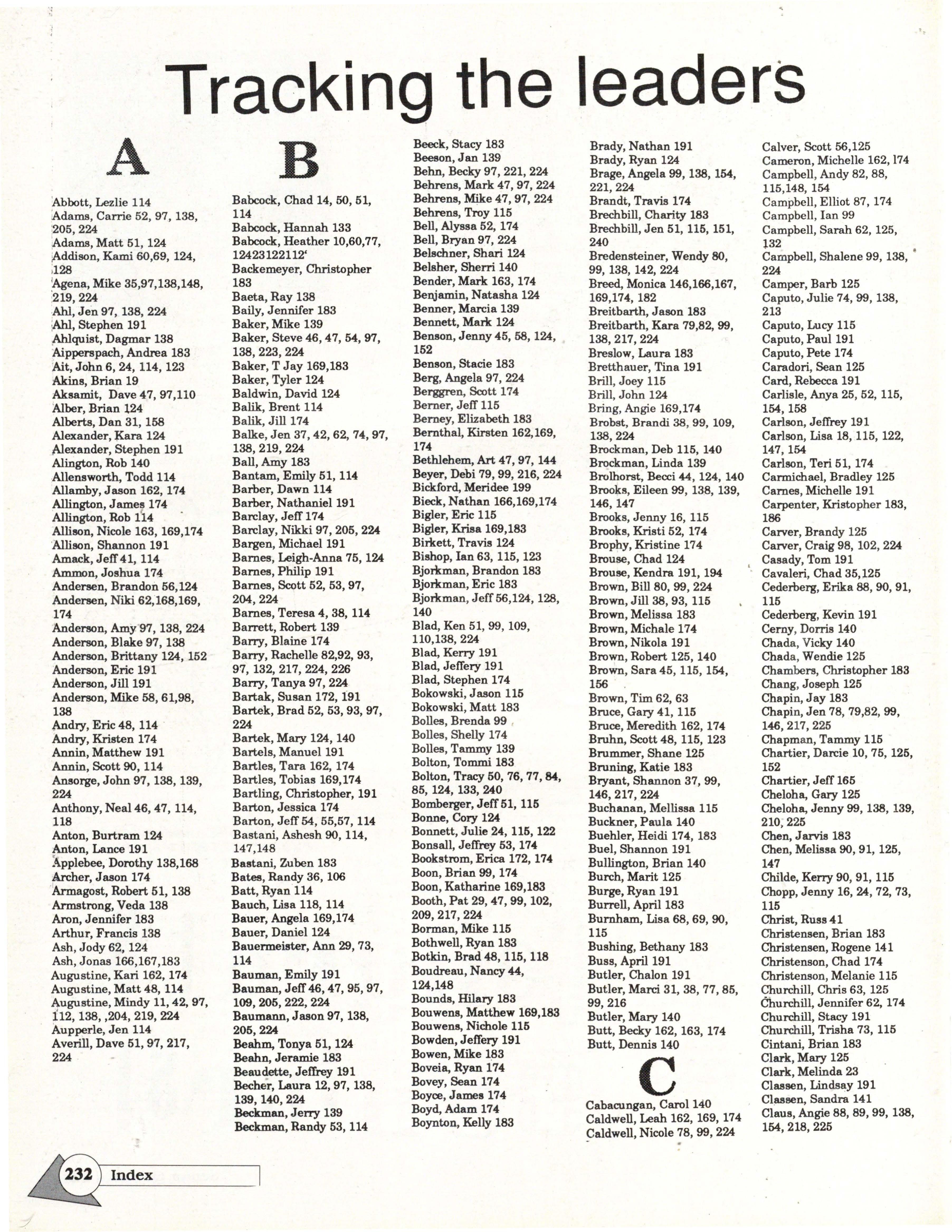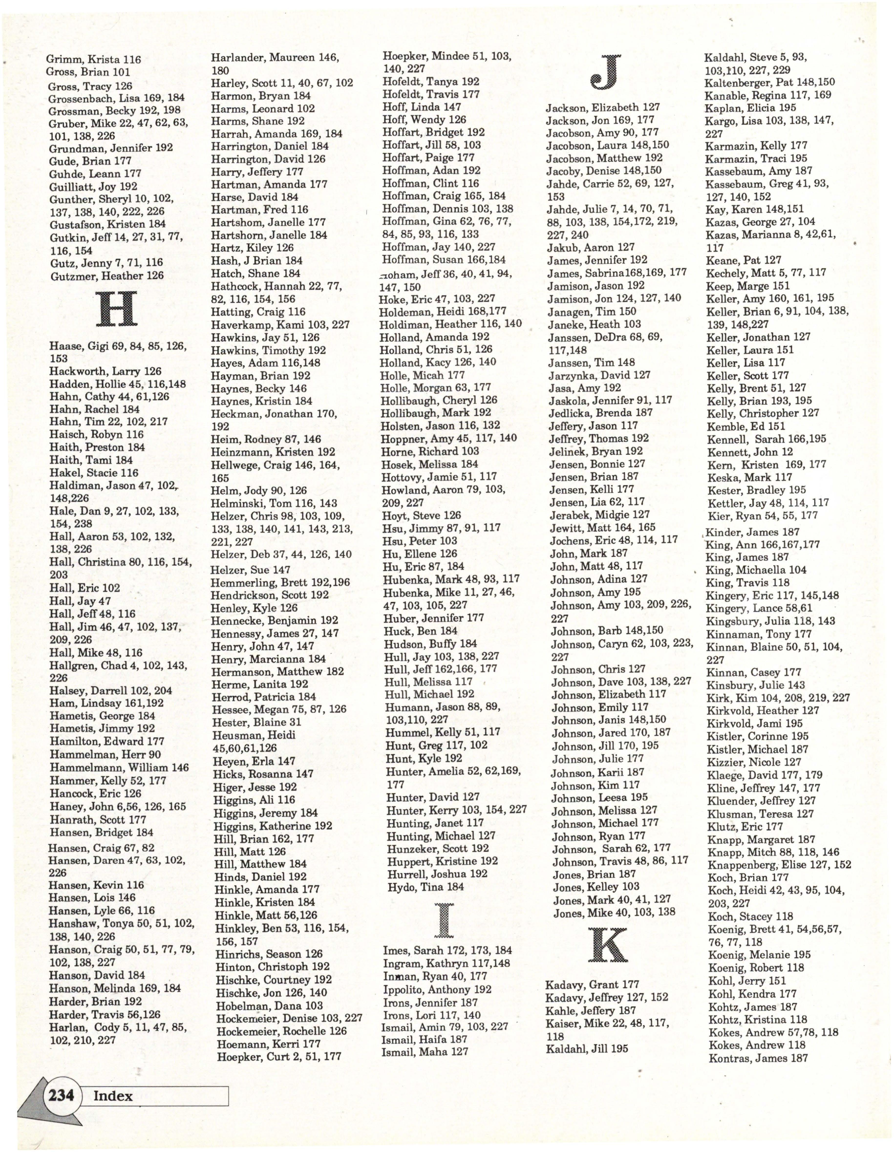 West, Tarma 10, 68, 69 90 91, 122 ' ' Westberg, Rachel 182 Weyers, Stephanie 51 122 140 ' ' Wheeler, Joseph 190 Whitaker, Matthew 131 White, Aaron 182 White, Alicia 111138 154 158,230 ' ' ' White, Leslie 197 Whitman, Del 140, 141, 142 Whitney, Bill 12, 13, 88, 131 140,152 ' Wickless, Andy 81, 131, 142 Widmeyer, Amy 182 Wiese, Michael 197 Wiggins, Chris 79,111 Wiggins, Mike 131 Wilcox, Brent 111,230 Wilcox, Eric 197 Wilcox , Ryan 122 Wild, Becky 139, 158 Wilhite, Suzanne 190 Wilkening, Mark 131, 140 Will, Matt 48, 63, 122 Williams, Eric 230 Willi-ams, Jeff 48, 122 Williams, Laura 190 Williams, Shawn 190 Williamson, Jenny 122 Williamson, Brock 230 Williamson, Maggie 197 Willis, Erin 7, 9, 62, 70, 71, 93,117,122,154 Wilson, Ashley 131 Willnerd, Brian 40, 112, 138, 230