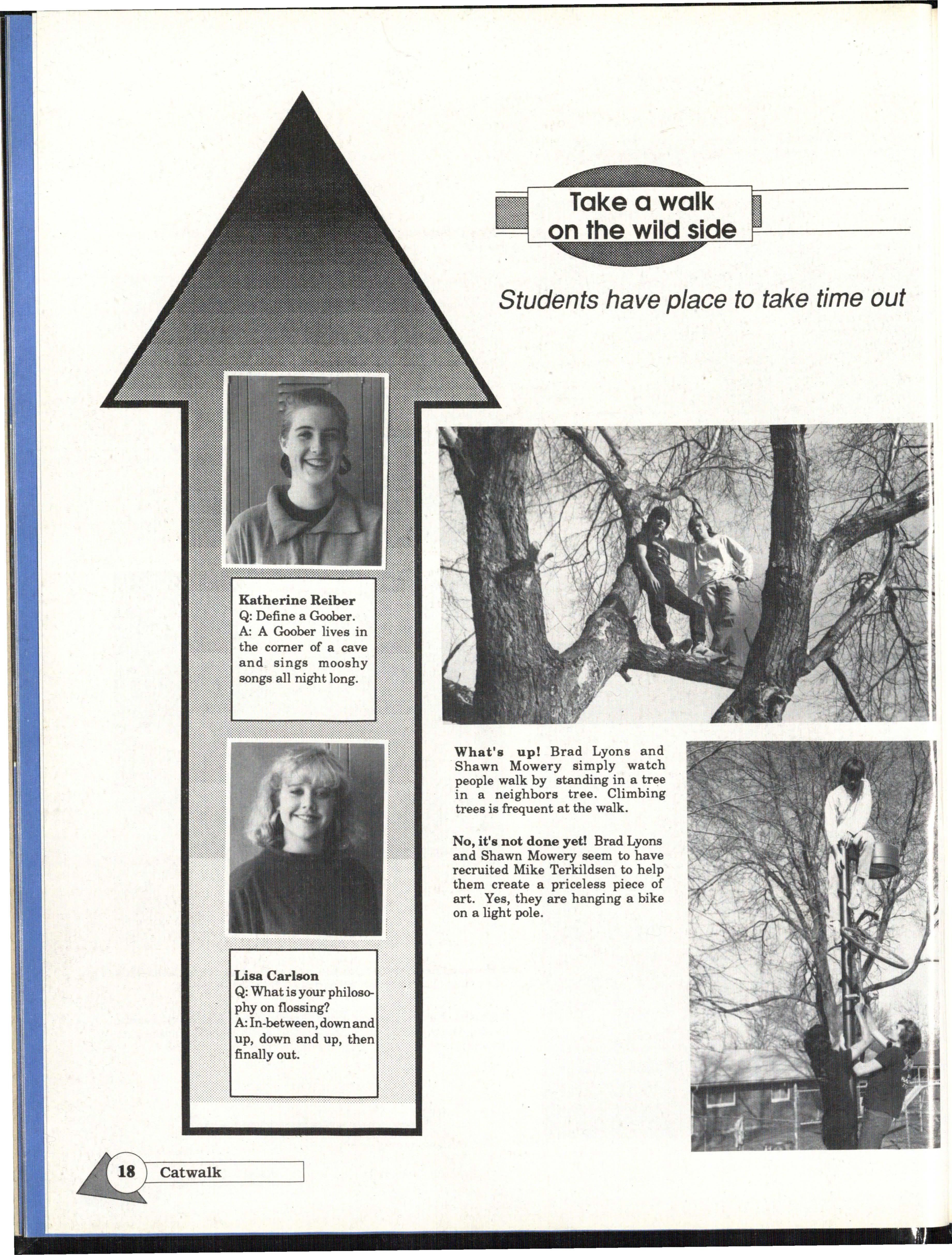 IIWhat's up! Brad Lyons and Shawn Mowery simply watch people walk by standing in a tree in a neighbors tree. Climbing trees is frequent at the walk.