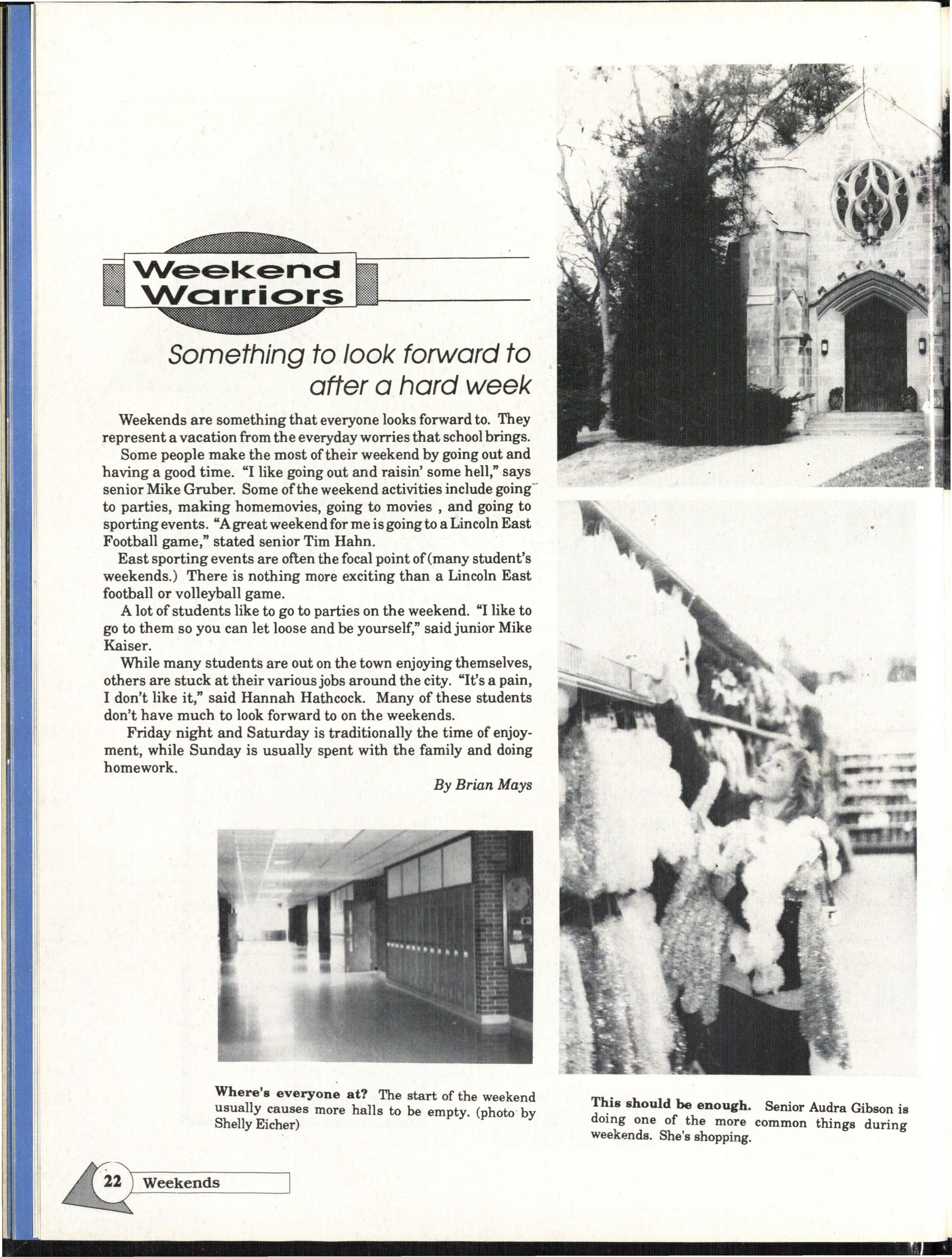 Some people make the most of their weekend by going out and having a good time. "I like going out and raisin' some hell," says senior Mike Gruber. Some of the weekend activities include goingto parties, making homemovies, going to movies , and going to sporting events. "A great weekend for me is going to a Lincoln East Football game," stated senior Tim Hahn.
