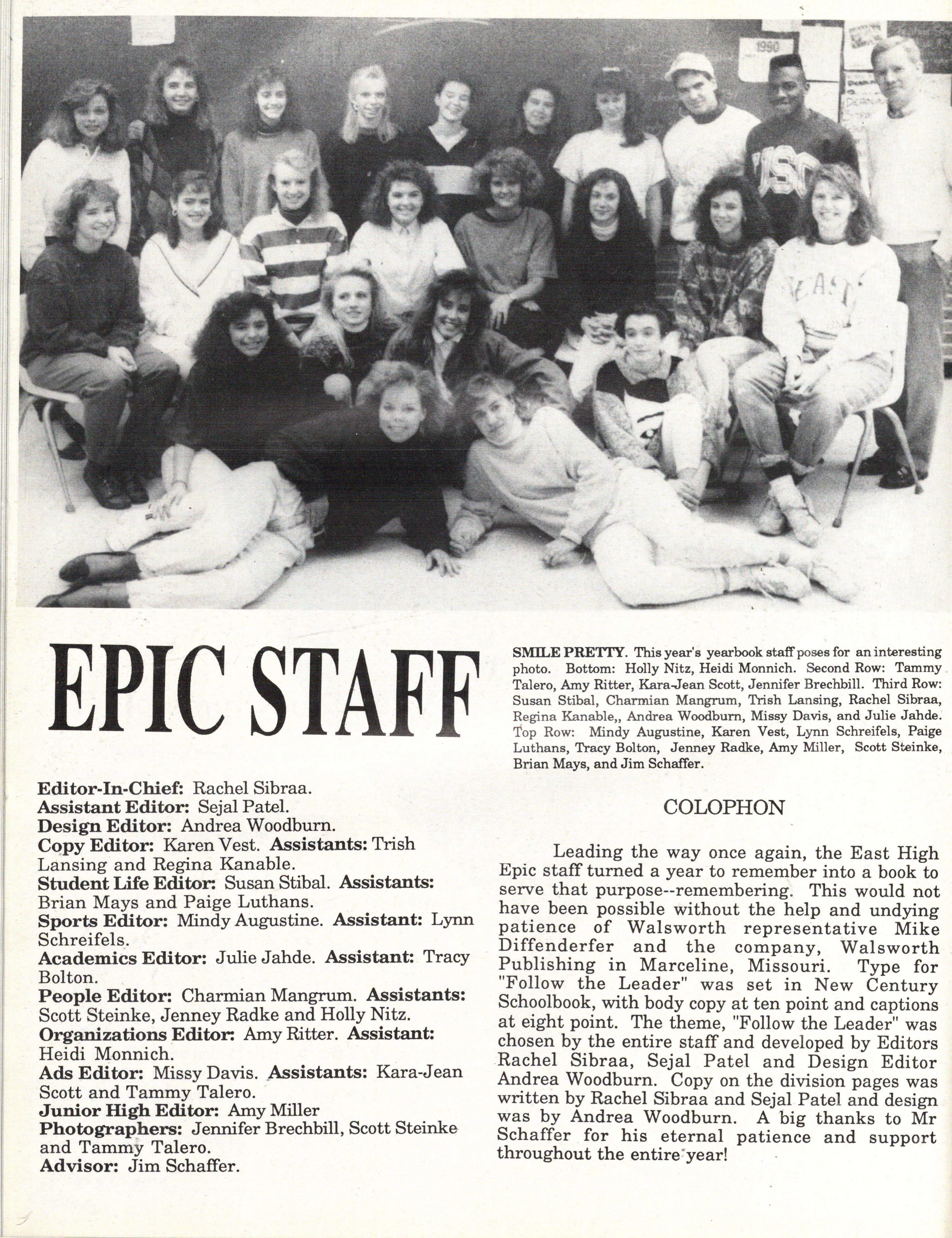Leading the way once again, the East High Epic staff turned a year to remember into a book to serve that purpose--remembering. This would not have been possible without the help and undying patience of Walsworth representative Mike Diffenderfer and the company, Walsworth Publishing in Marceline, Missouri. Type for "Follow the Leader" was set in New Century Schoolbook, with body copy at ten point and captions at eight point. The theme, "Follow the Leader" was chosen by the entire staff and developed by Editors .Rachel Sibraa, Sejal Patel and Design Editor Andrea Woodburn. Copy on the division pages was written by Rachel Sibraa and Sejal Patel and design was by Andrea Woodburn. A big thanks to Mr Schaffer . for his eternal patience and support throughout the entire ·year!